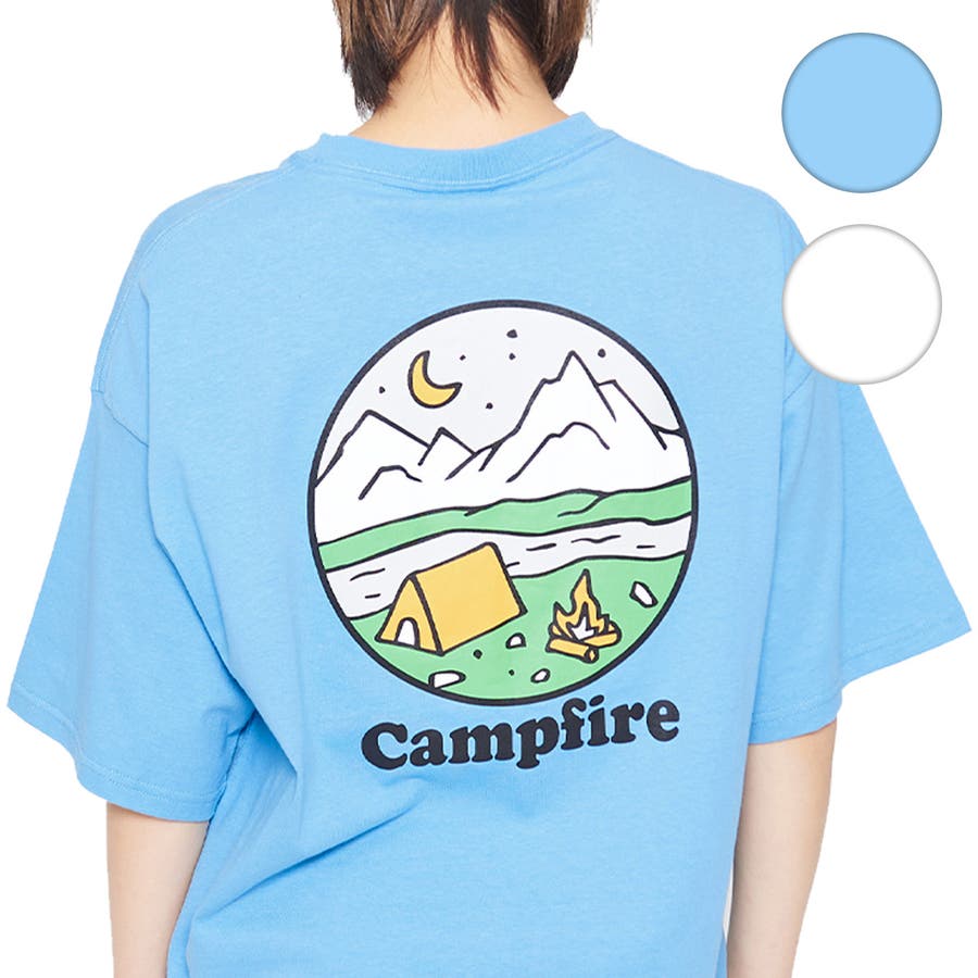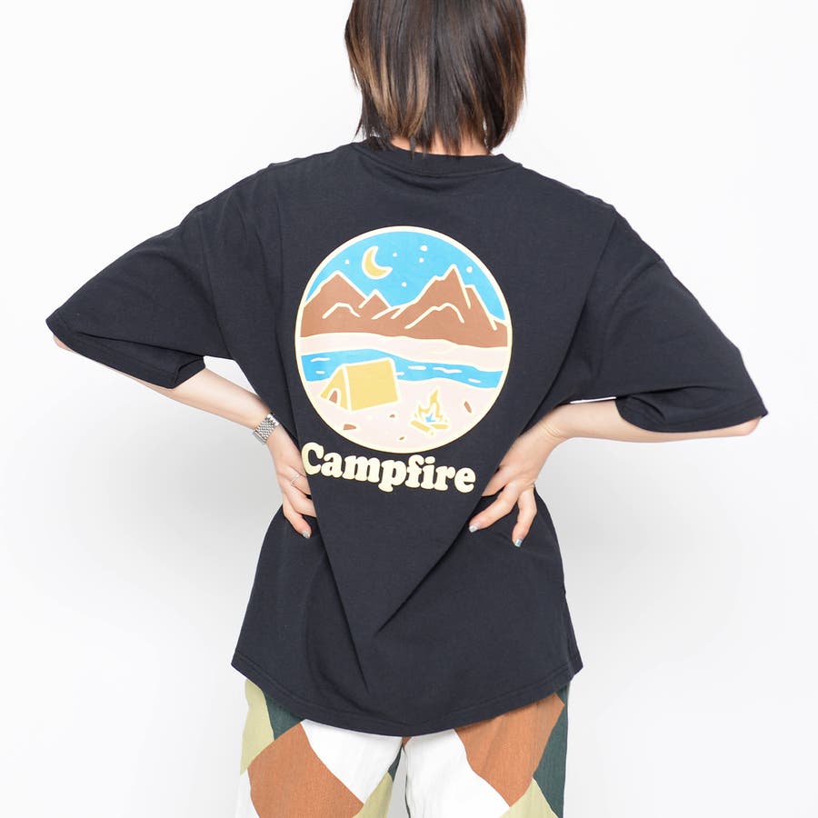 フロントデザインはシンプルに、バックデザインは円の中にキャンプファイヤーがポップに描かれた他では見ないデザイン!!。