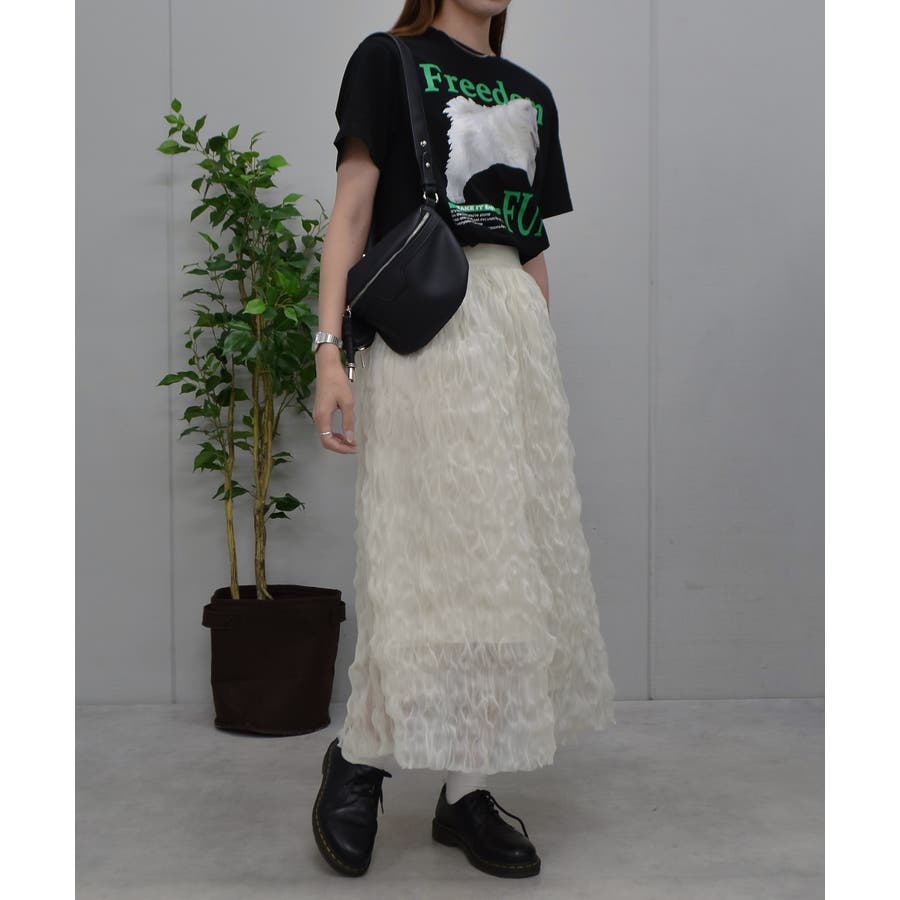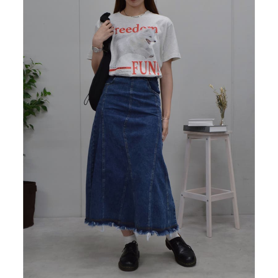デニムやカーゴパンツなどのボトムも勿論のこと、スカートでガーリーに着こなすのも◎。