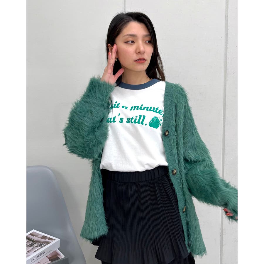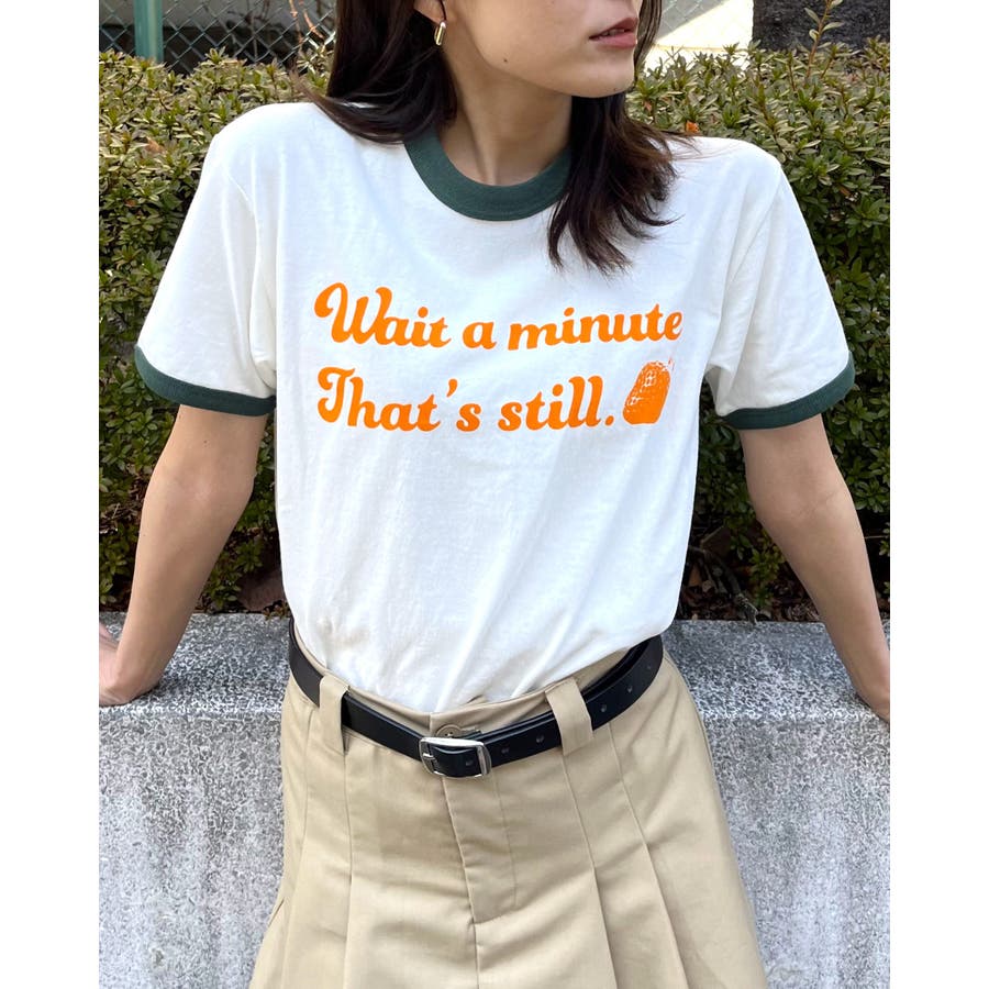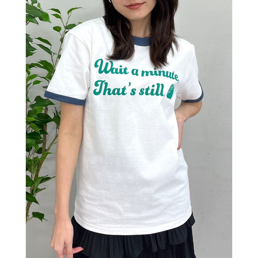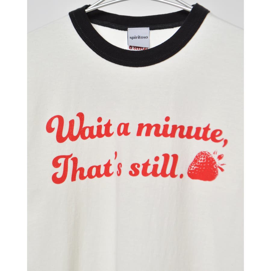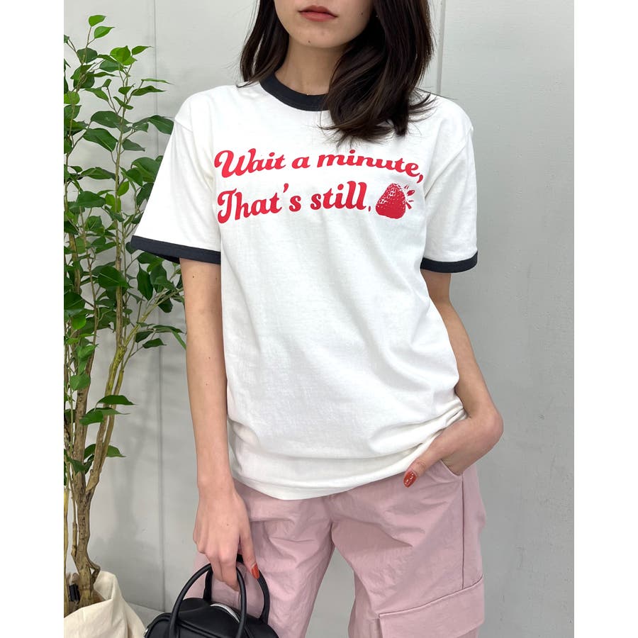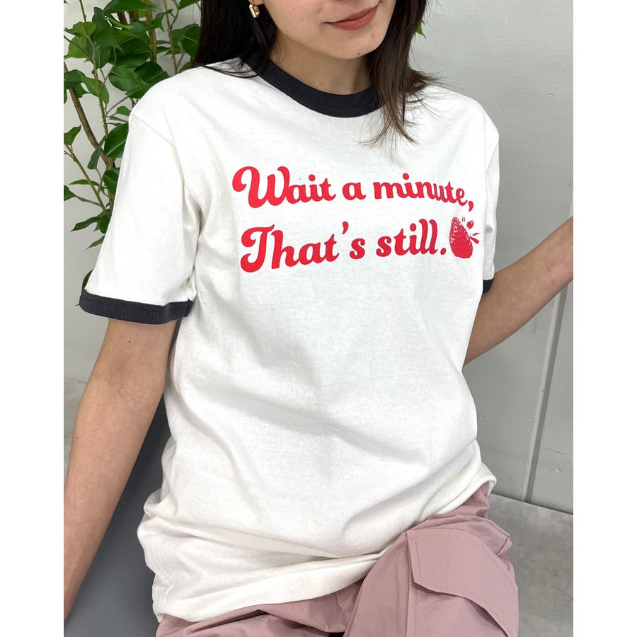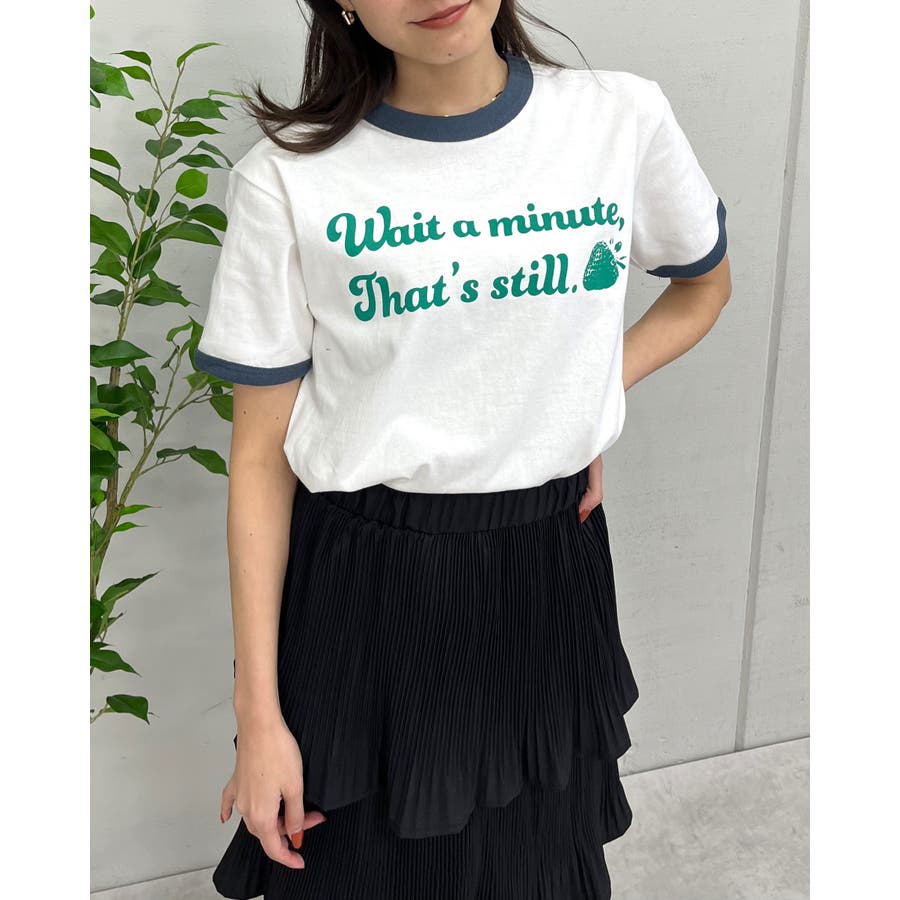 【グリーン】WAIT A MINUTEイチゴプリント リンガーTシャツ