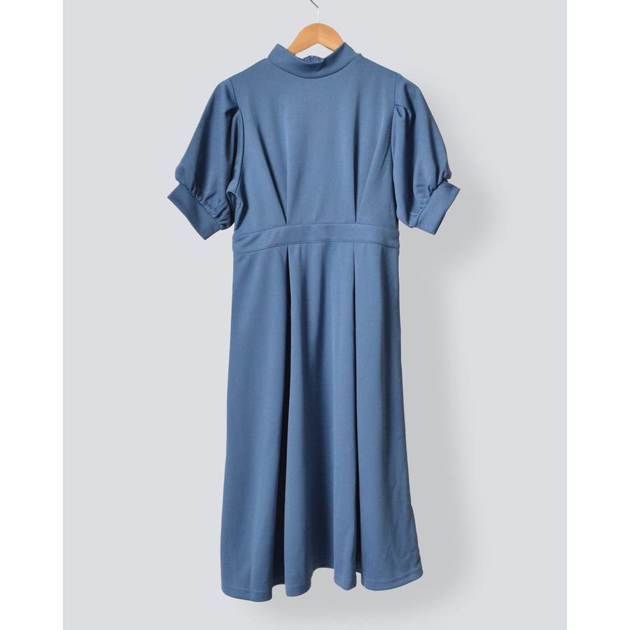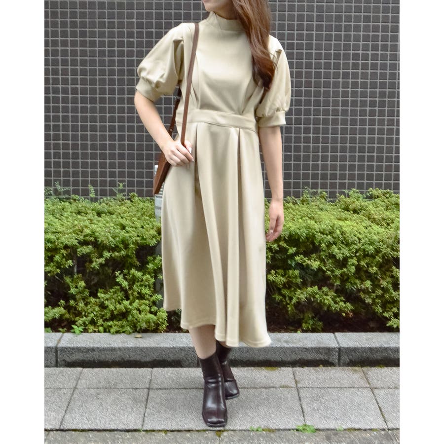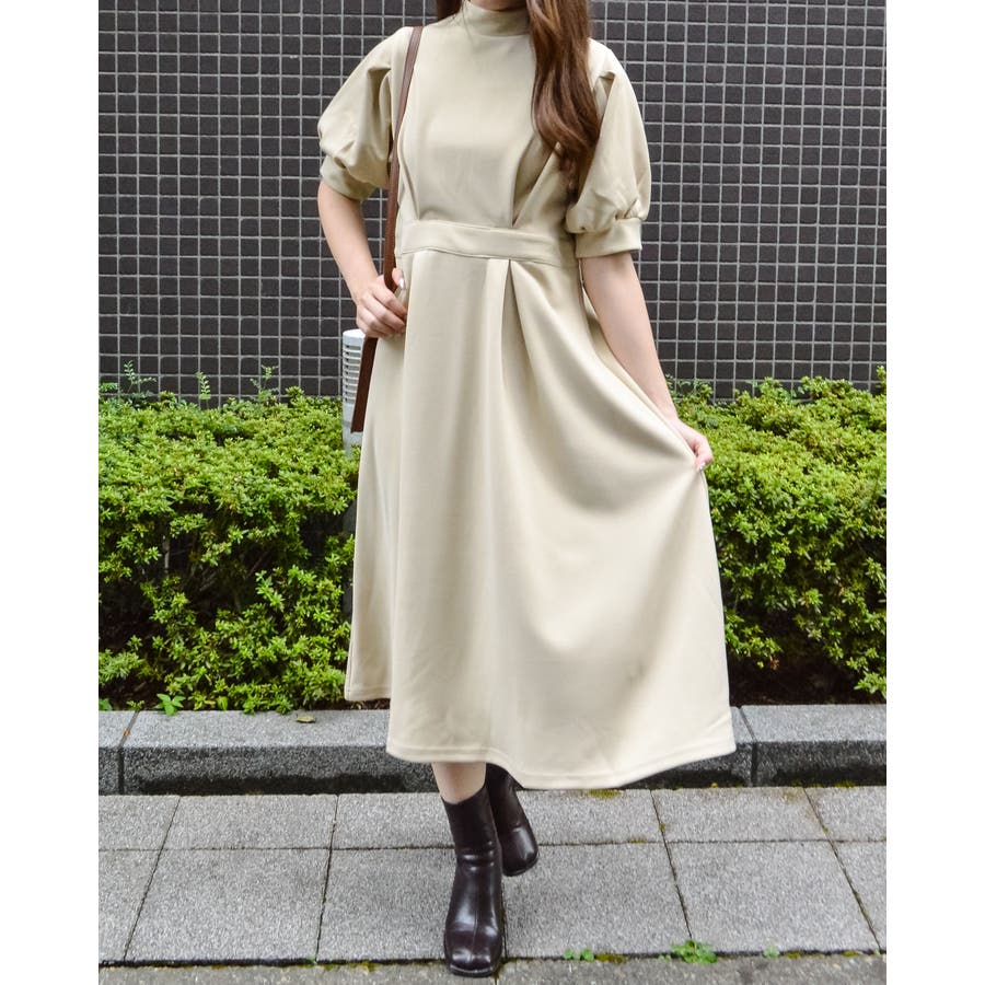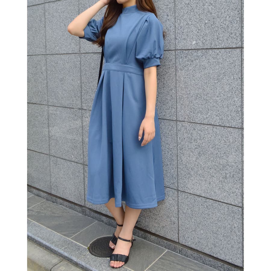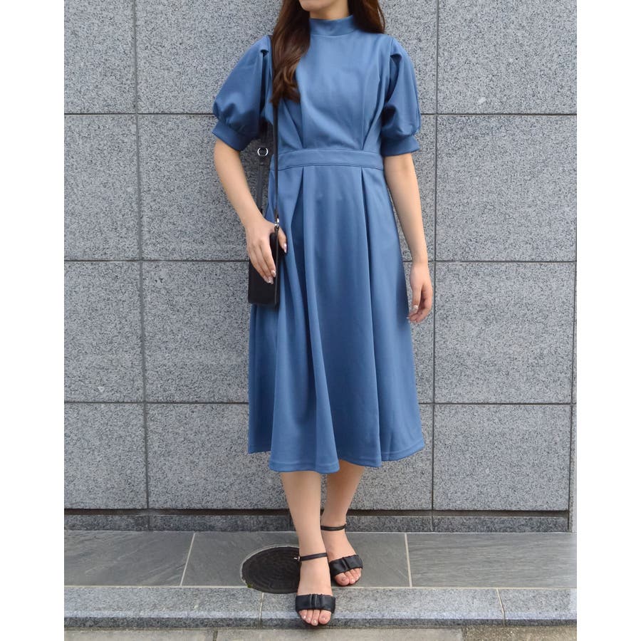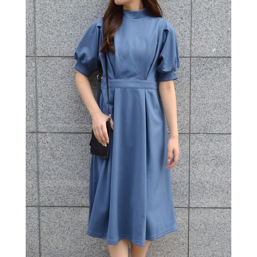 ワンピース 無地 大人 きれいめ 青 ベージュ 半袖 パフスリーブ ウエストタック デート 上品 半袖ワンピース カフェ 大人カジュアル ミドル丈