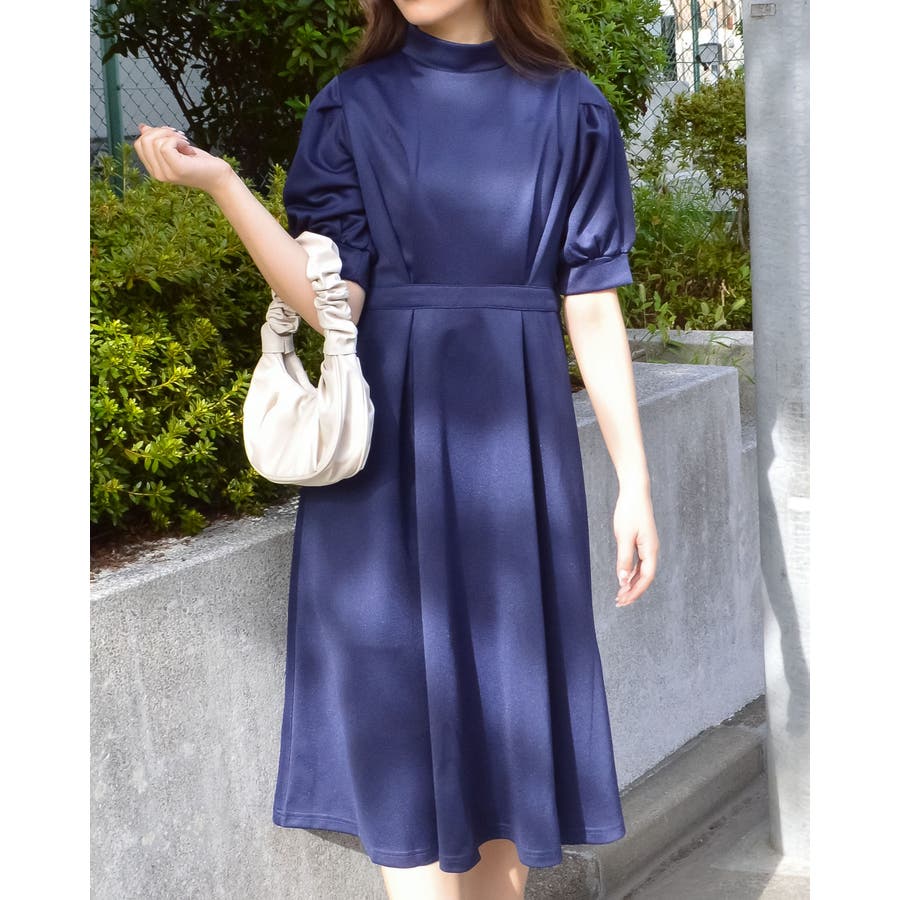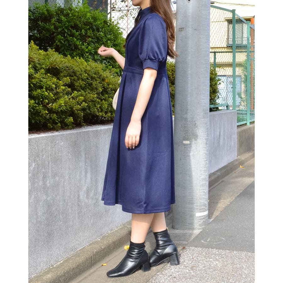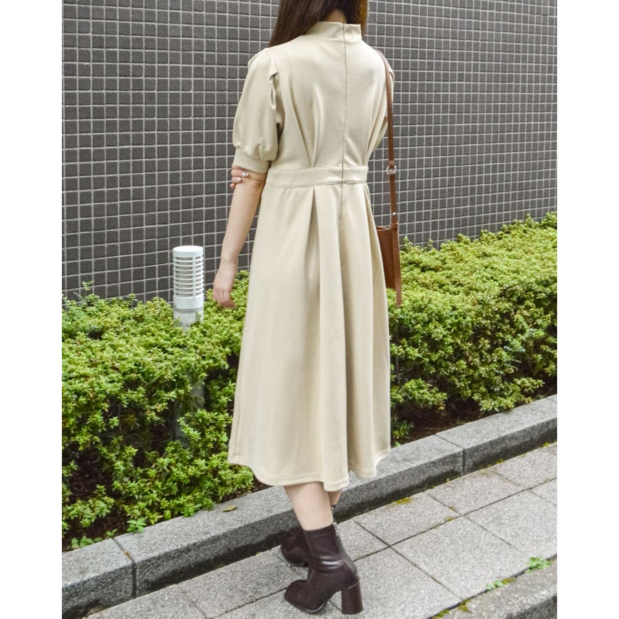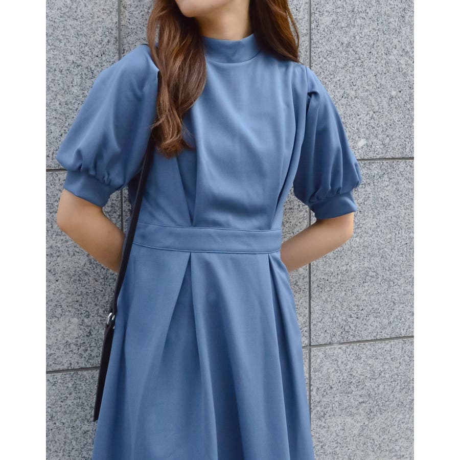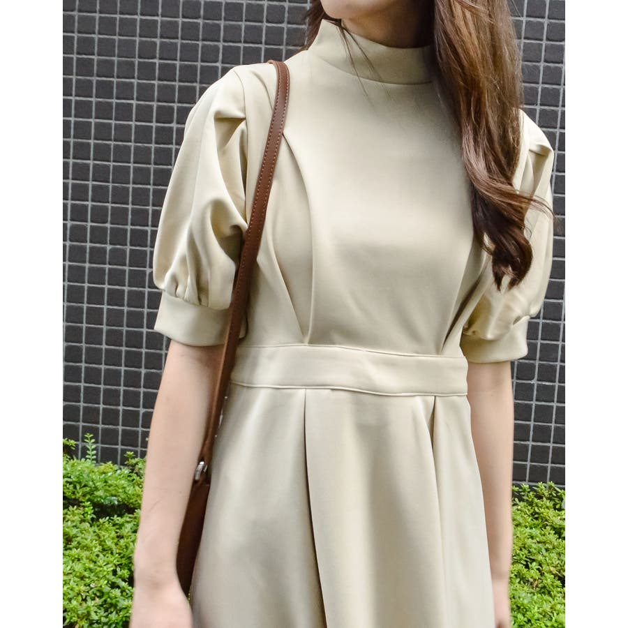 ワンピース 無地 大人 きれいめ 青 ベージュ 半袖 パフスリーブ ウエストタック デート 上品 半袖ワンピース カフェ 大人カジュアル ミドル丈