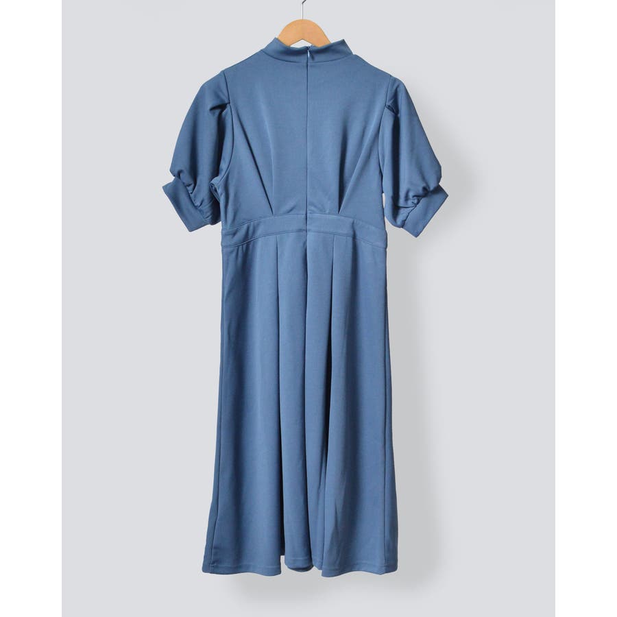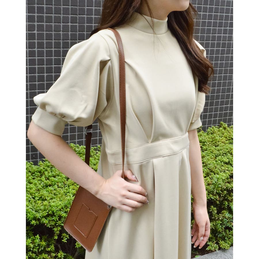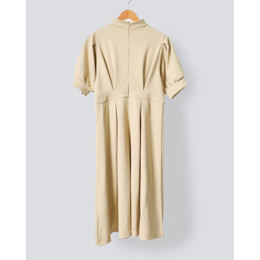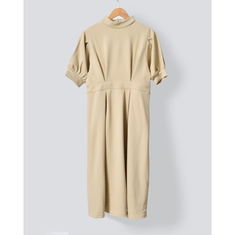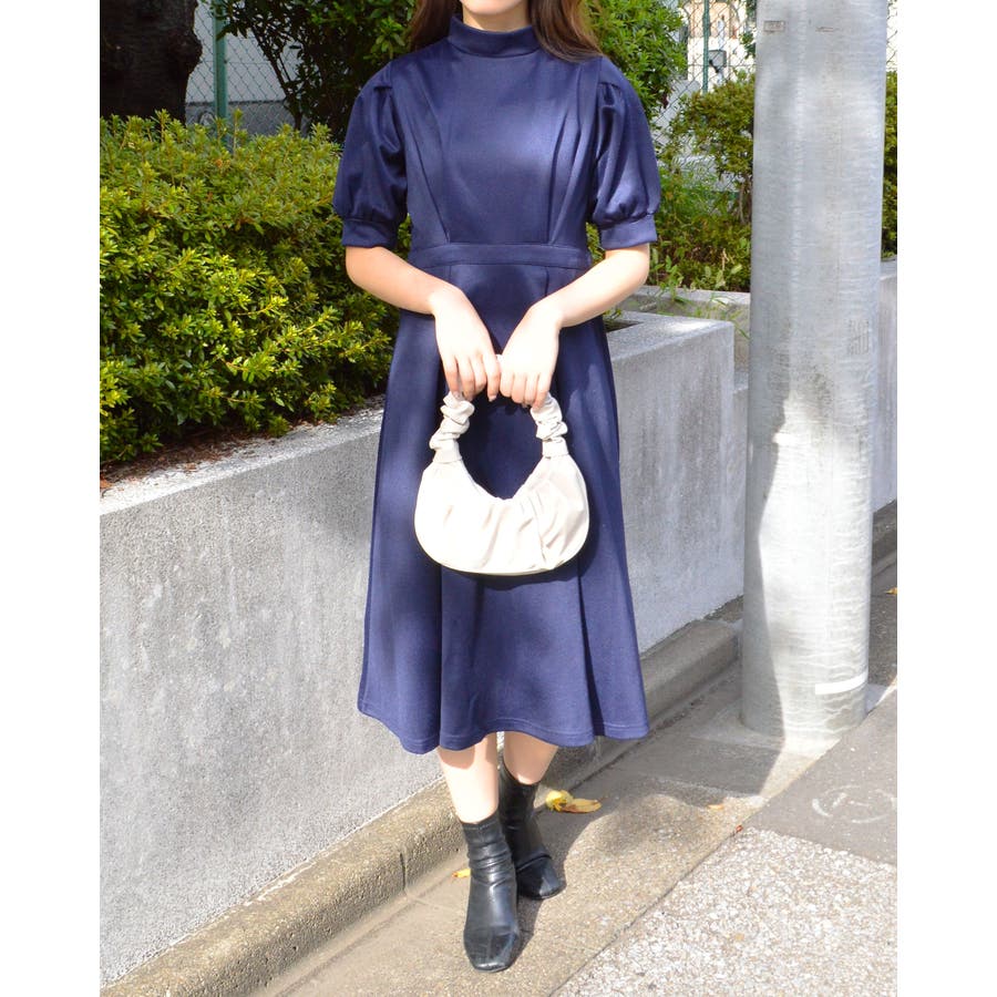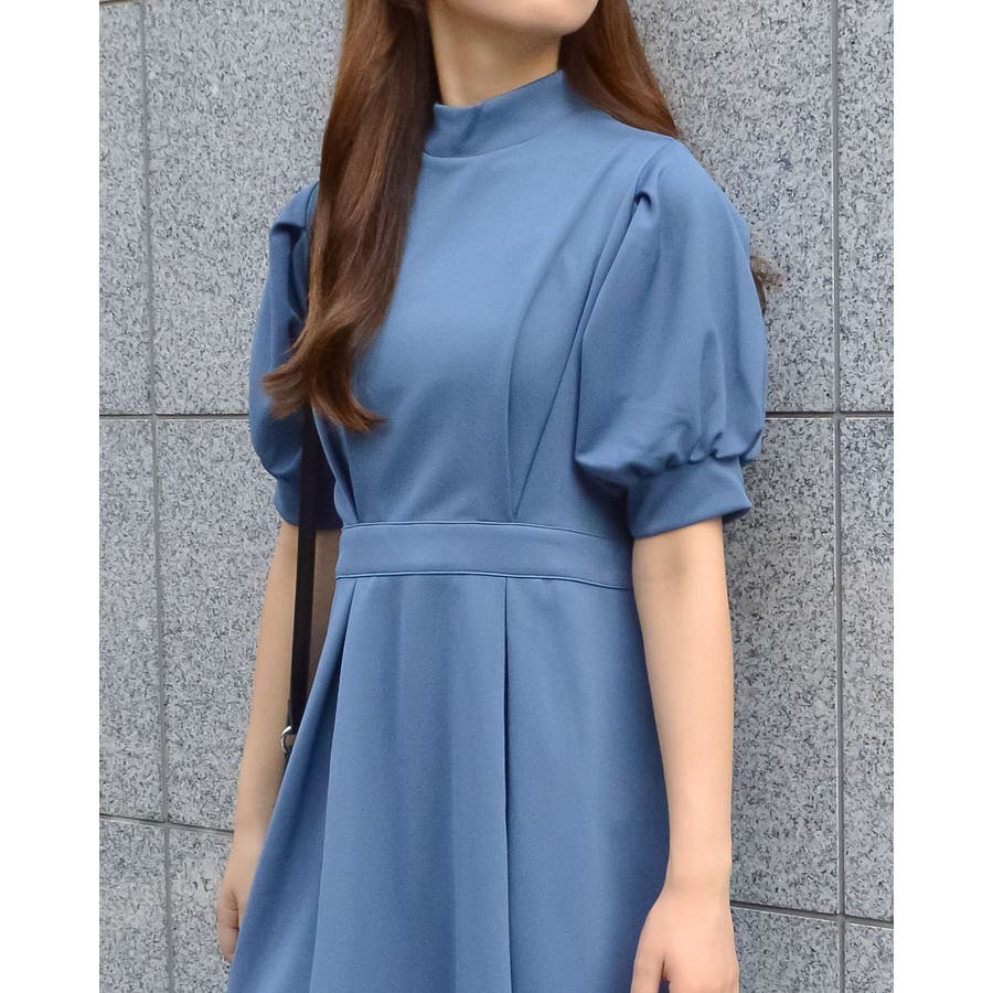 ワンピース 無地 大人 きれいめ 青 ベージュ 半袖 パフスリーブ ウエストタック デート 上品 半袖ワンピース カフェ 大人カジュアル ミドル丈