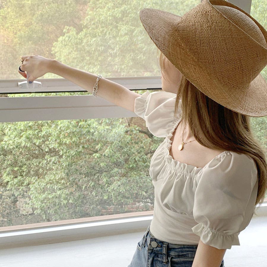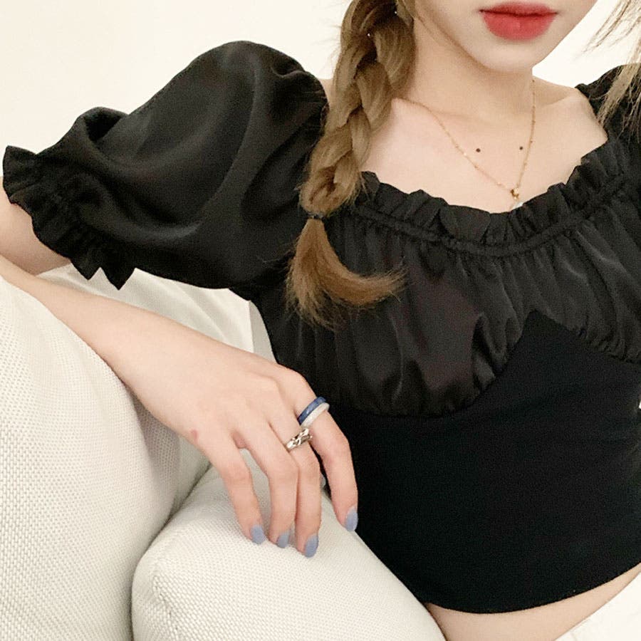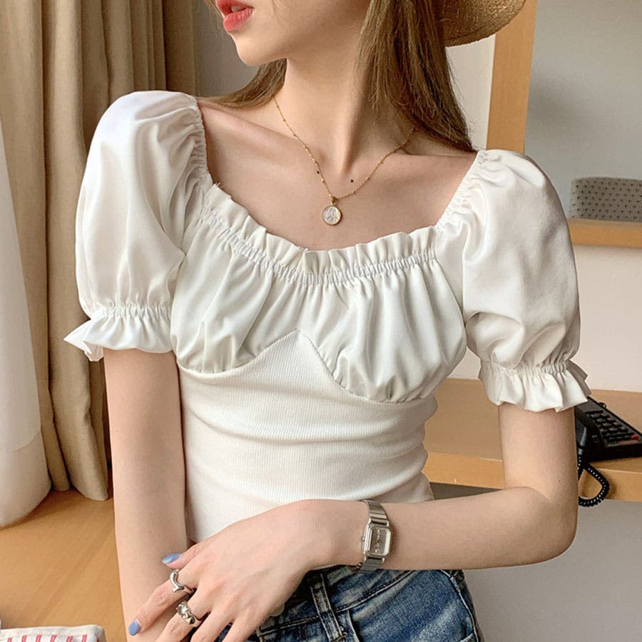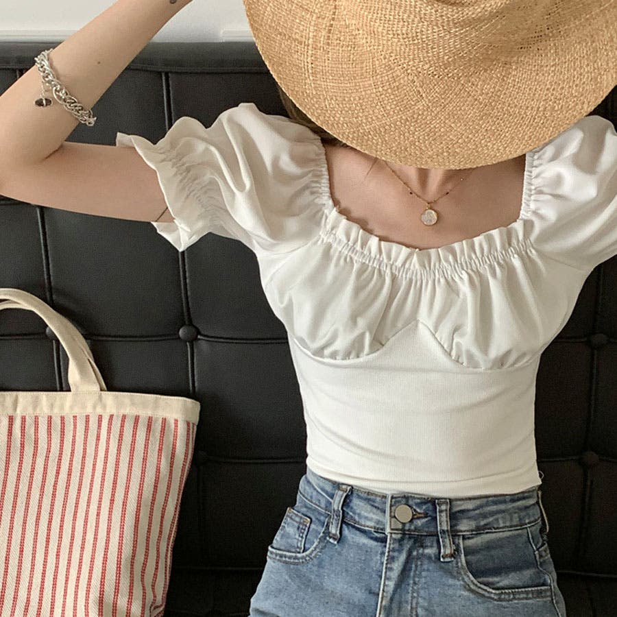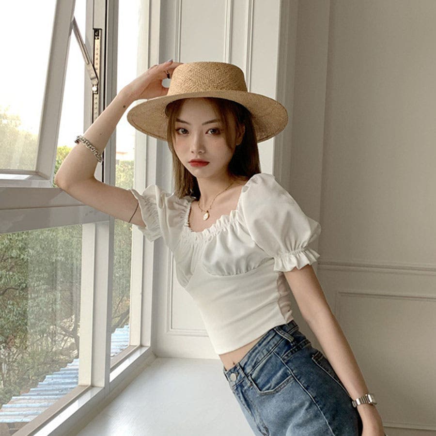 韓国ファッションギャザーパフスリーブクロップドトップス夏服セクシー