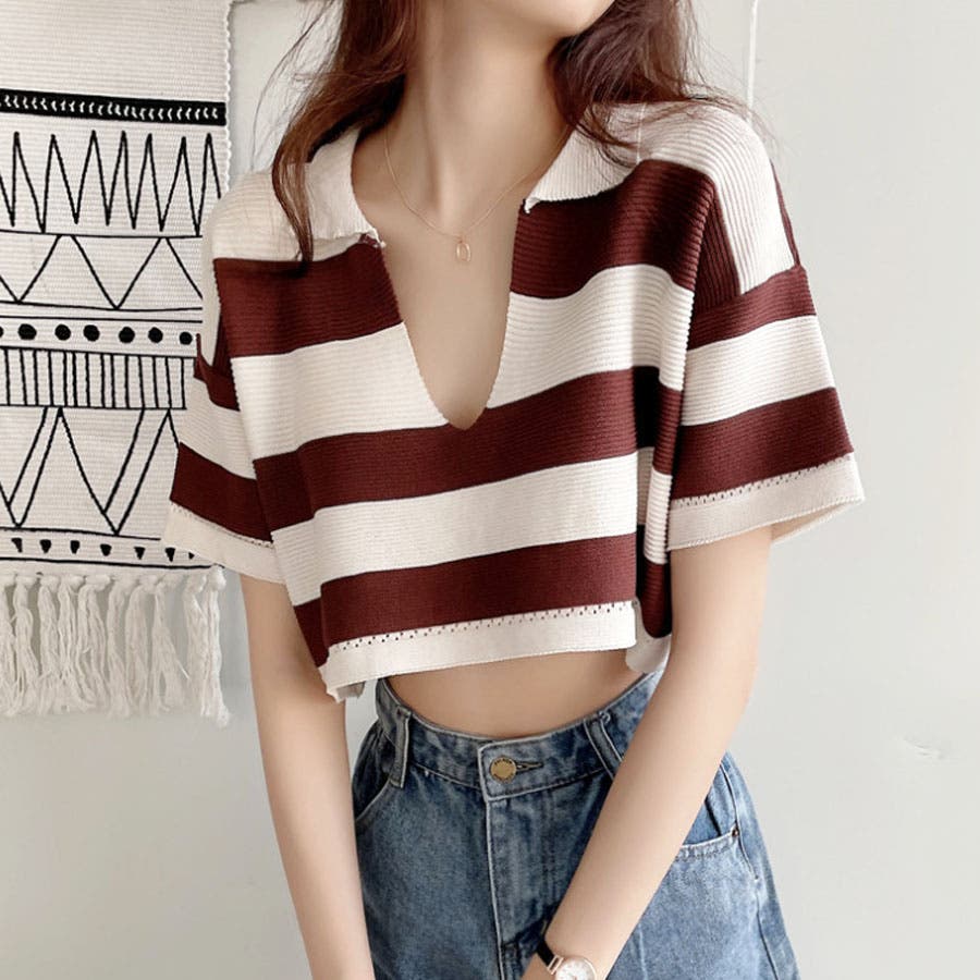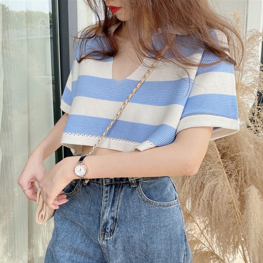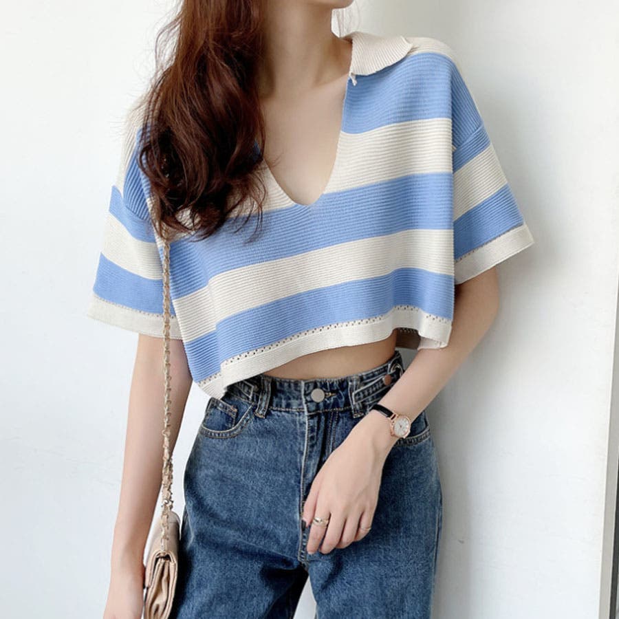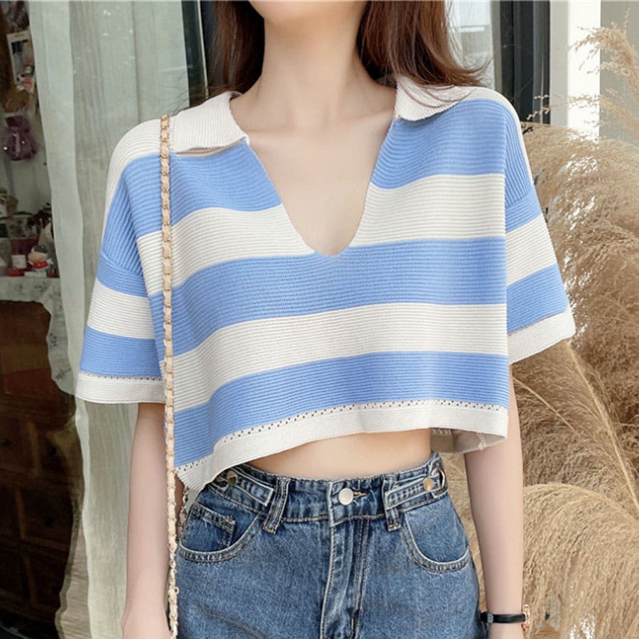 【ブルー】韓国ファッションボーダークロップドポロシャツ 韓国 トップス