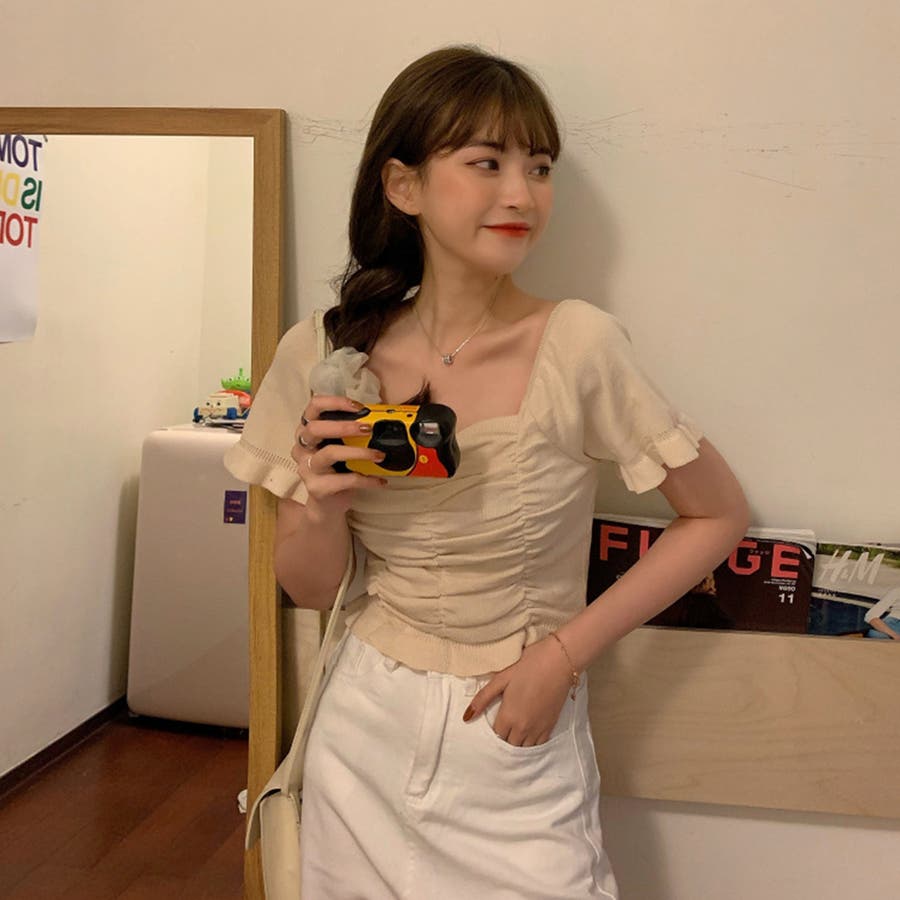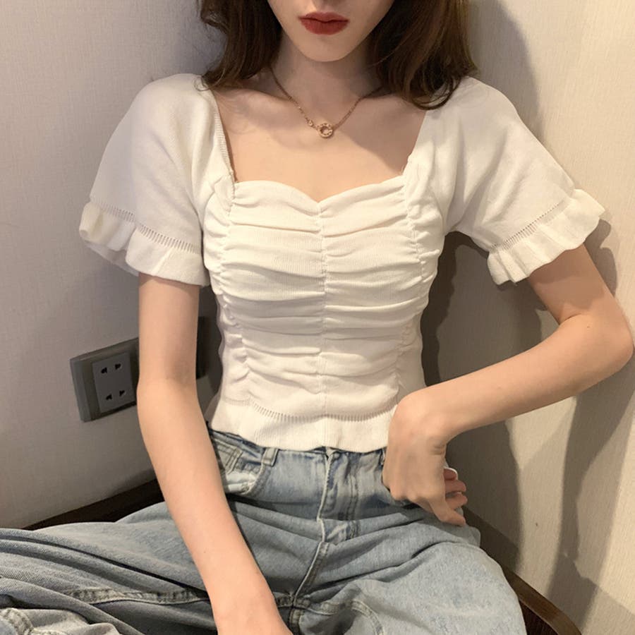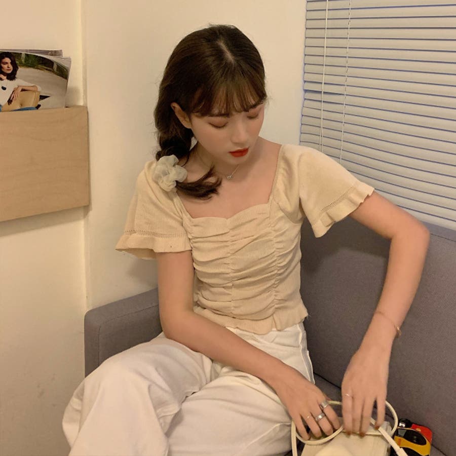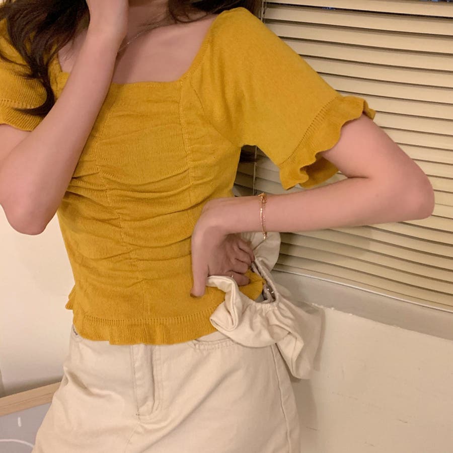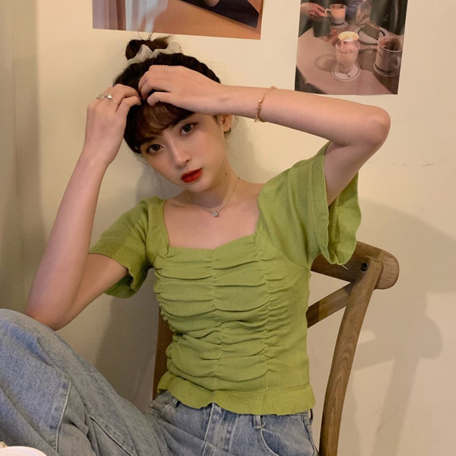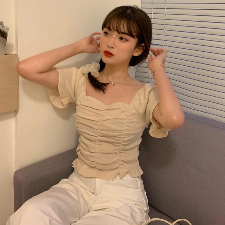 韓国ファッション 韓国かわいい 服 韓国 トップス 夏 韓国 通販 韓国トップス トップス トップス春 トップス韓国 夏トップス トップス半袖 トップス ショート丈トップス ギャザートップス 韓国ギャザーサマーニット スクエアネックトップス スクエアネックニットトップス ギャザーニットトップス 半袖 セクシー 胸元 セクシー へそ出し