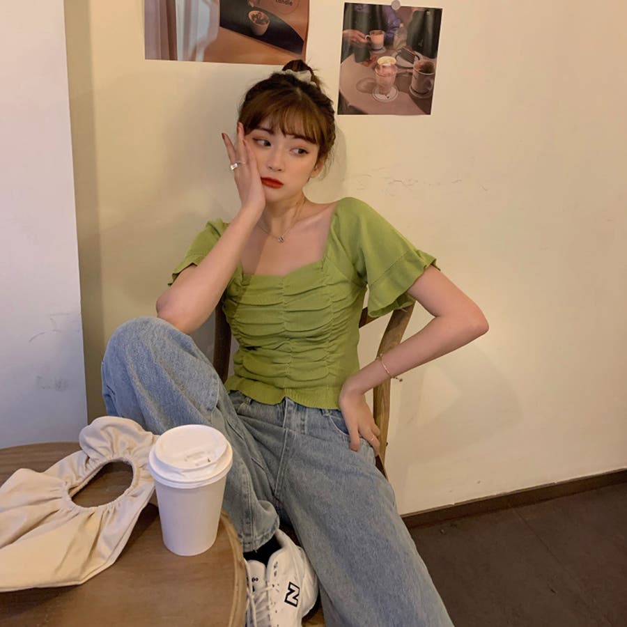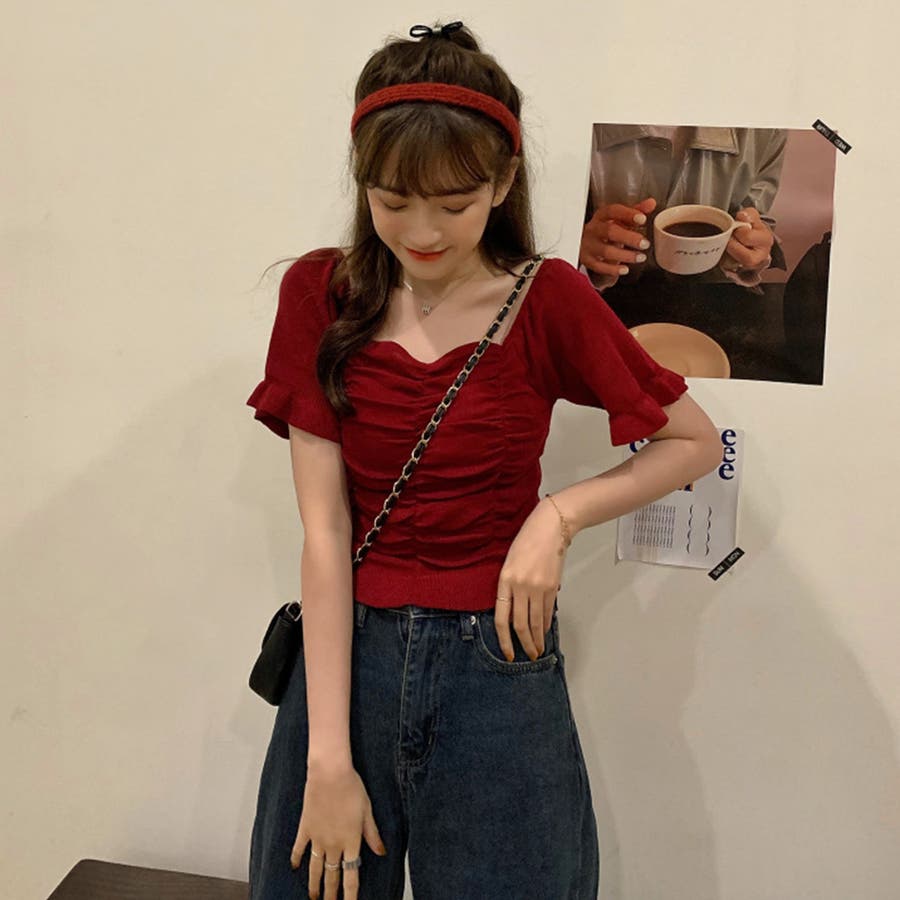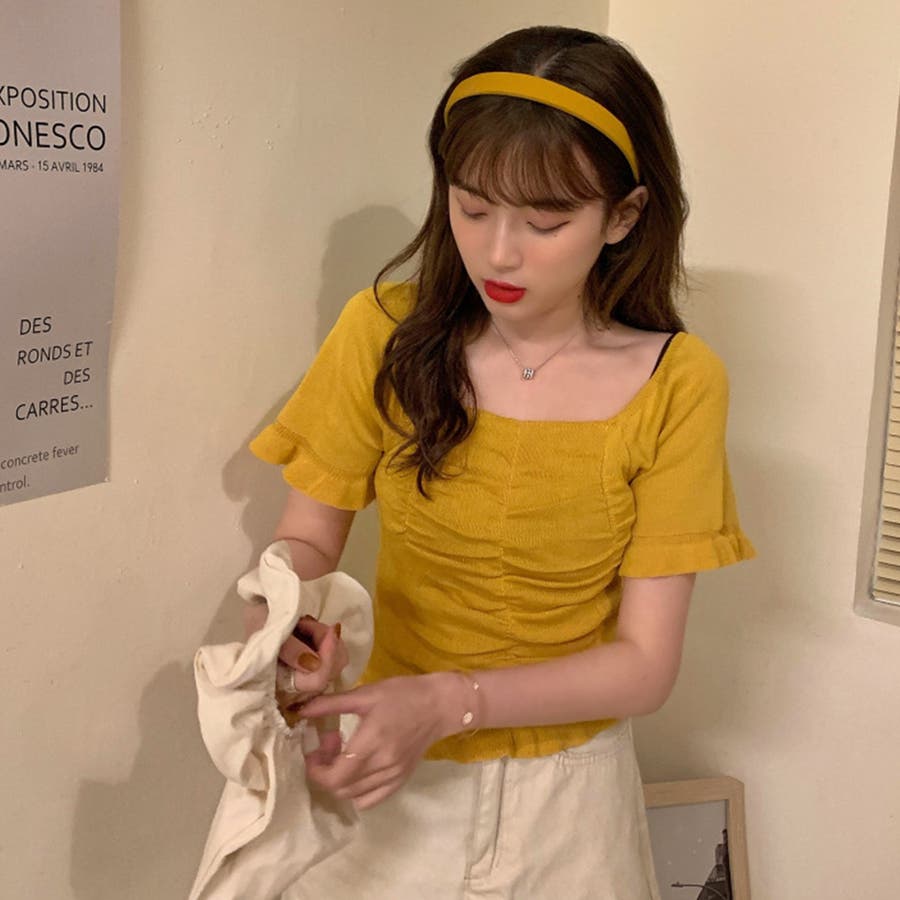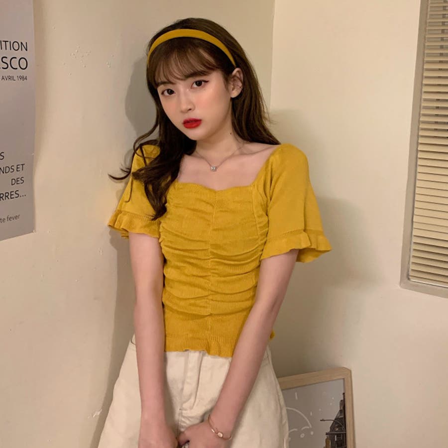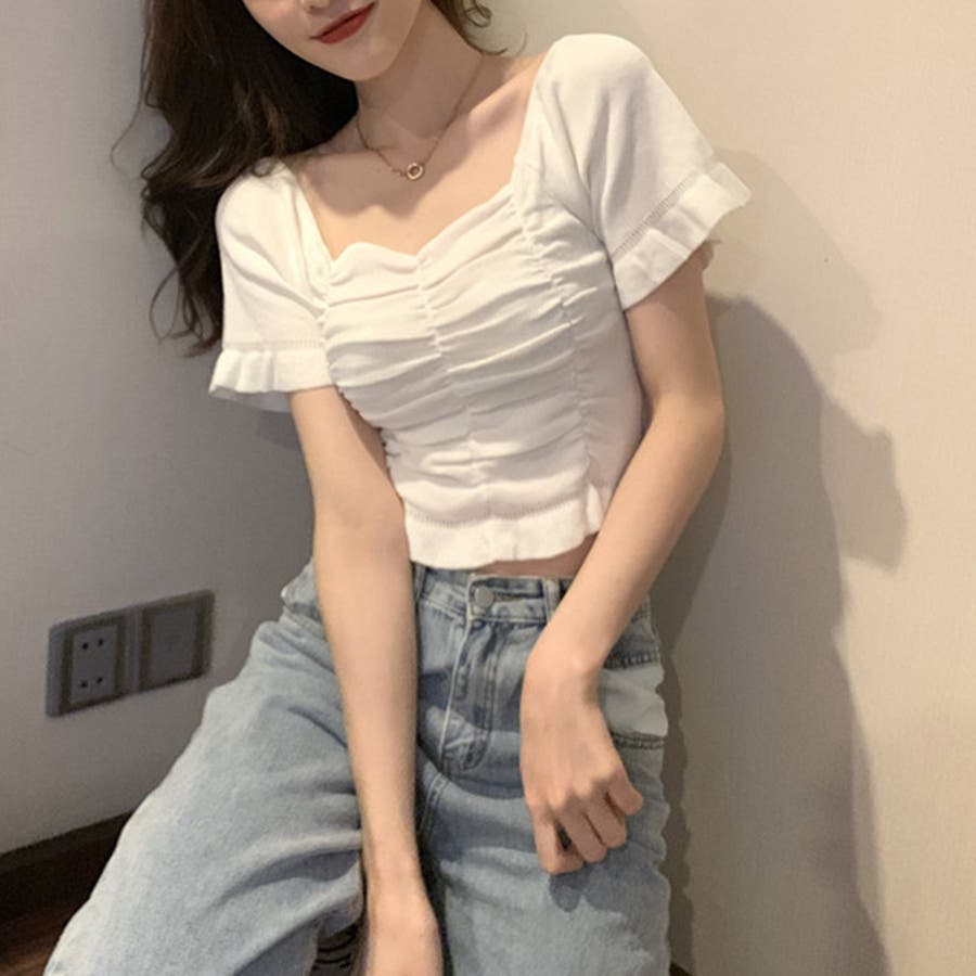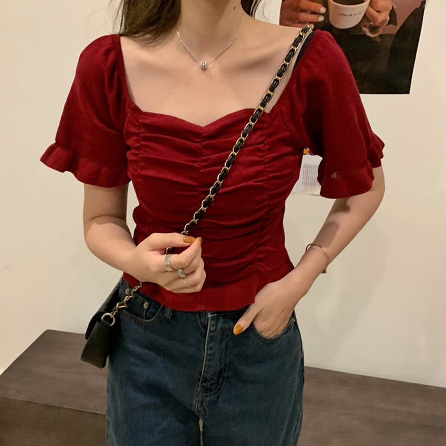 韓国ファッション 韓国かわいい 服 韓国 トップス 夏 韓国 通販 韓国トップス トップス トップス春 トップス韓国 夏トップス トップス半袖 トップス ショート丈トップス ギャザートップス 韓国ギャザーサマーニット スクエアネックトップス スクエアネックニットトップス ギャザーニットトップス 半袖 セクシー 胸元 セクシー へそ出し