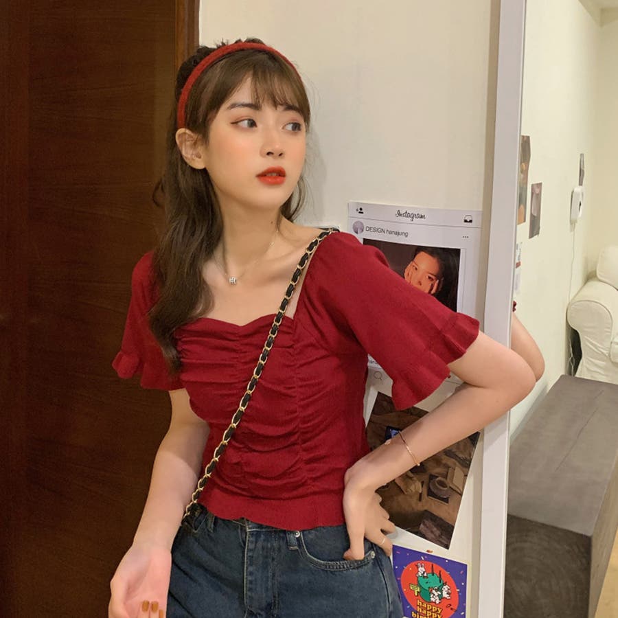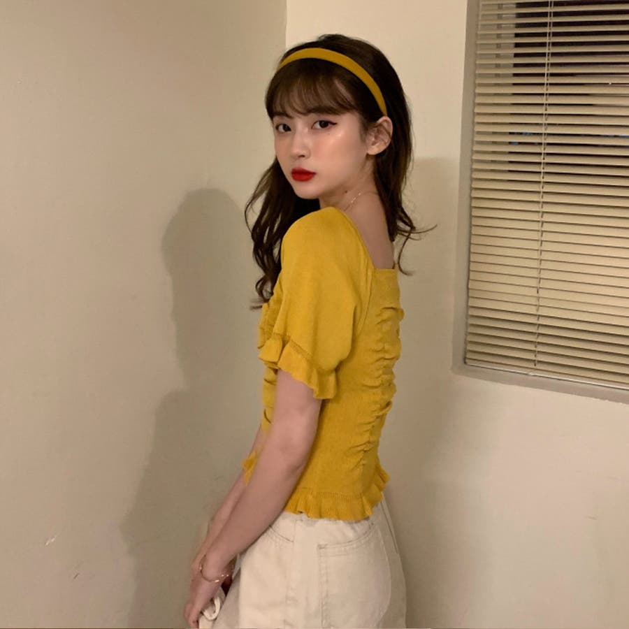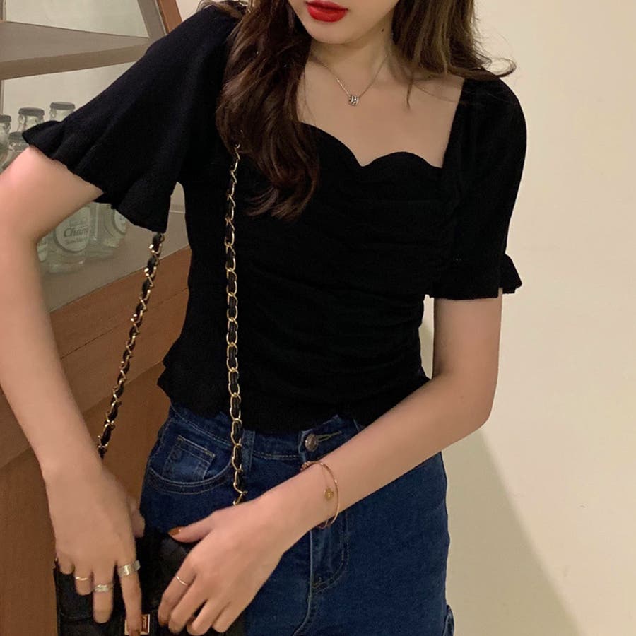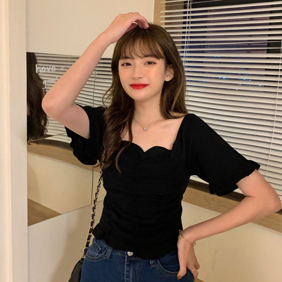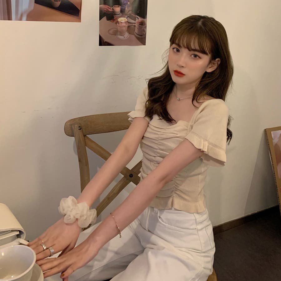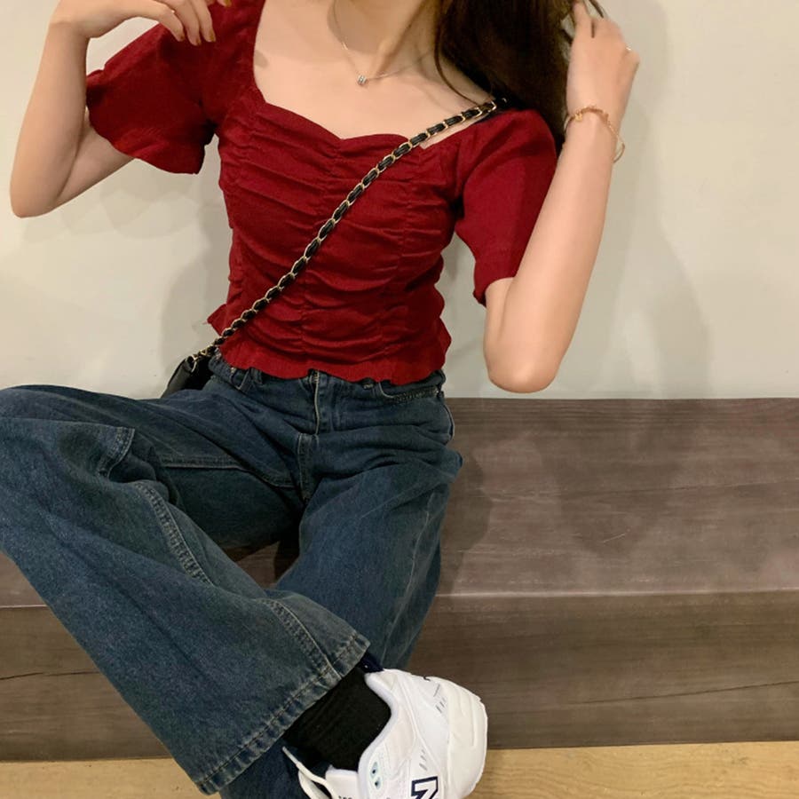 韓国ファッション 韓国かわいい 服 韓国 トップス 夏 韓国 通販 韓国トップス トップス トップス春 トップス韓国 夏トップス トップス半袖 トップス ショート丈トップス ギャザートップス 韓国ギャザーサマーニット スクエアネックトップス スクエアネックニットトップス ギャザーニットトップス 半袖 セクシー 胸元 セクシー へそ出し