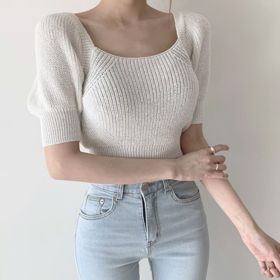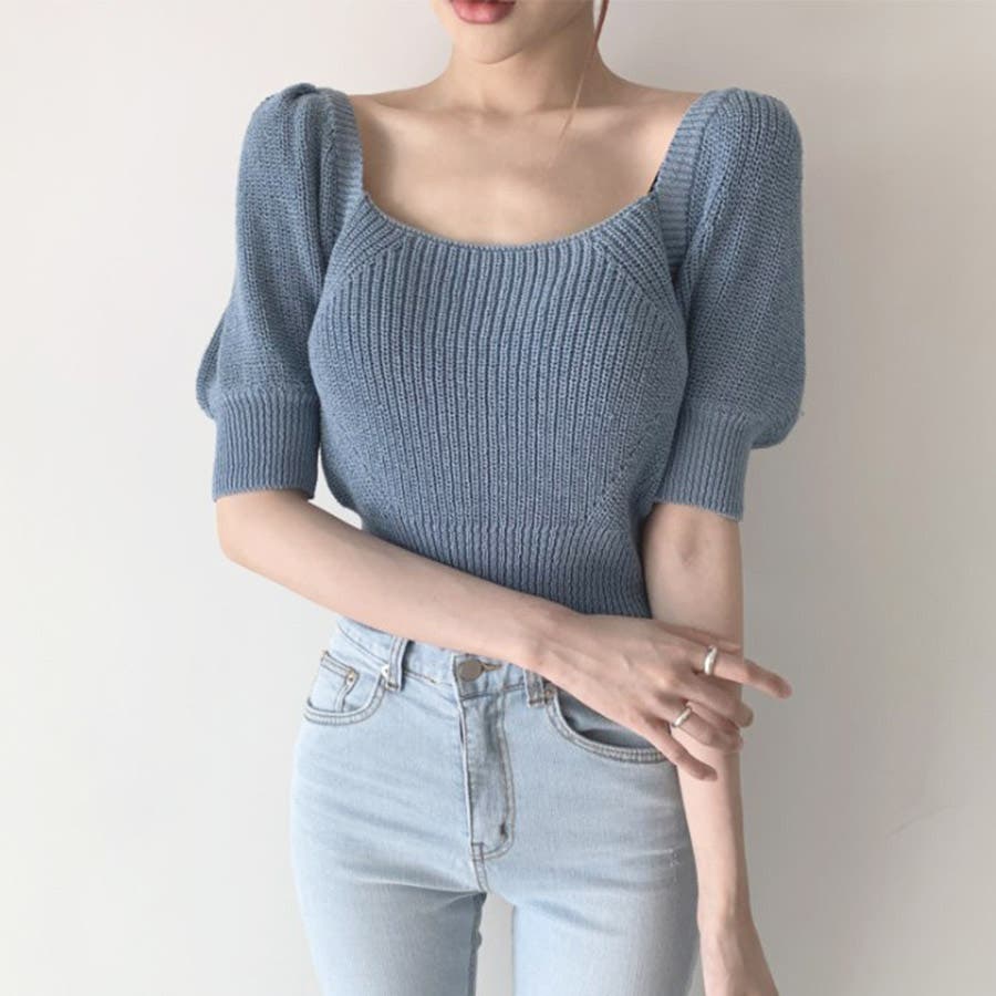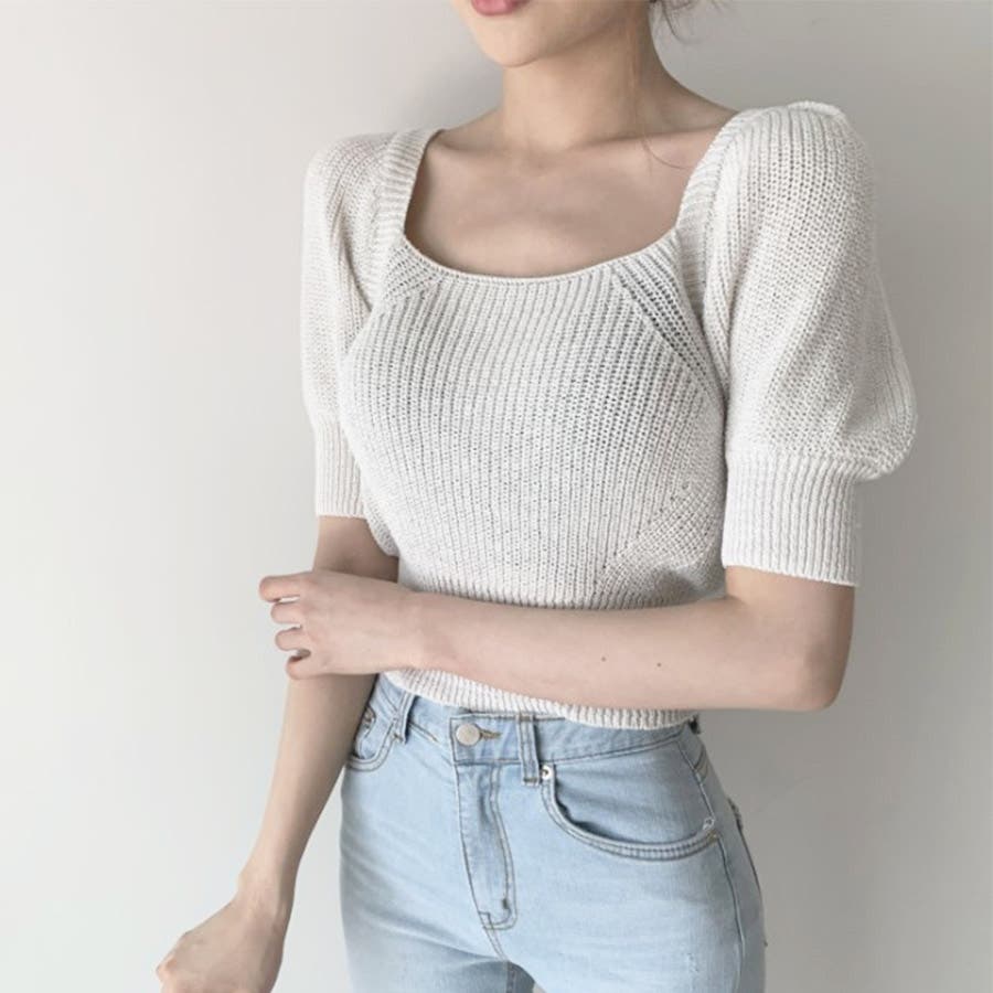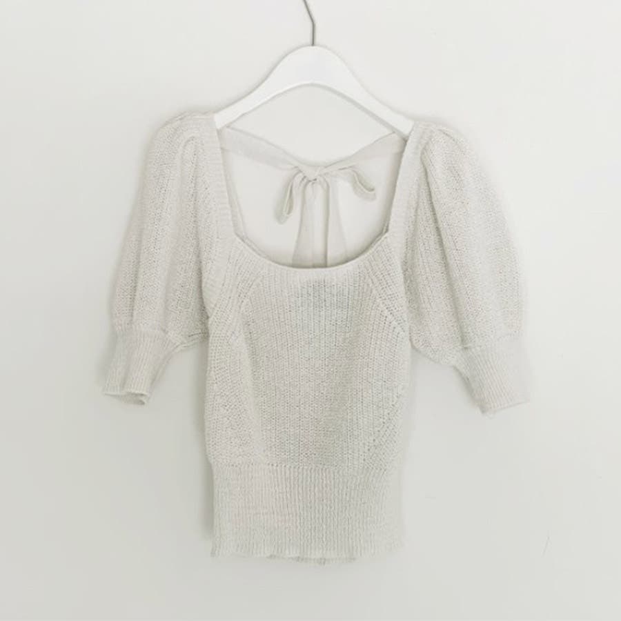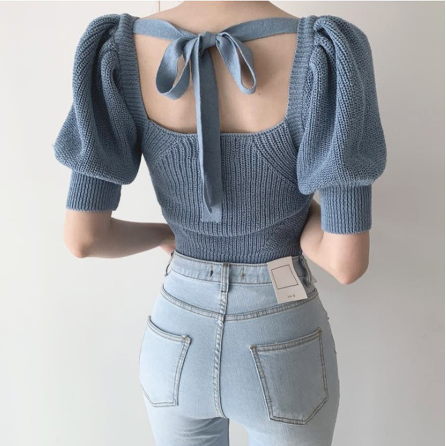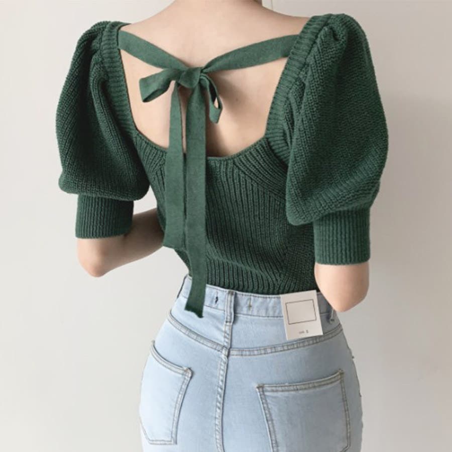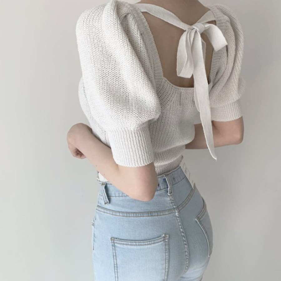 トップス リボン 背中開き かわいい おしゃれ セクシー 上品 パフスリーブ サマーニット 春 夏 秋 カジュアル 韓国 韓国ファッション きれいめ レディース