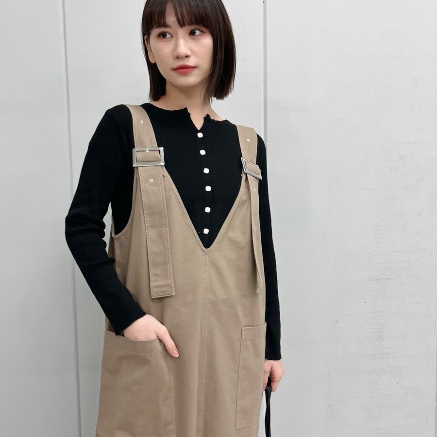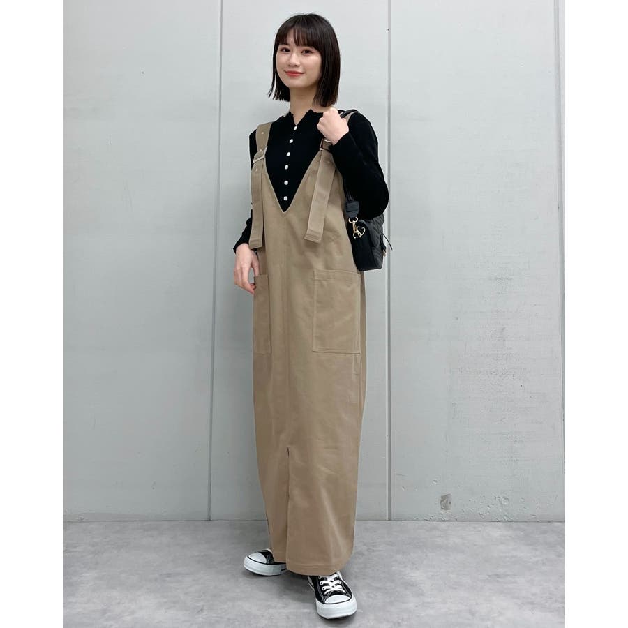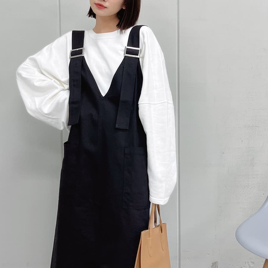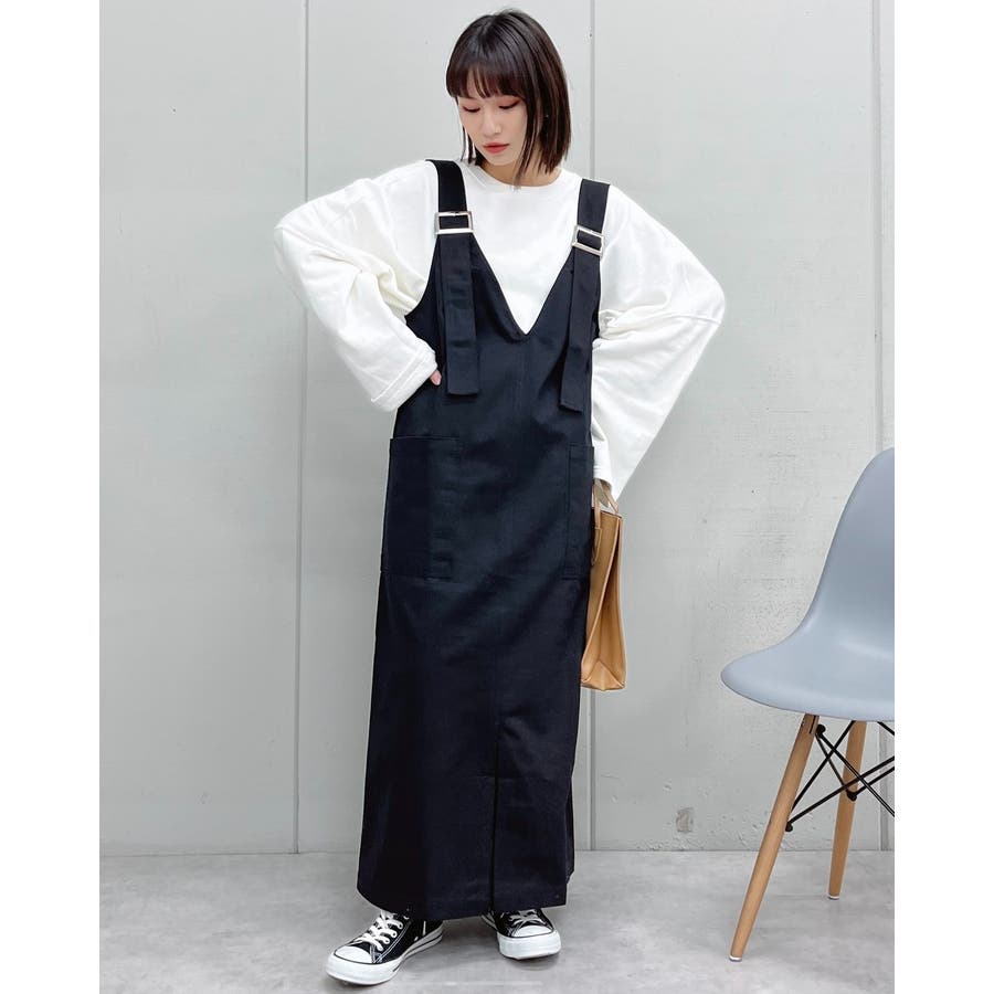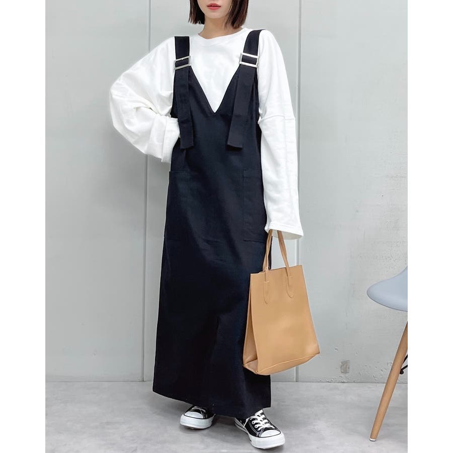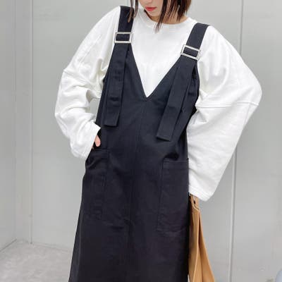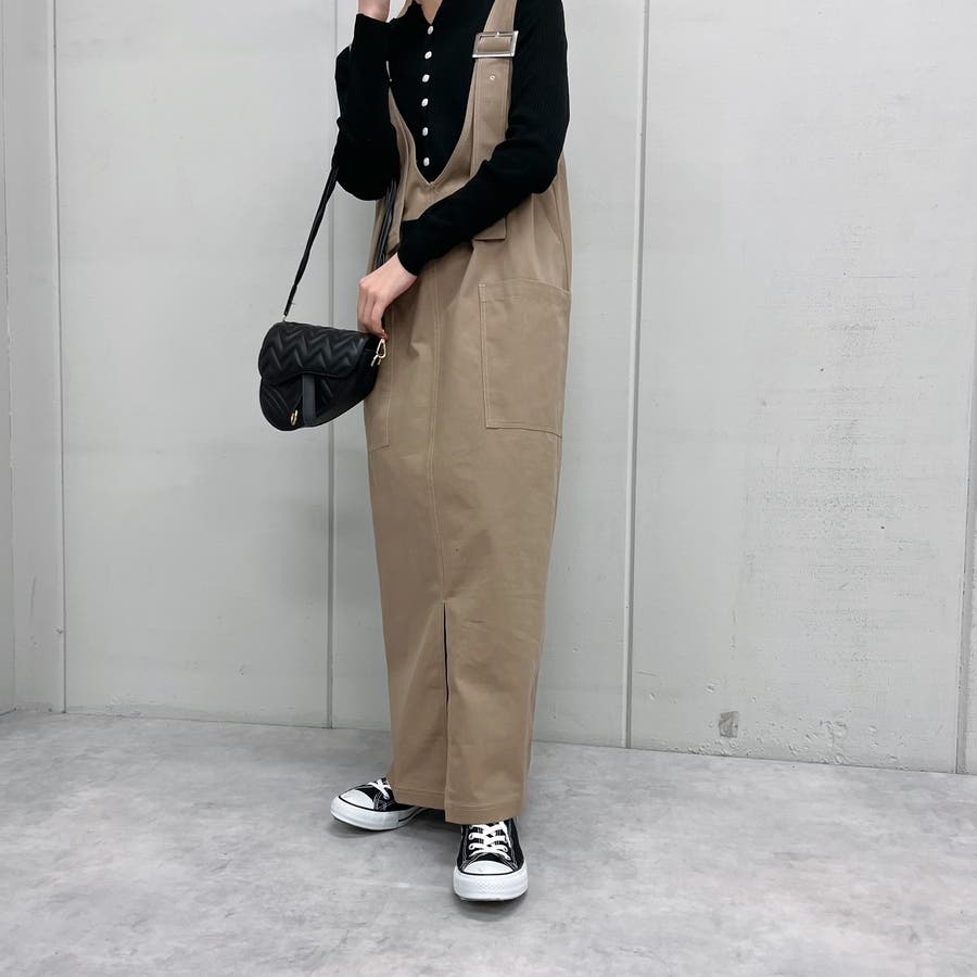 肩ストラップのベルトデザインや、ポケットやスリットも付いているのでジャンスカ自体のデザイン性も高く、こなれ感が溢れる1枚です。