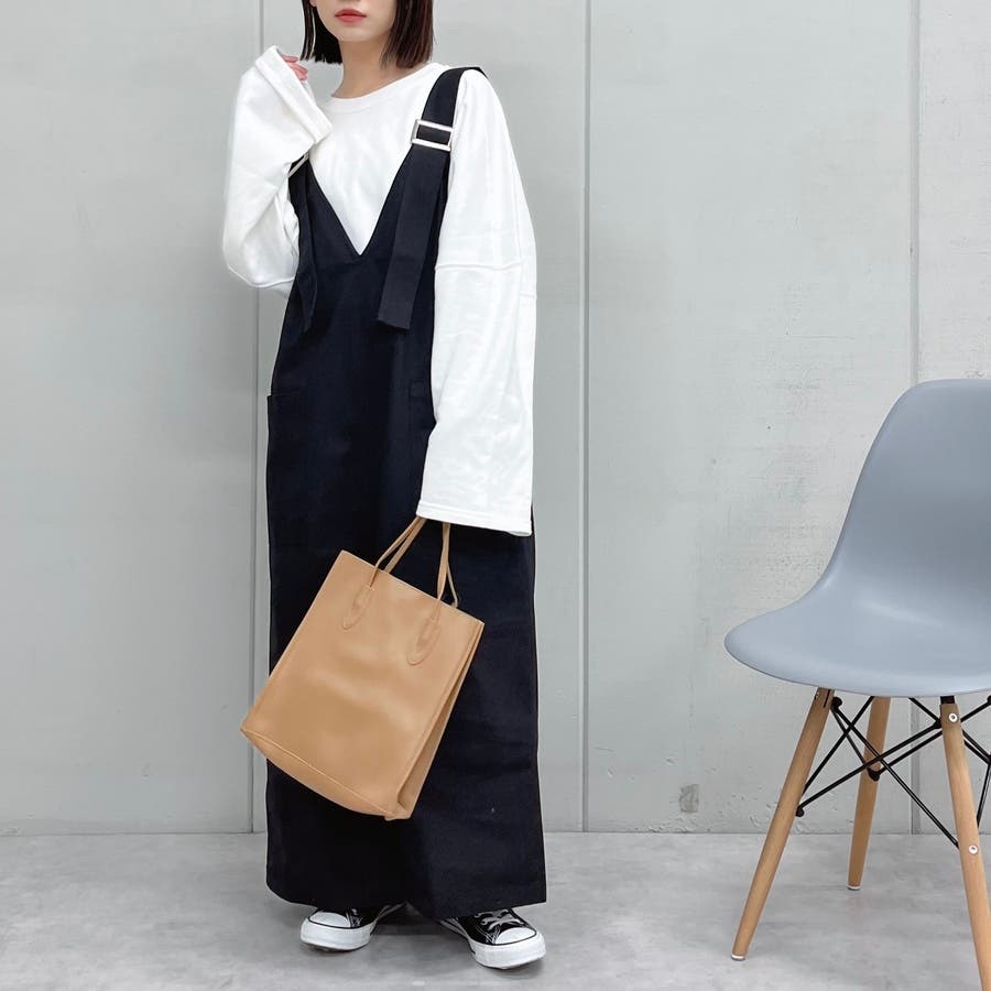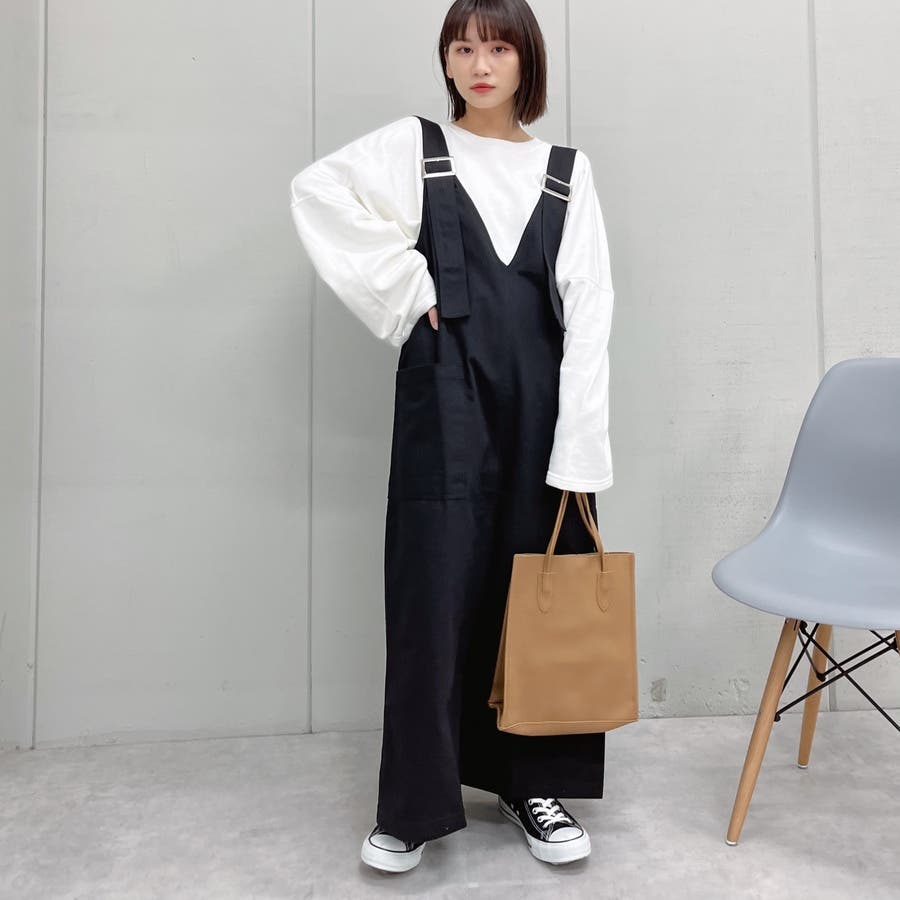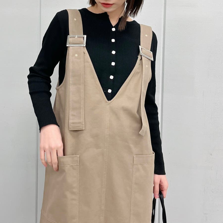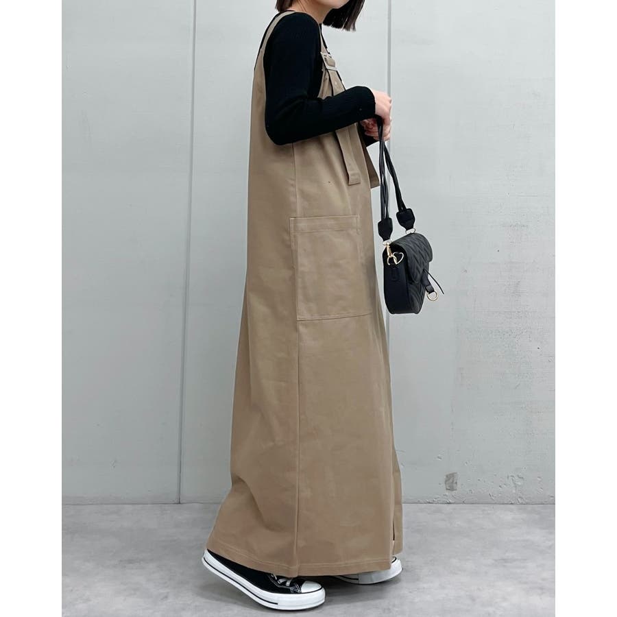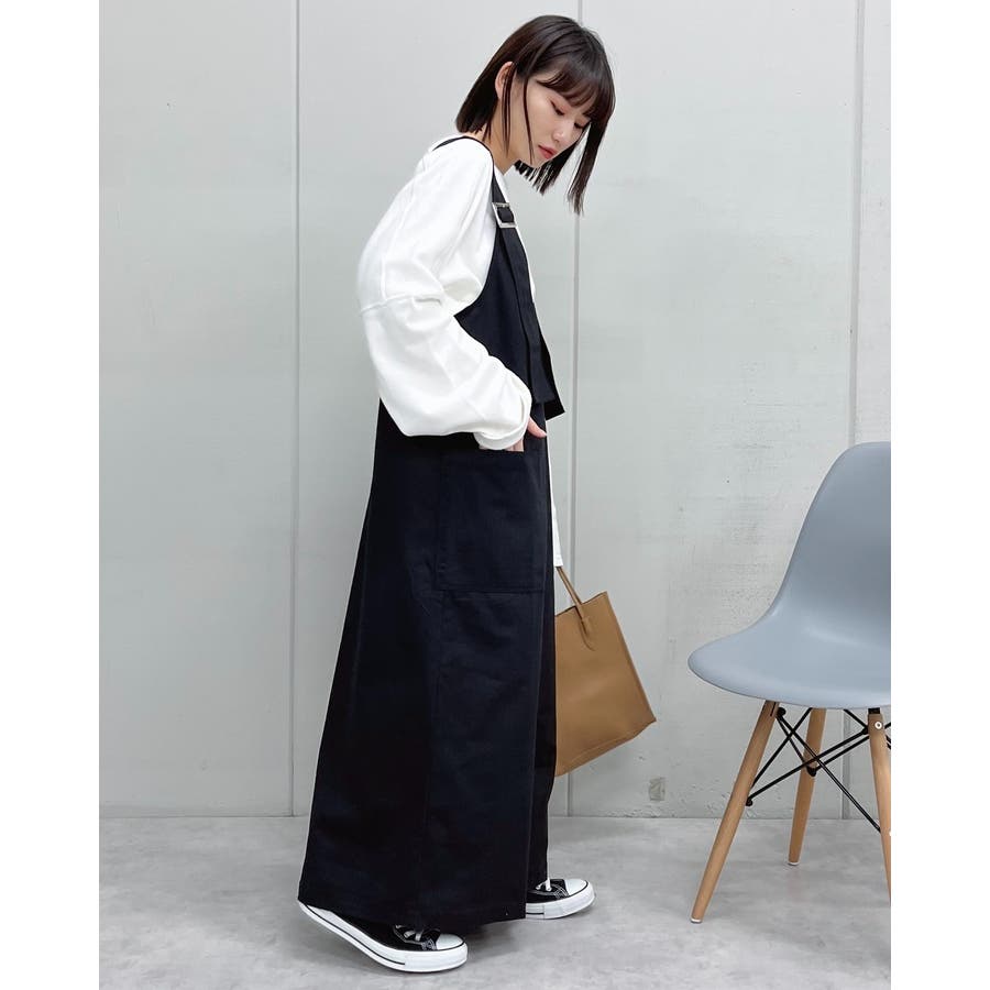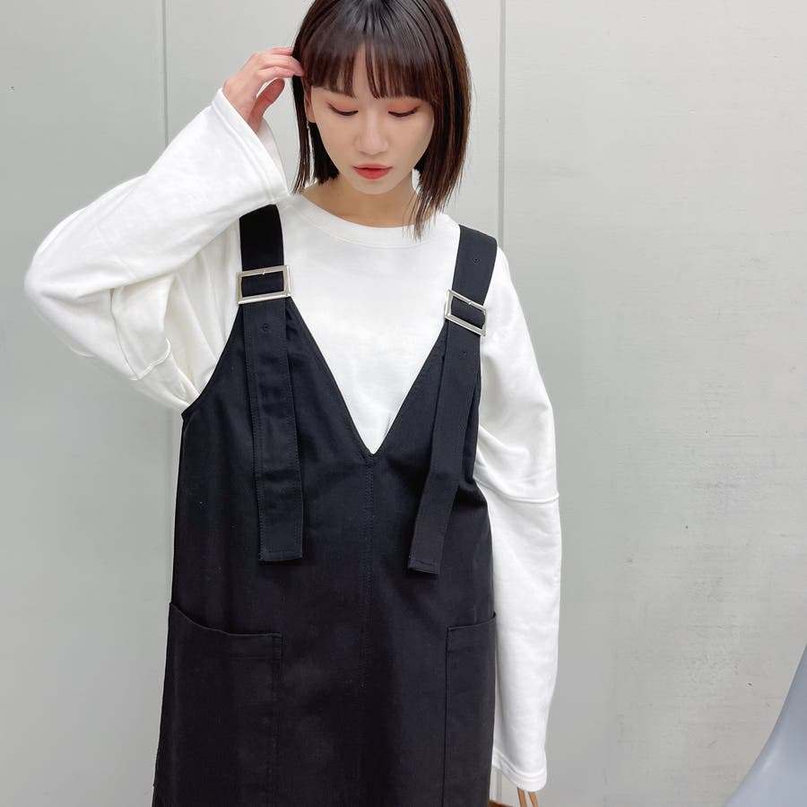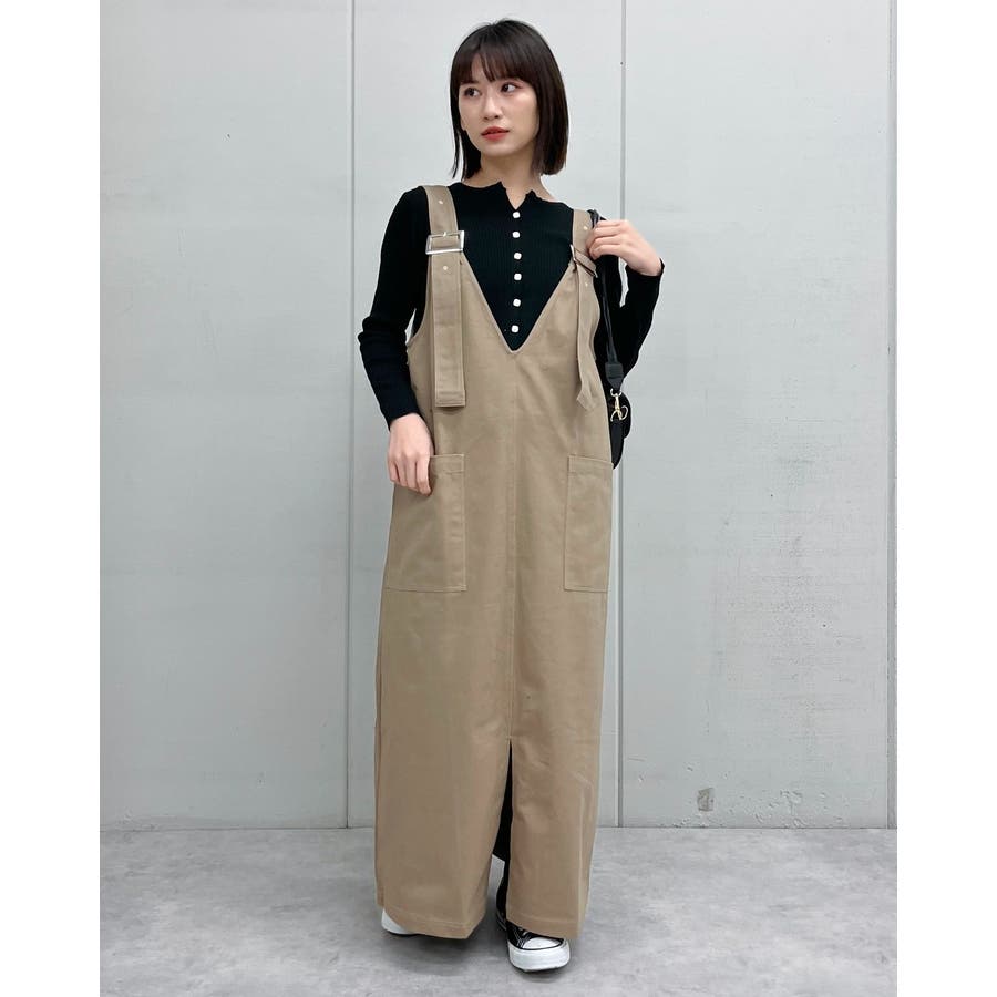 肩ストラップのベルトデザインや、ポケットやスリットも付いているのでジャンスカ自体のデザイン性も高く、こなれ感が溢れる1枚です。
