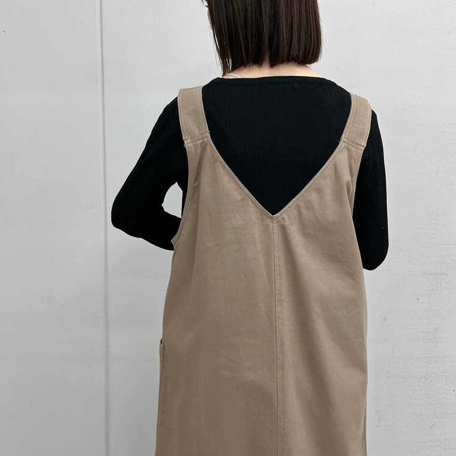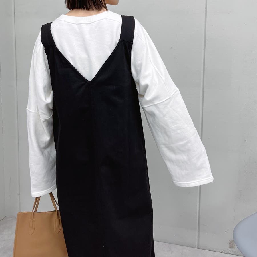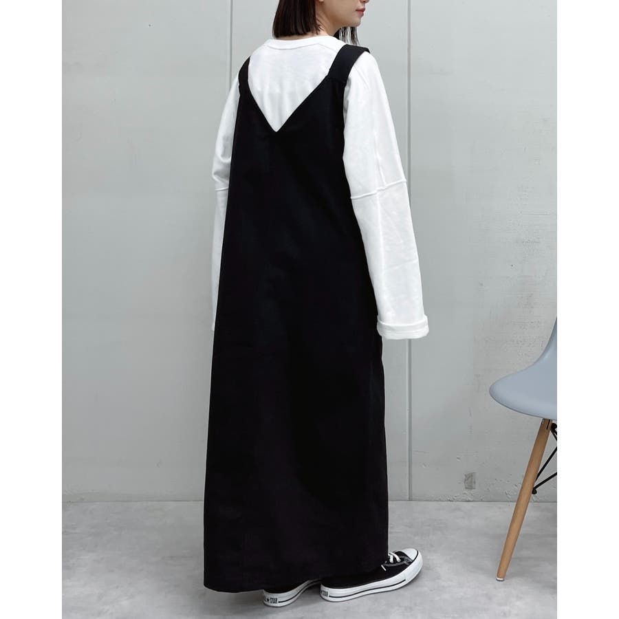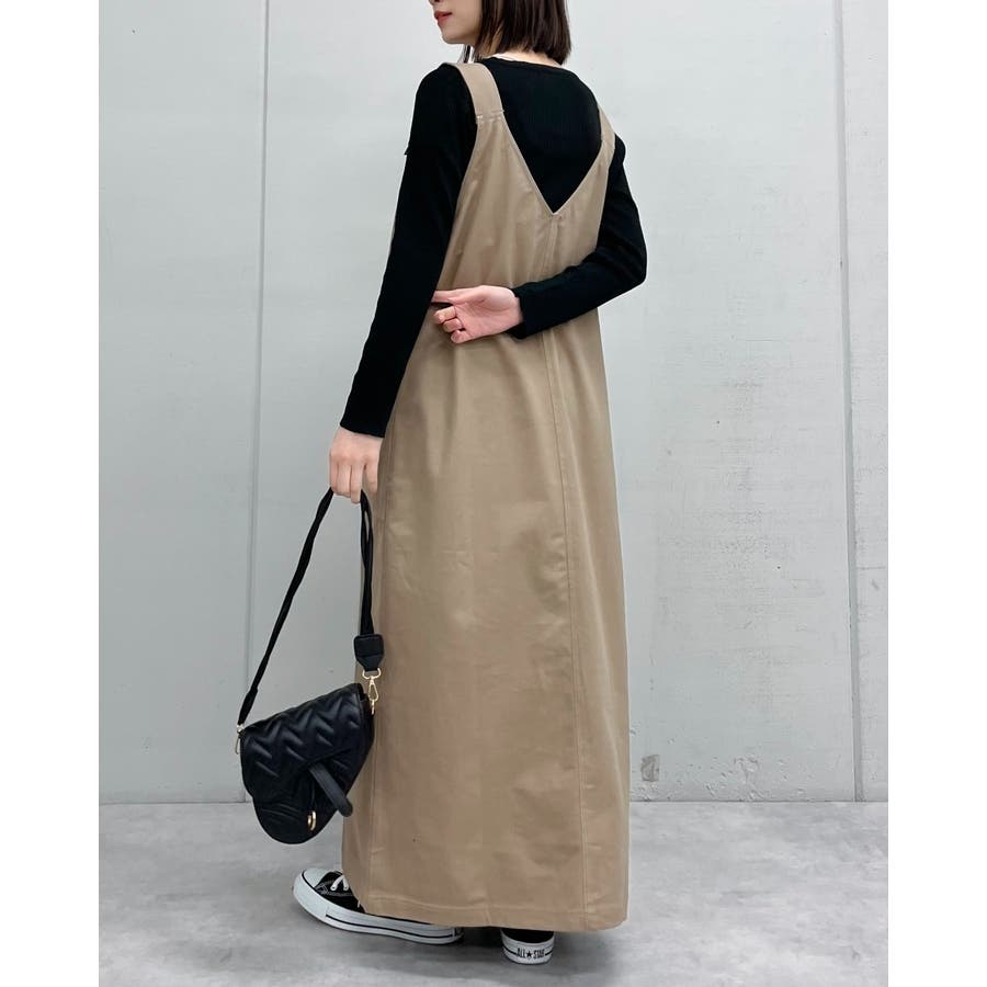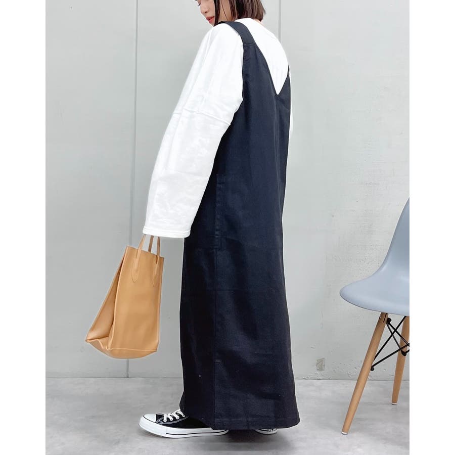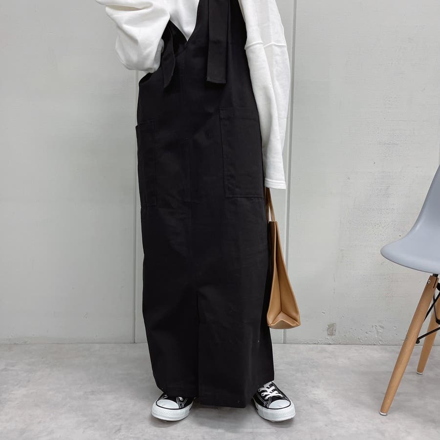肩ストラップのベルトデザインや、ポケットやスリットも付いているのでジャンスカ自体のデザイン性も高く、こなれ感が溢れる1枚です。