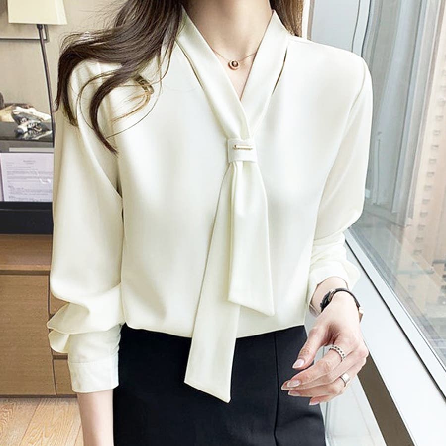 #ブラウス/#Vネック/#レース/#シフォン/#韓国/#エレガント/#大人/#オフィスカジュアル/#ボウタイ