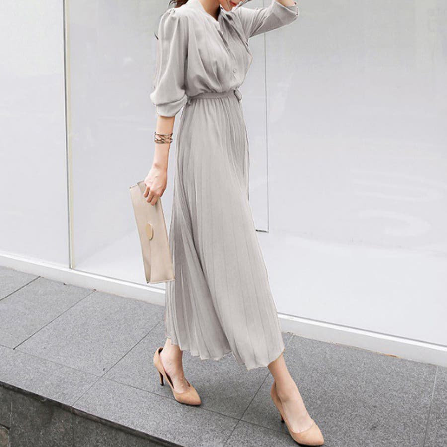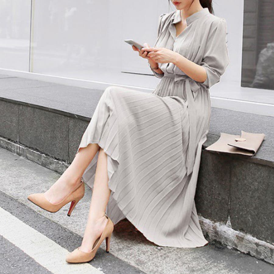 #ワンピース/#ロングワンピース/#半袖ワンピース/#オフィスカジュアル/#フェミニン/#開襟ワンピース/#プリーツ