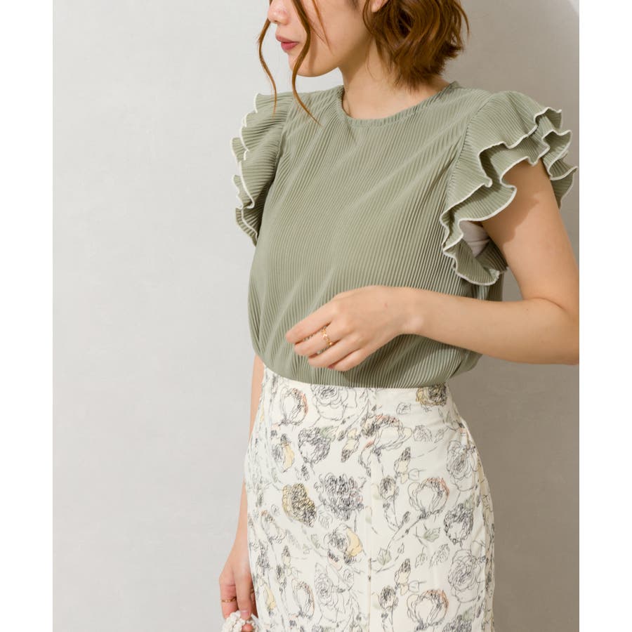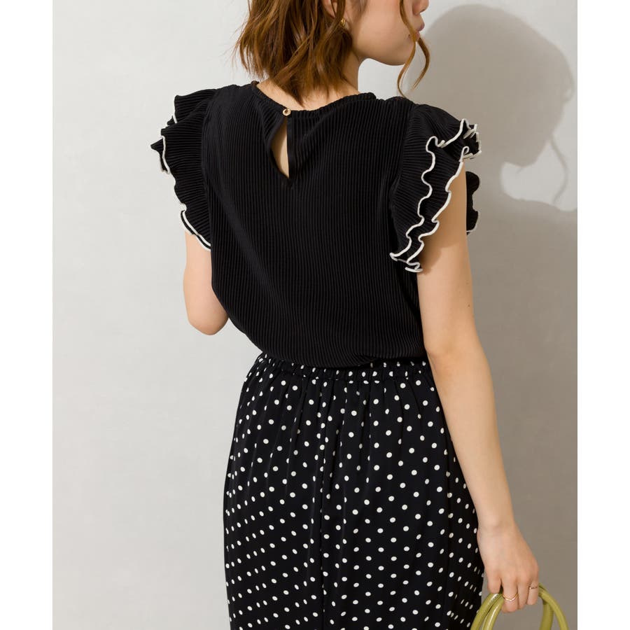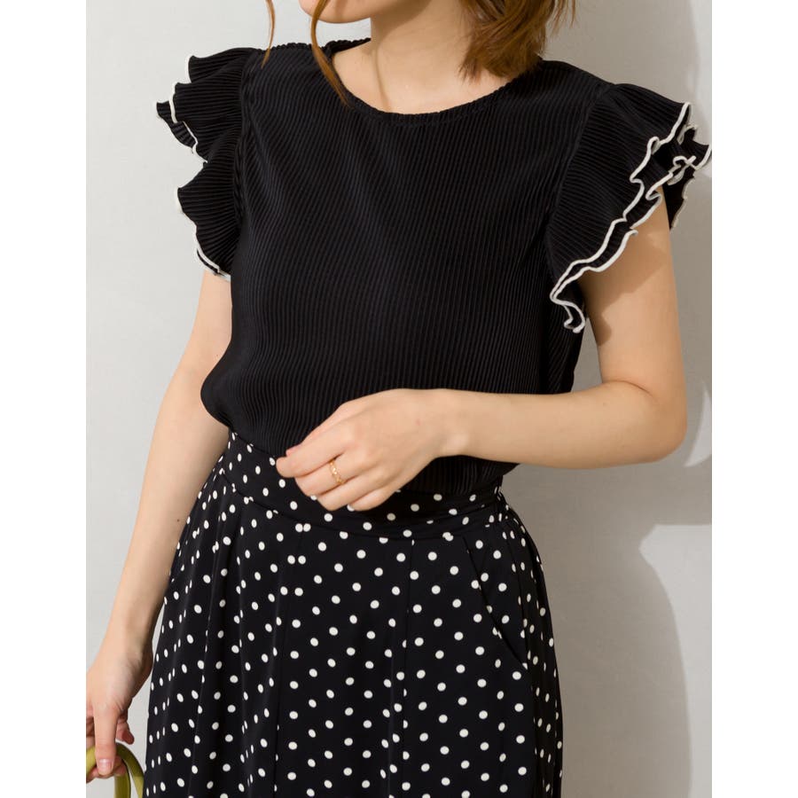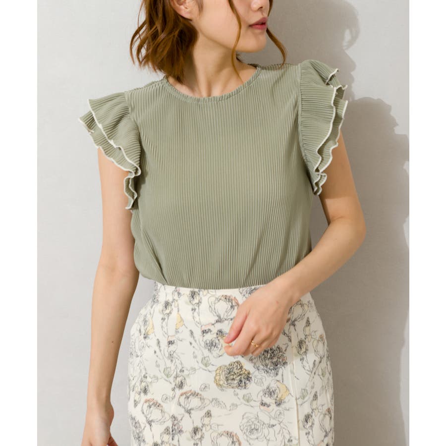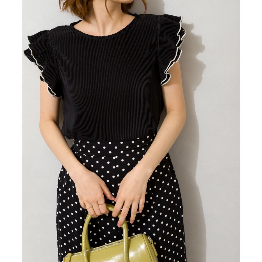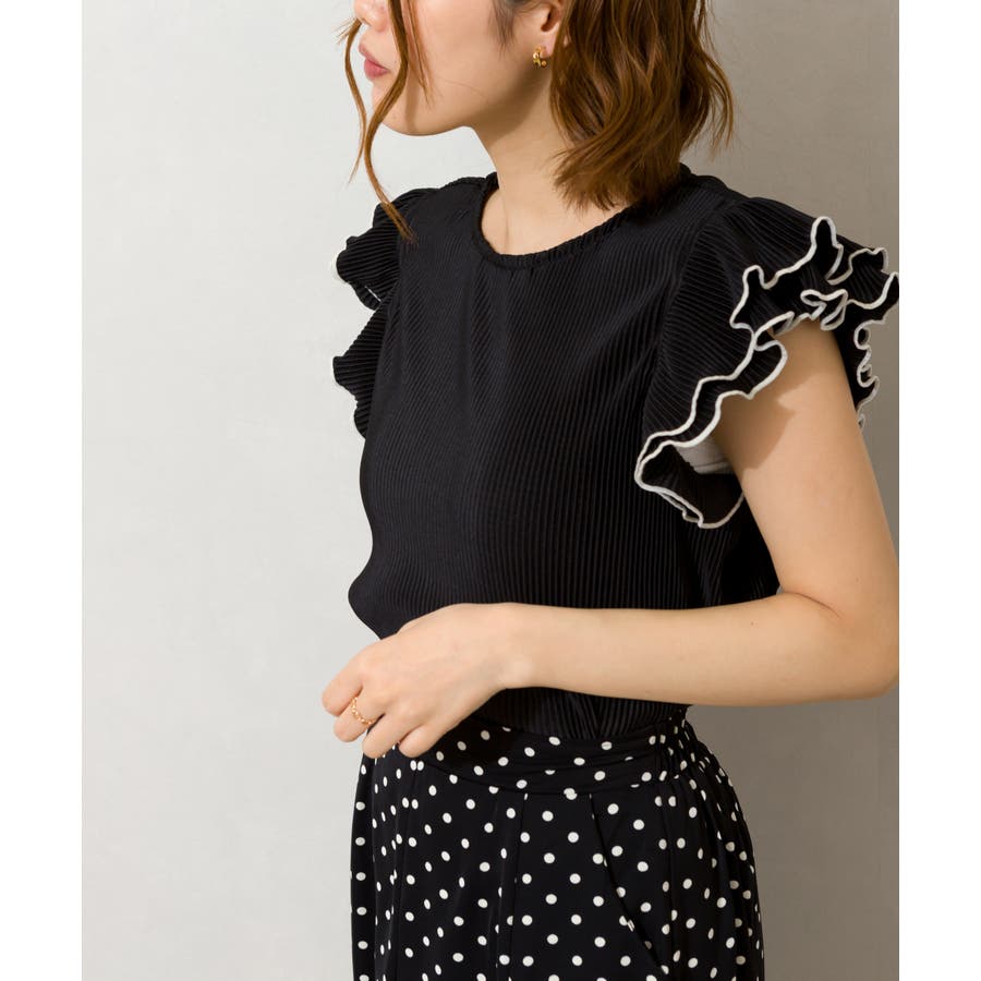 肩部分のフリルが特徴的なトップス◎肩部分のフリルが大きいことで華奢見せが得意なトップスでノースリーブでもきれいにスタイルアップが可能なアイテム♪トレンドのマーメイドスカートやデニム合わせでも可愛く決まります☆