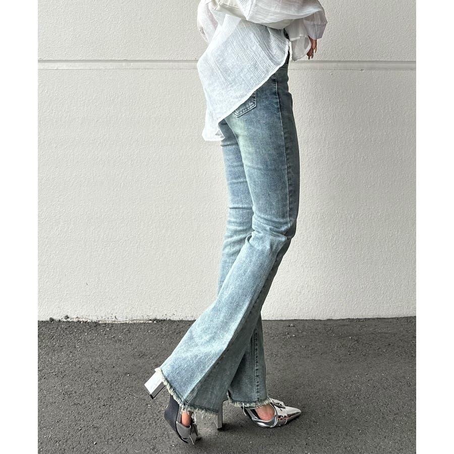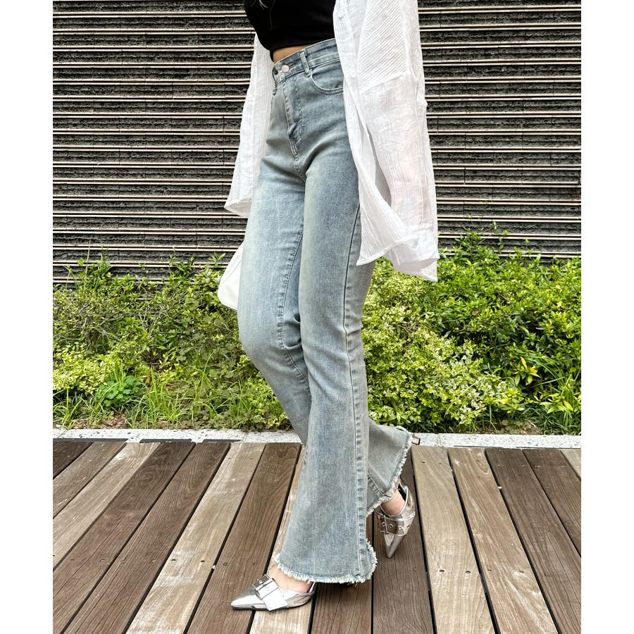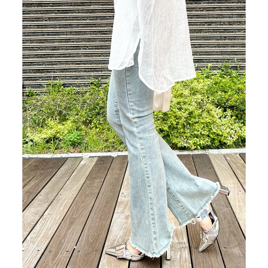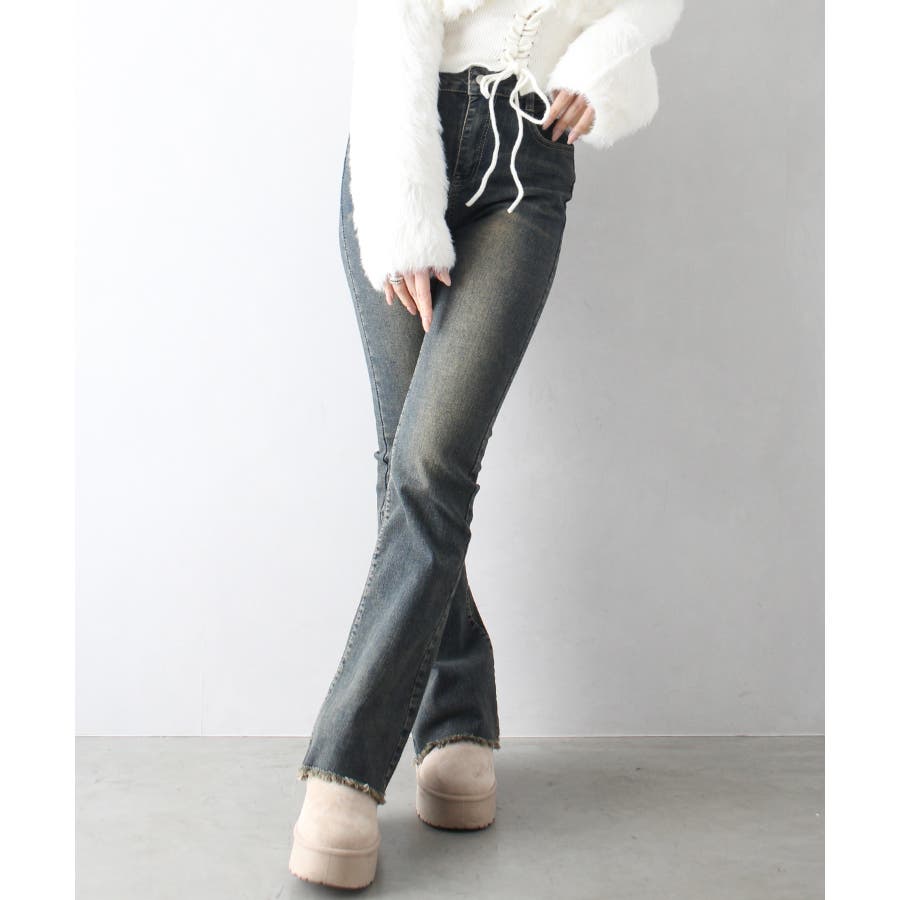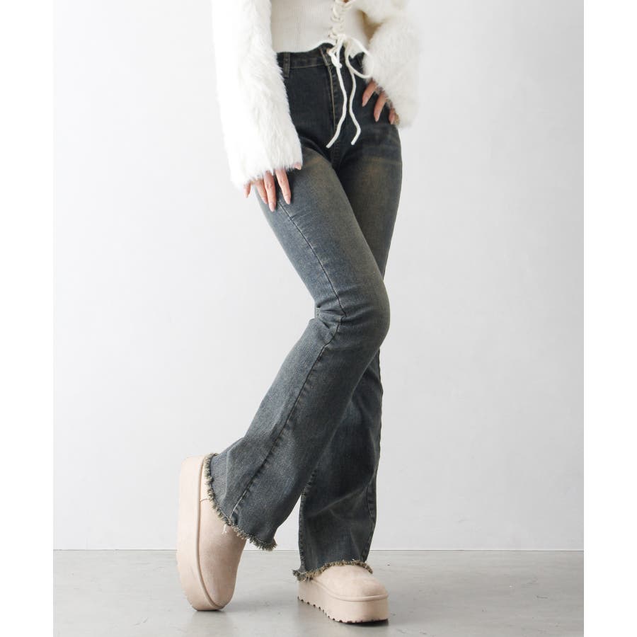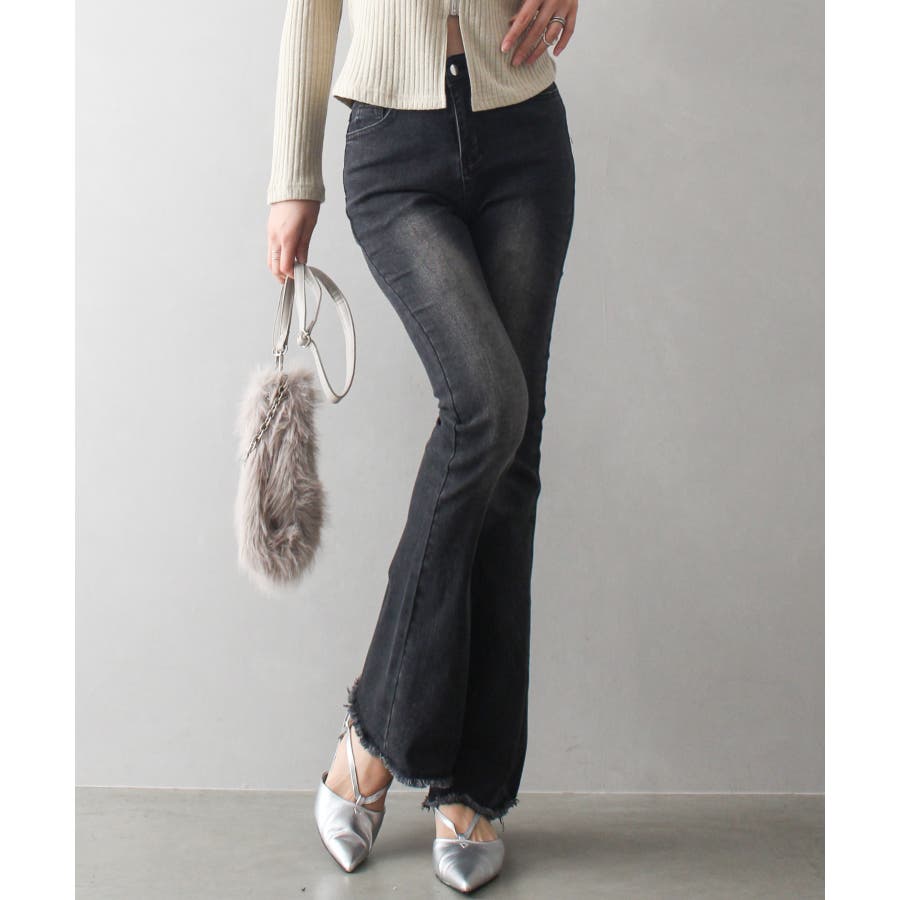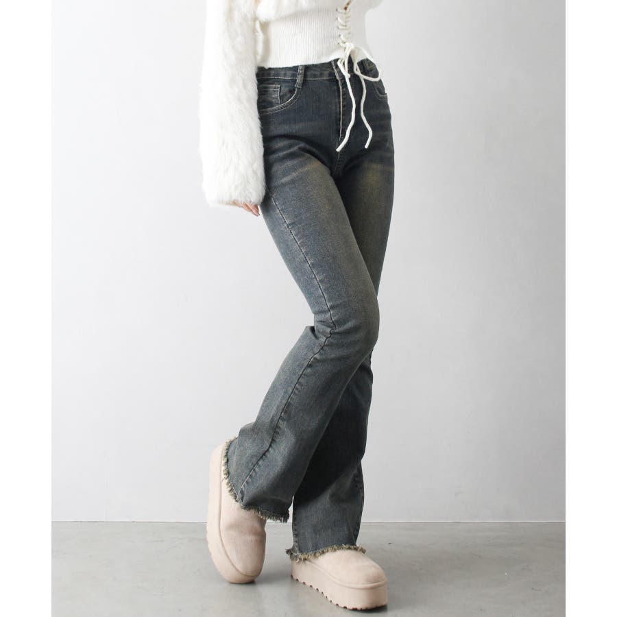 すそフリンジストレッチデニムフレアパンツ