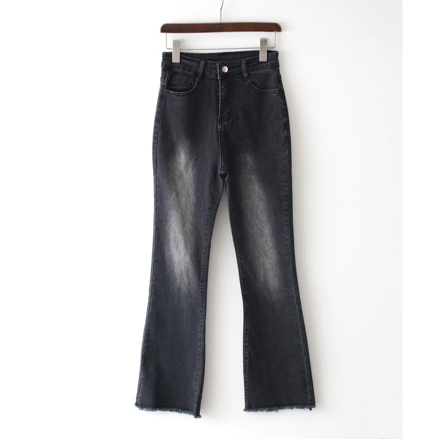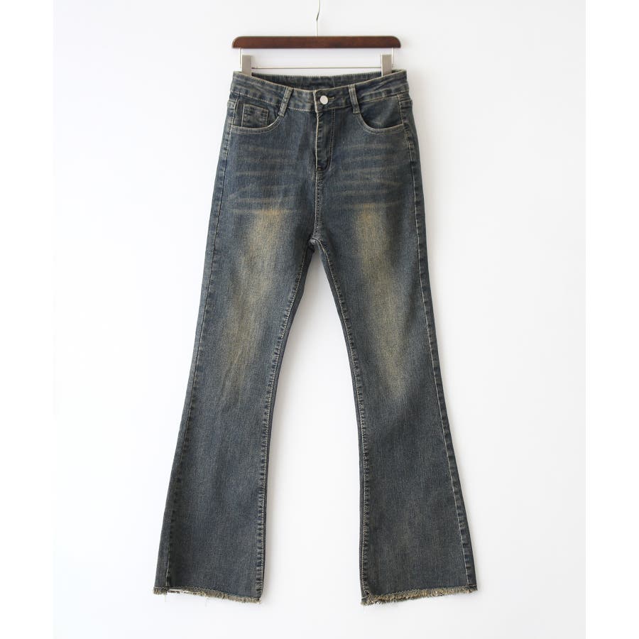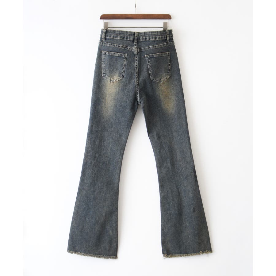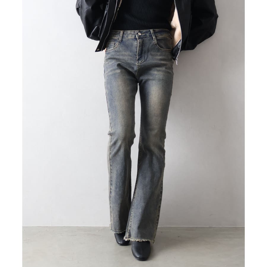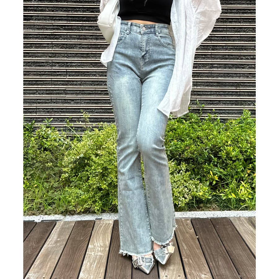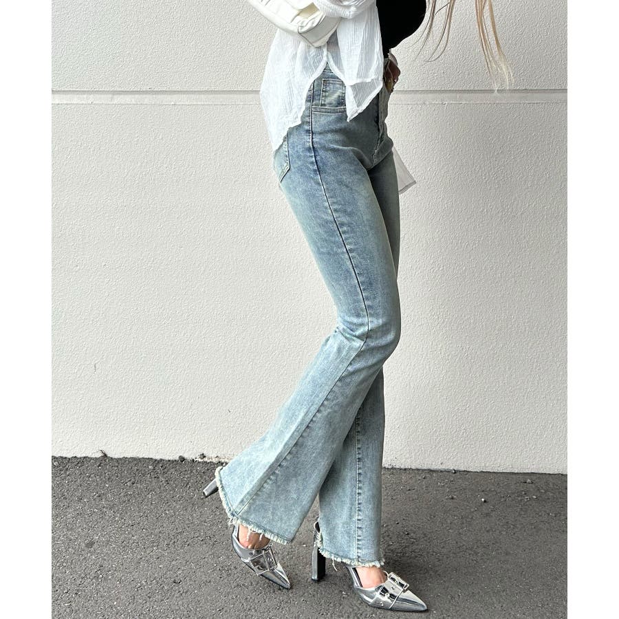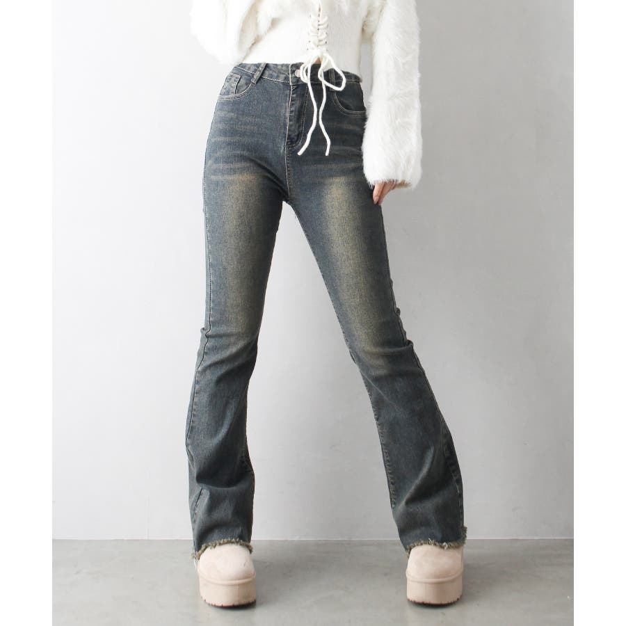 すそフリンジストレッチデニムフレアパンツ