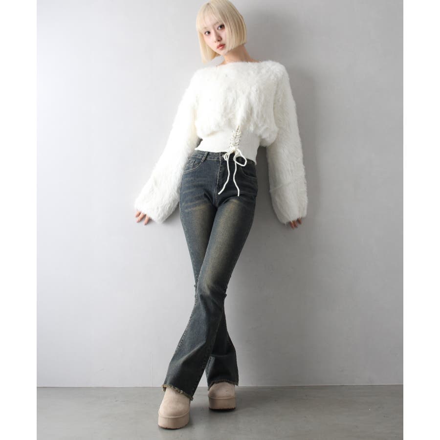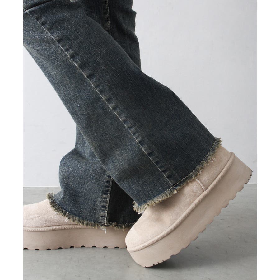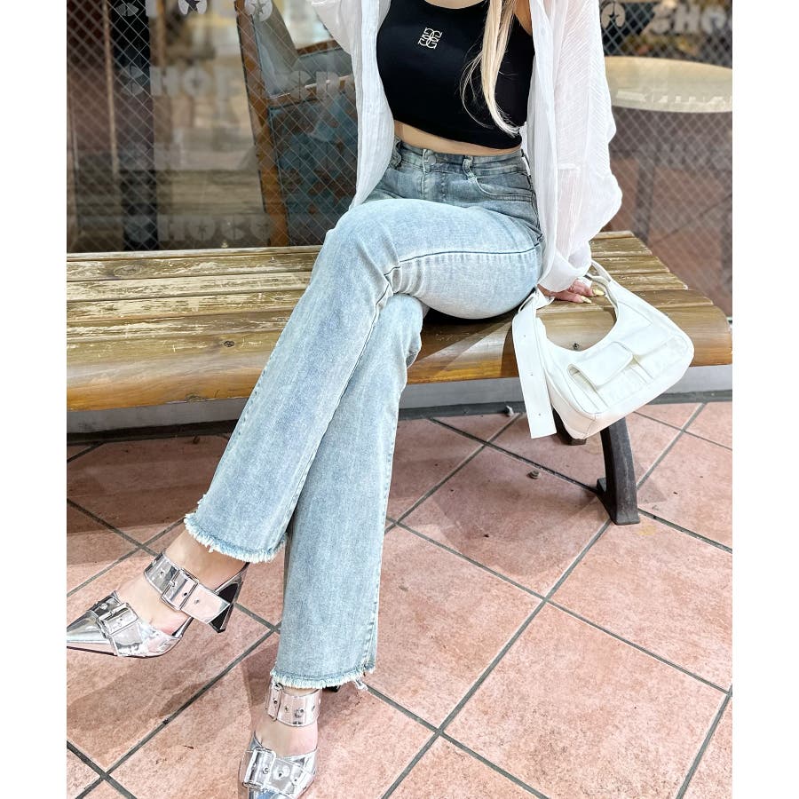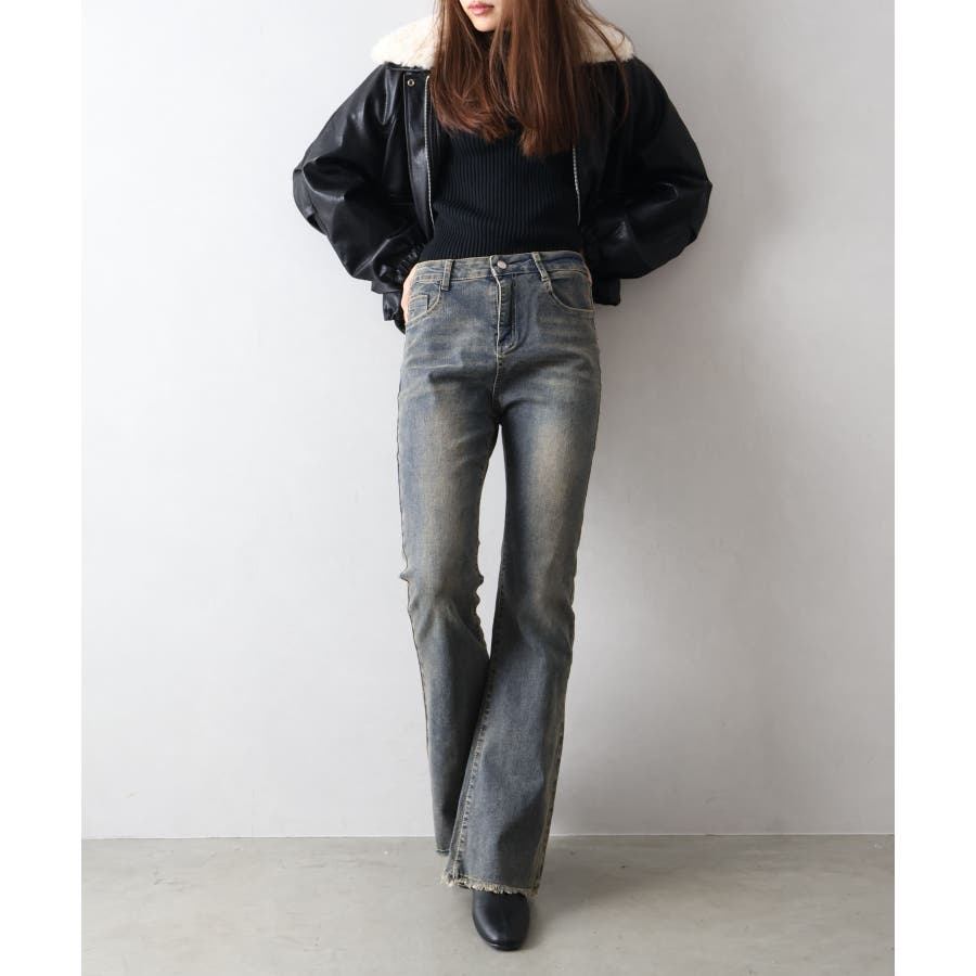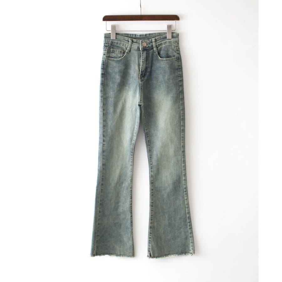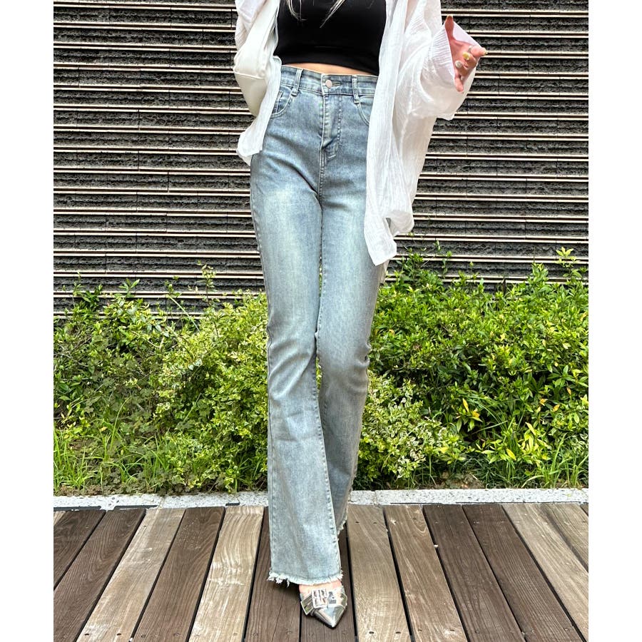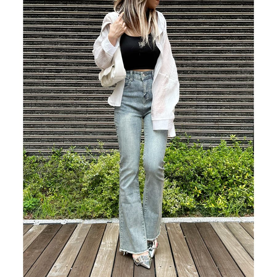 すそフリンジストレッチデニムフレアパンツ