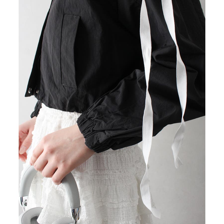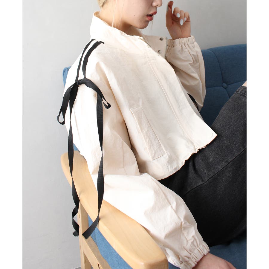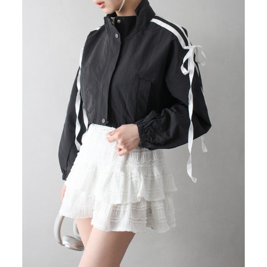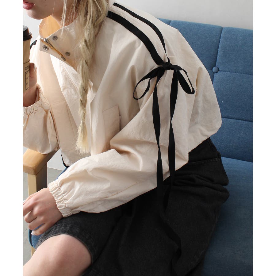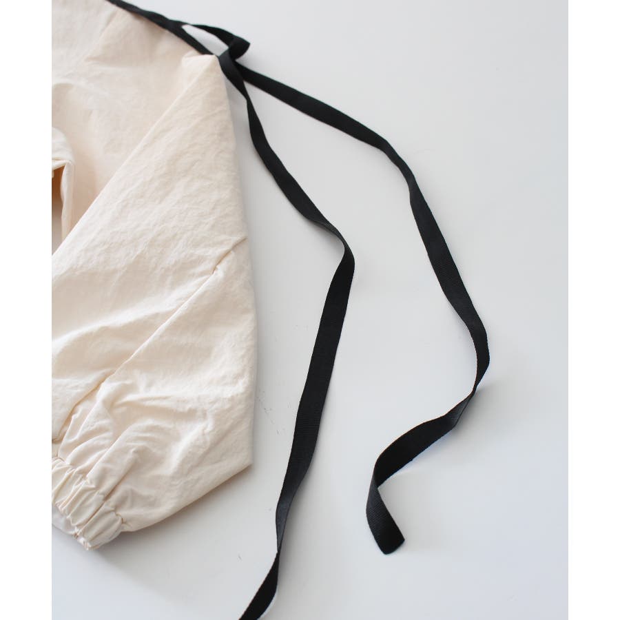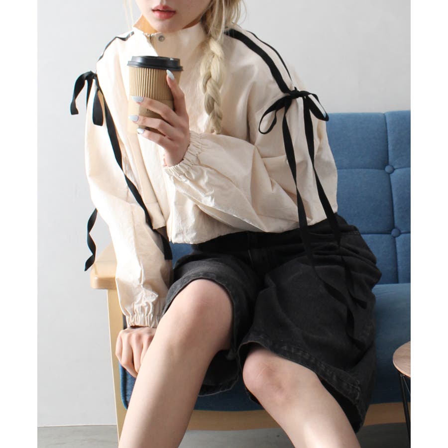 丸みのあるシルエットで抜け感を演出しつつ、肩から落ちるリボンがフェミニンなアクセントに。