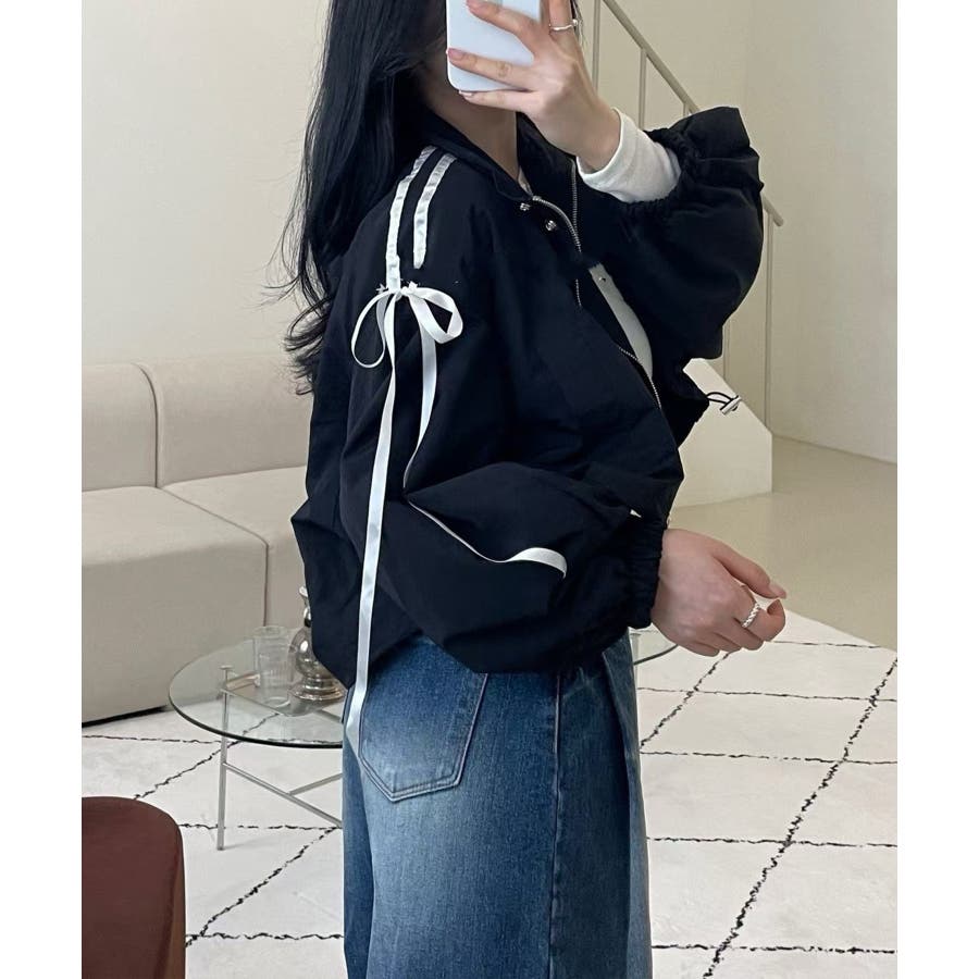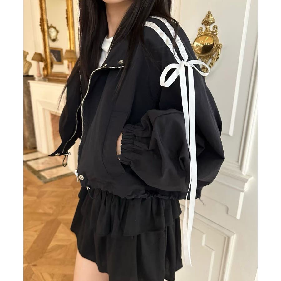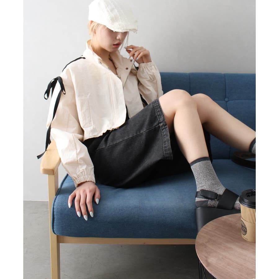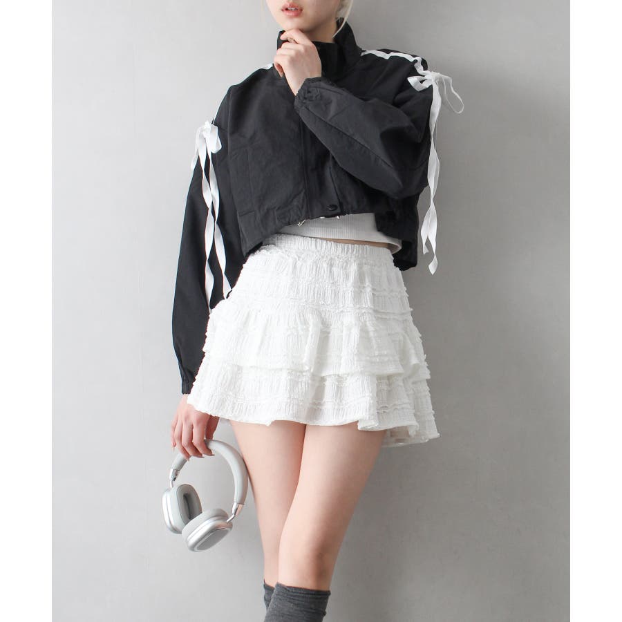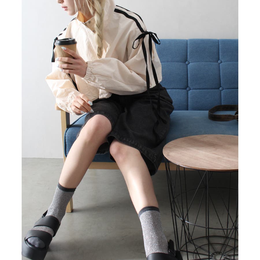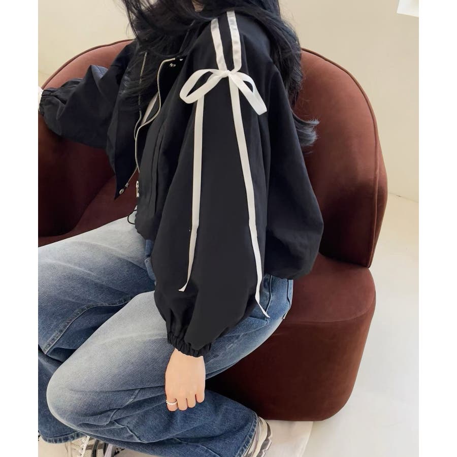 丸みのあるシルエットで抜け感を演出しつつ、肩から落ちるリボンがフェミニンなアクセントに。