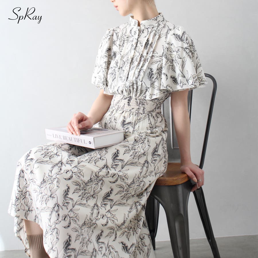 【SpRay 花柄ピンタックフレアスリーブワンピース】