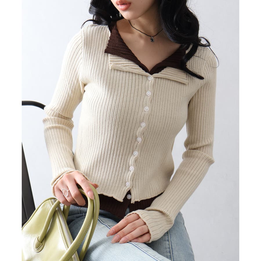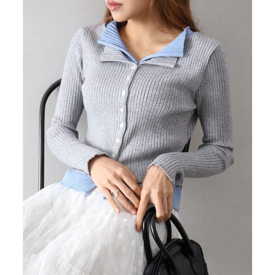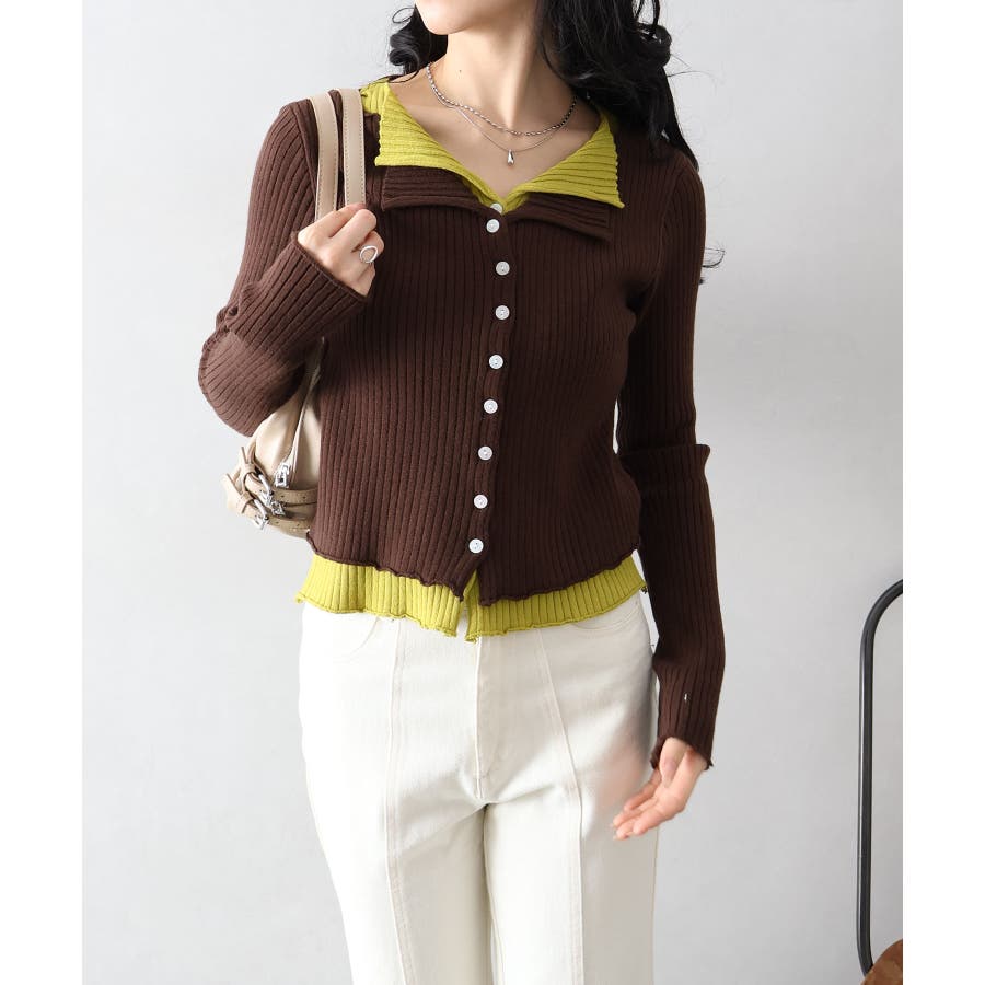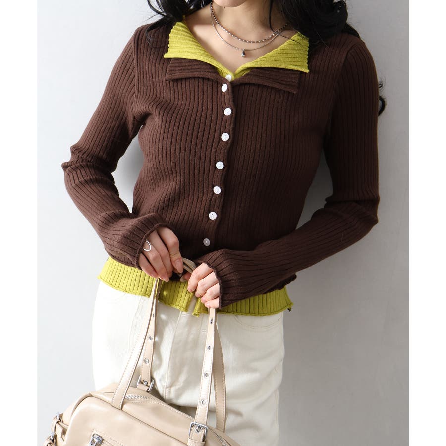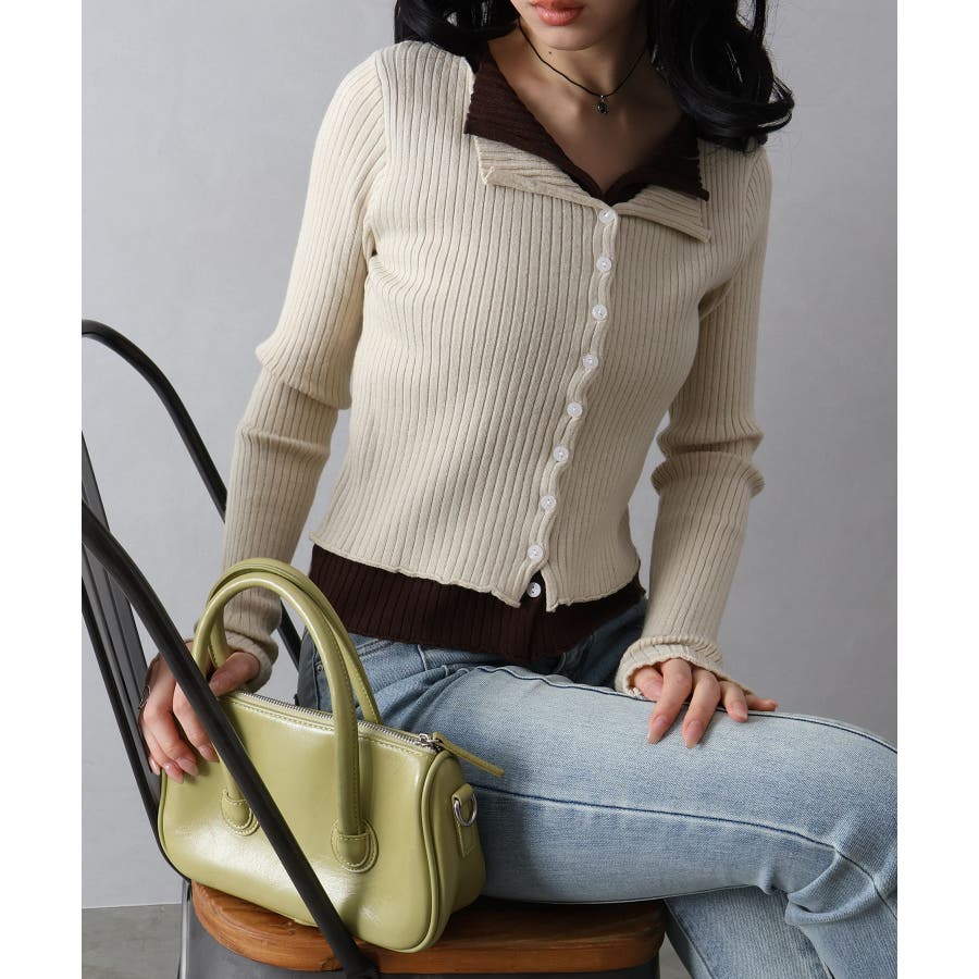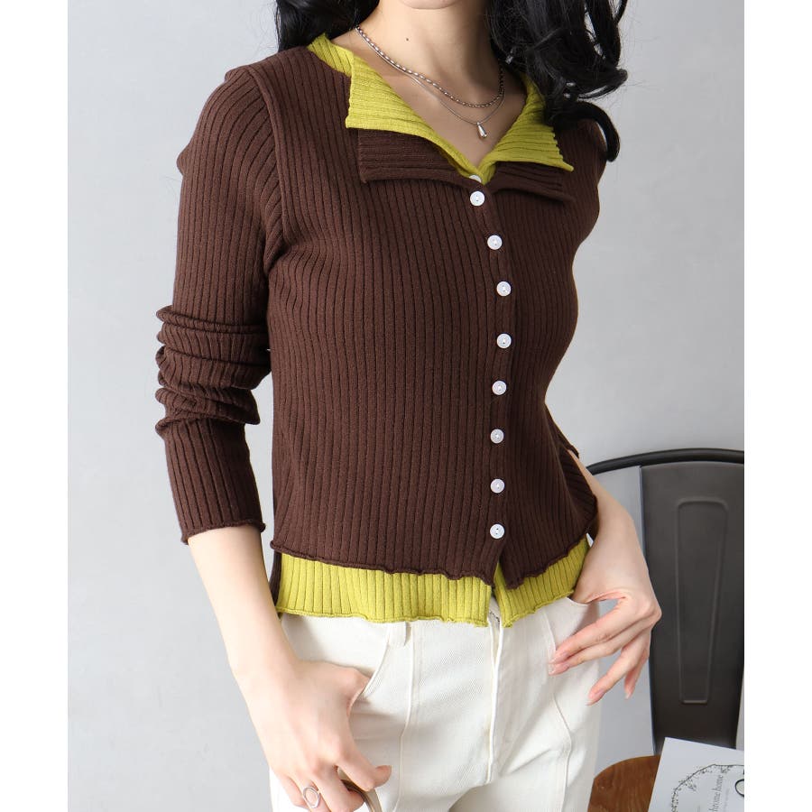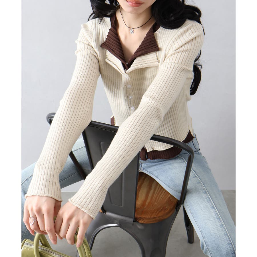 シンプルなのにコーデが一気にこなれる、レイヤード風デザインの配色リブニットトップス。