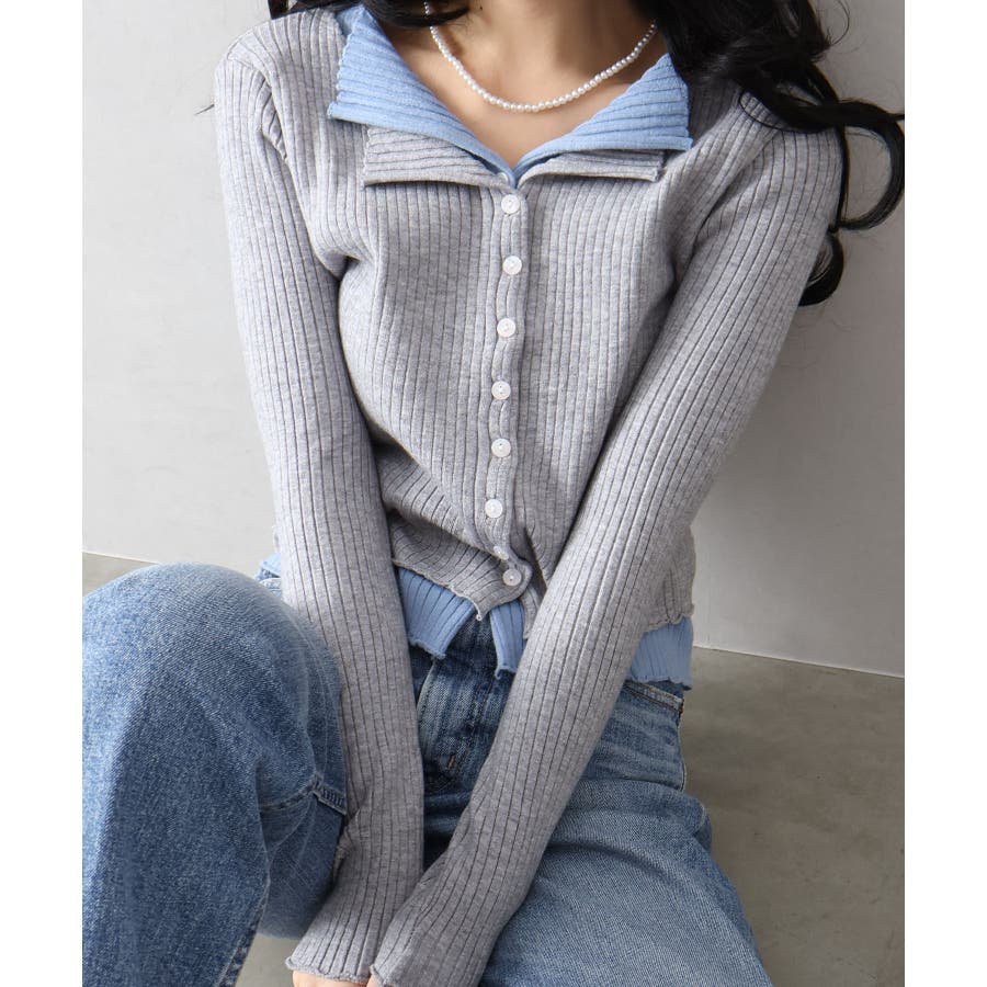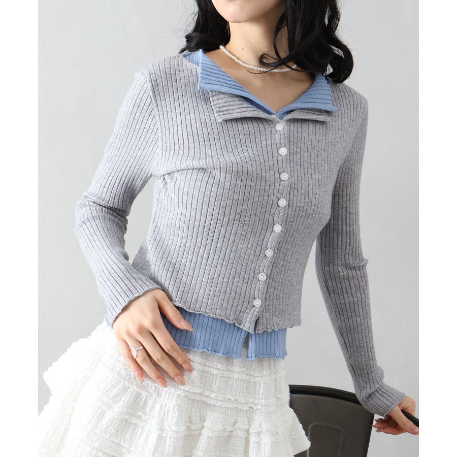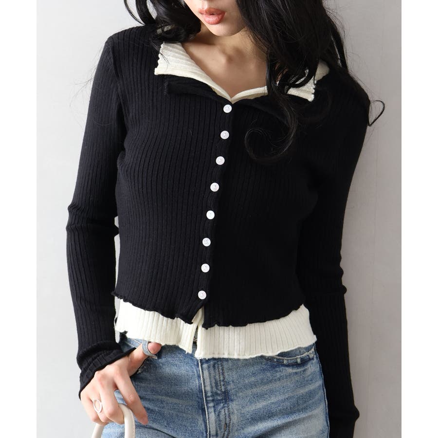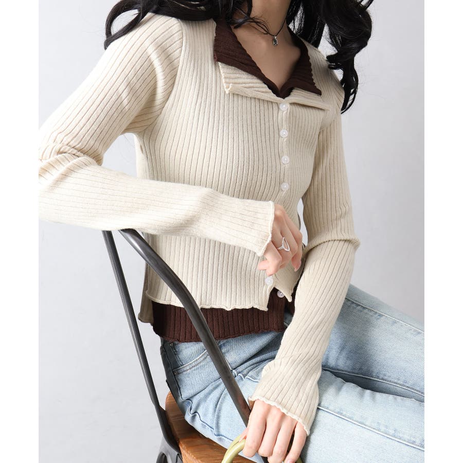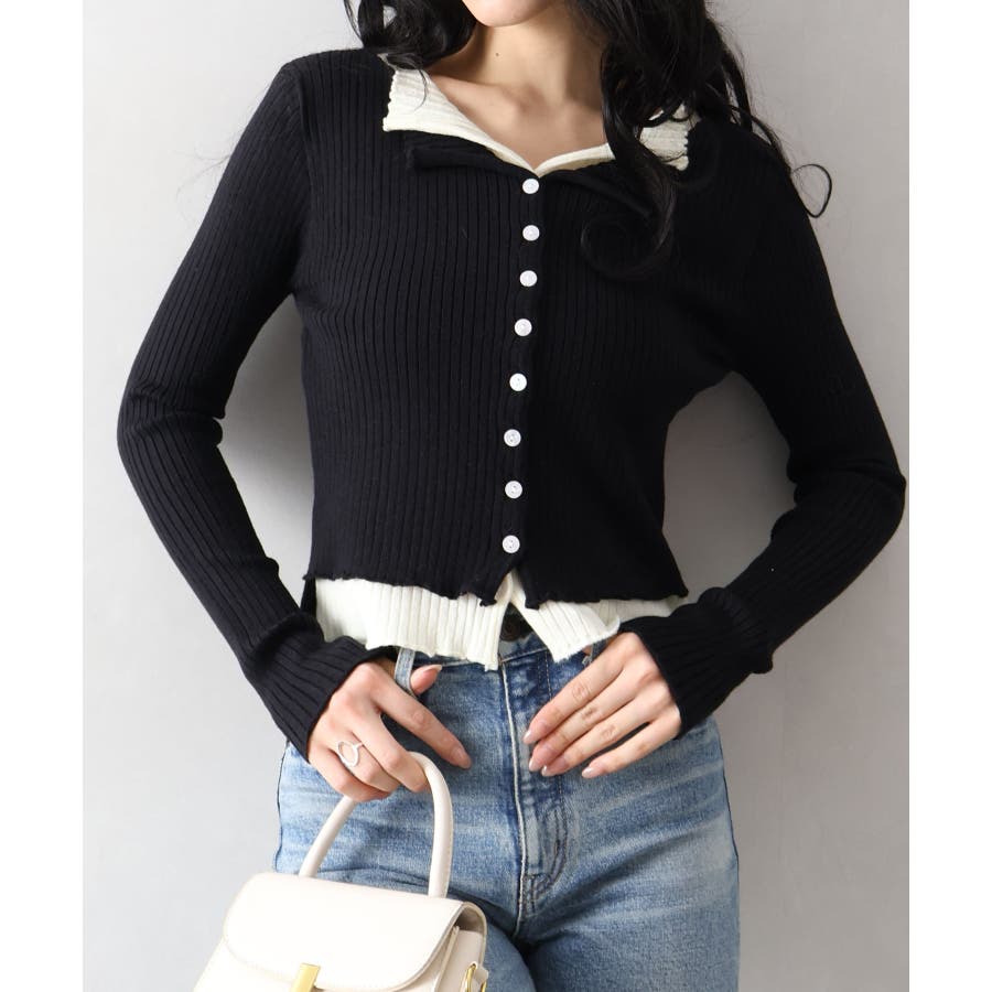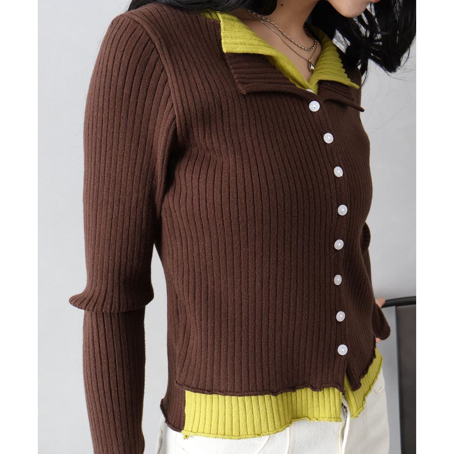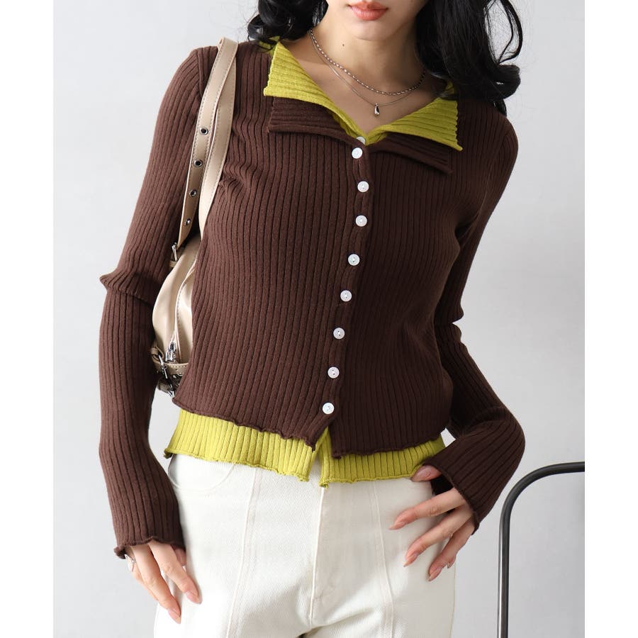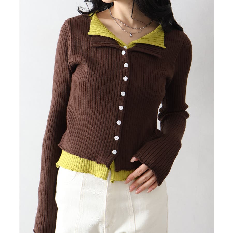 シンプルなのにコーデが一気にこなれる、レイヤード風デザインの配色リブニットトップス。