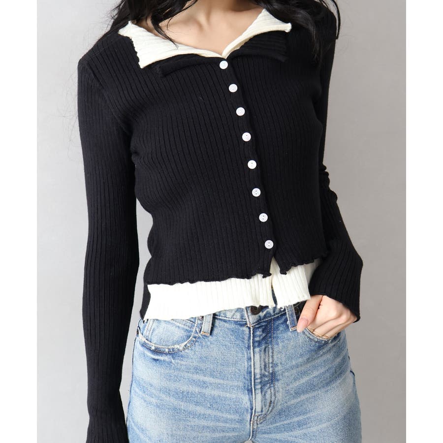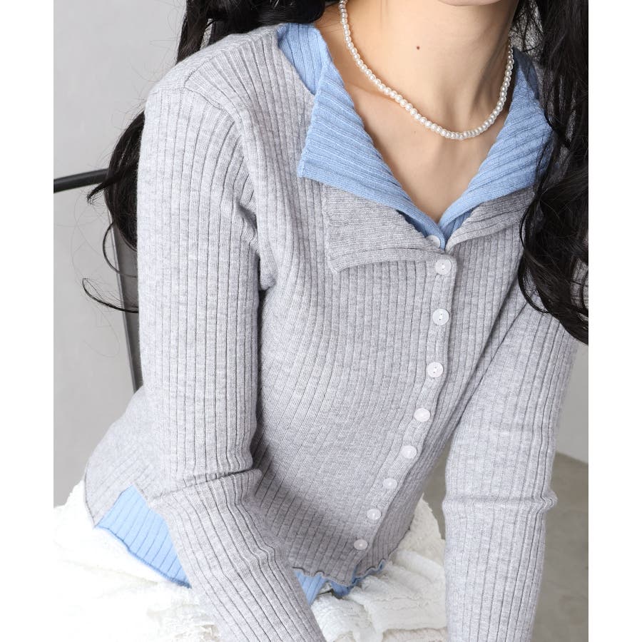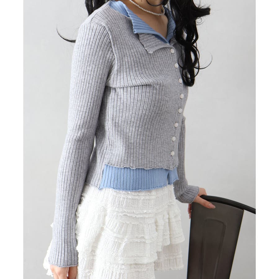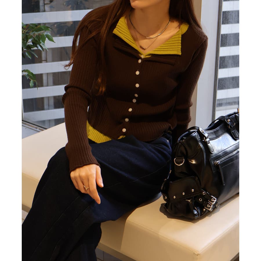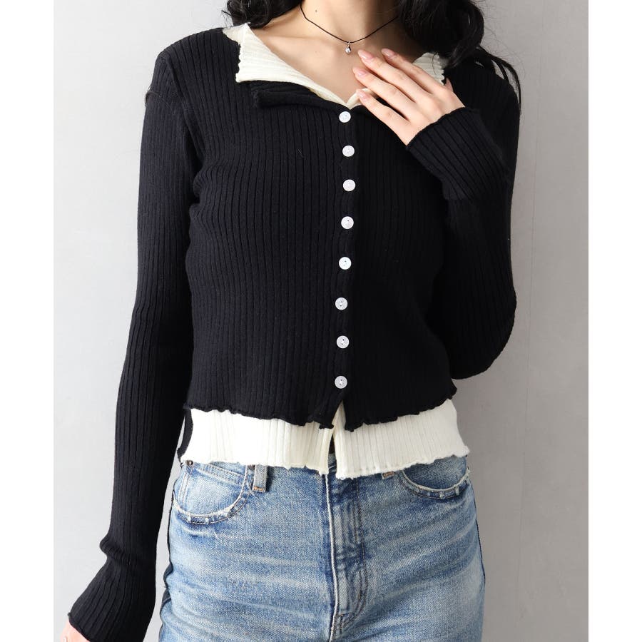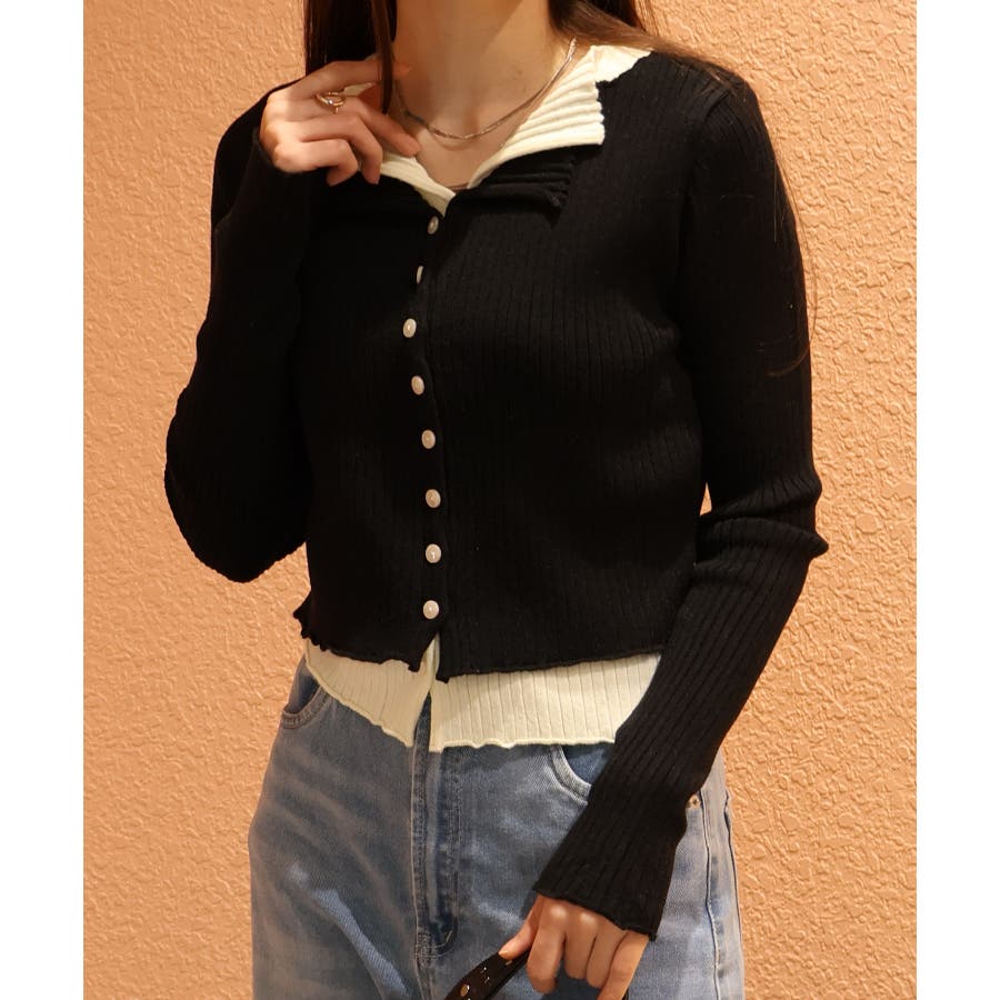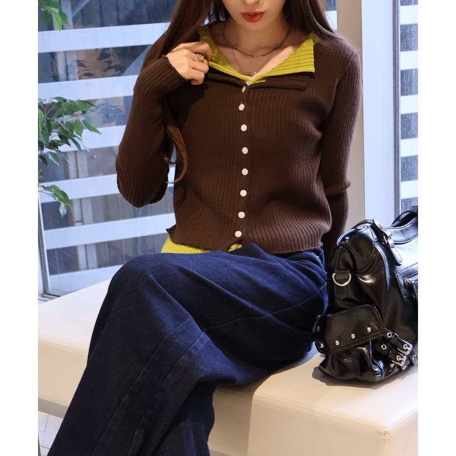 シンプルなのにコーデが一気にこなれる、レイヤード風デザインの配色リブニットトップス。