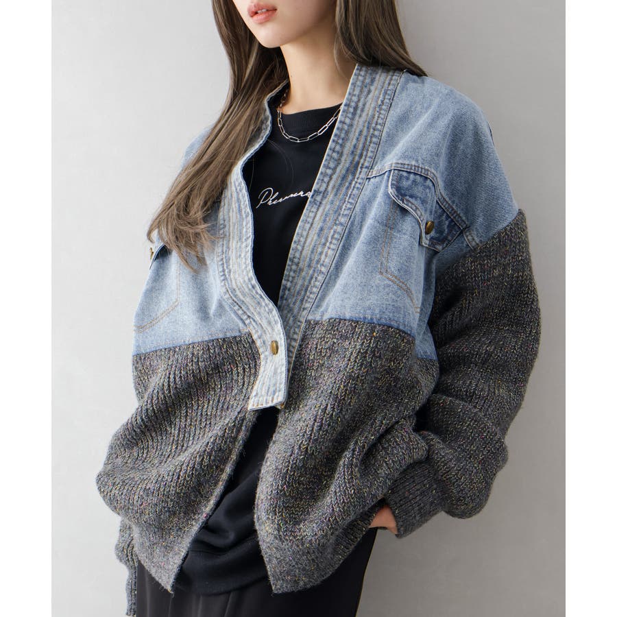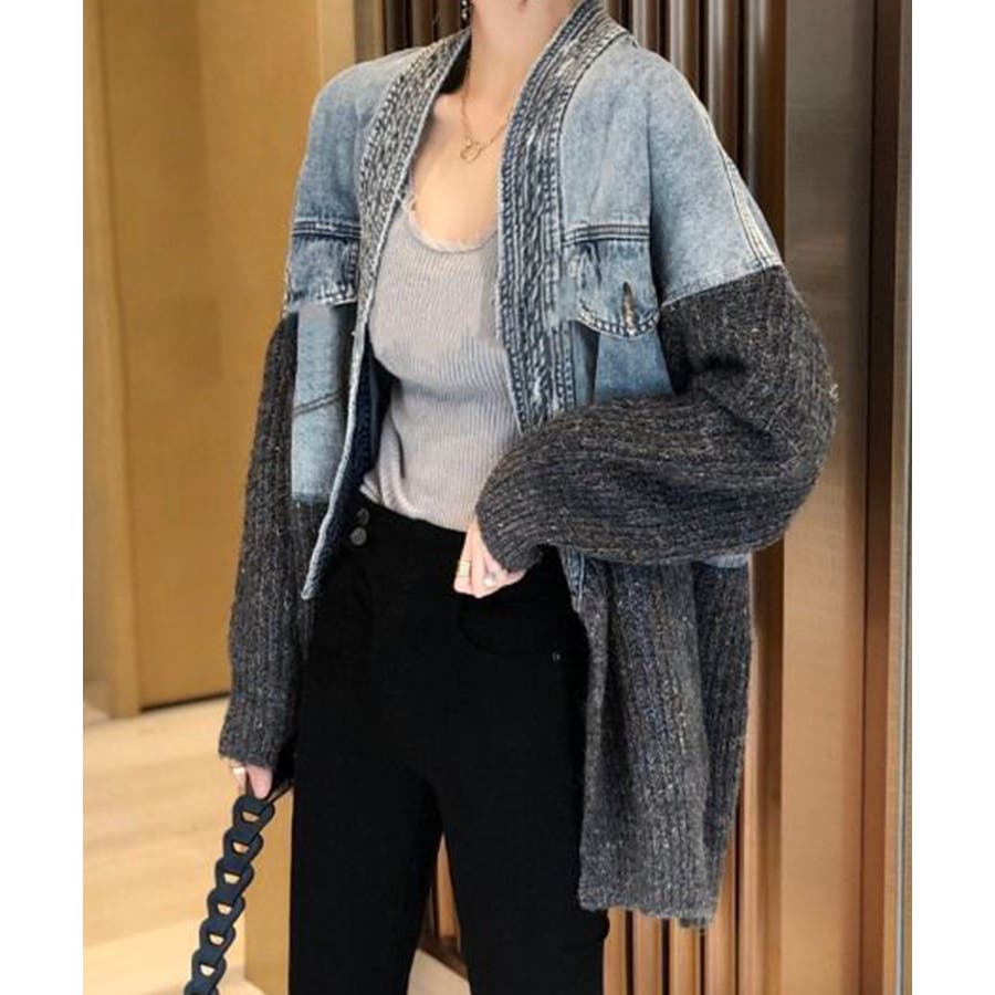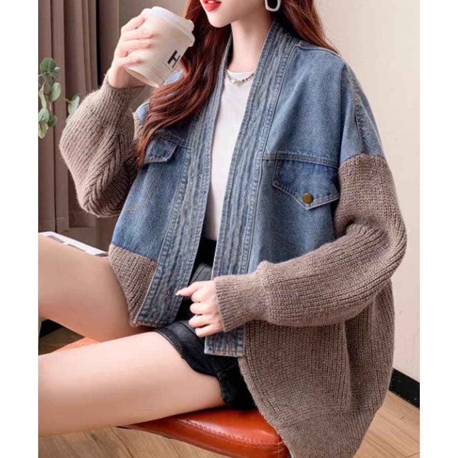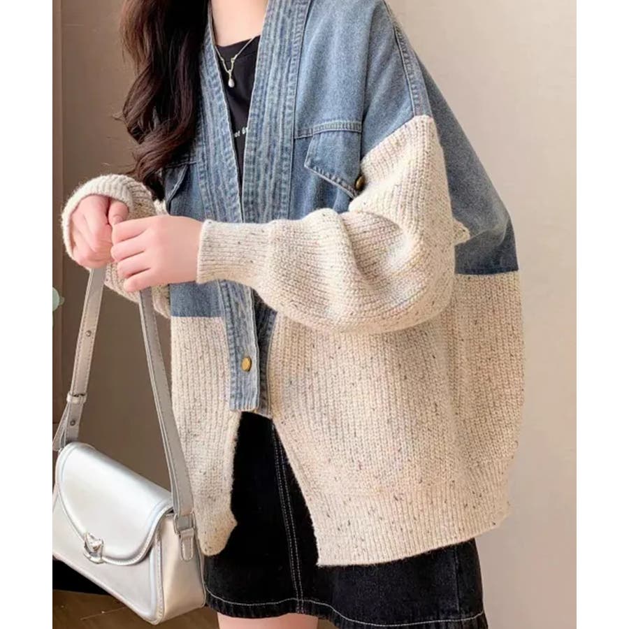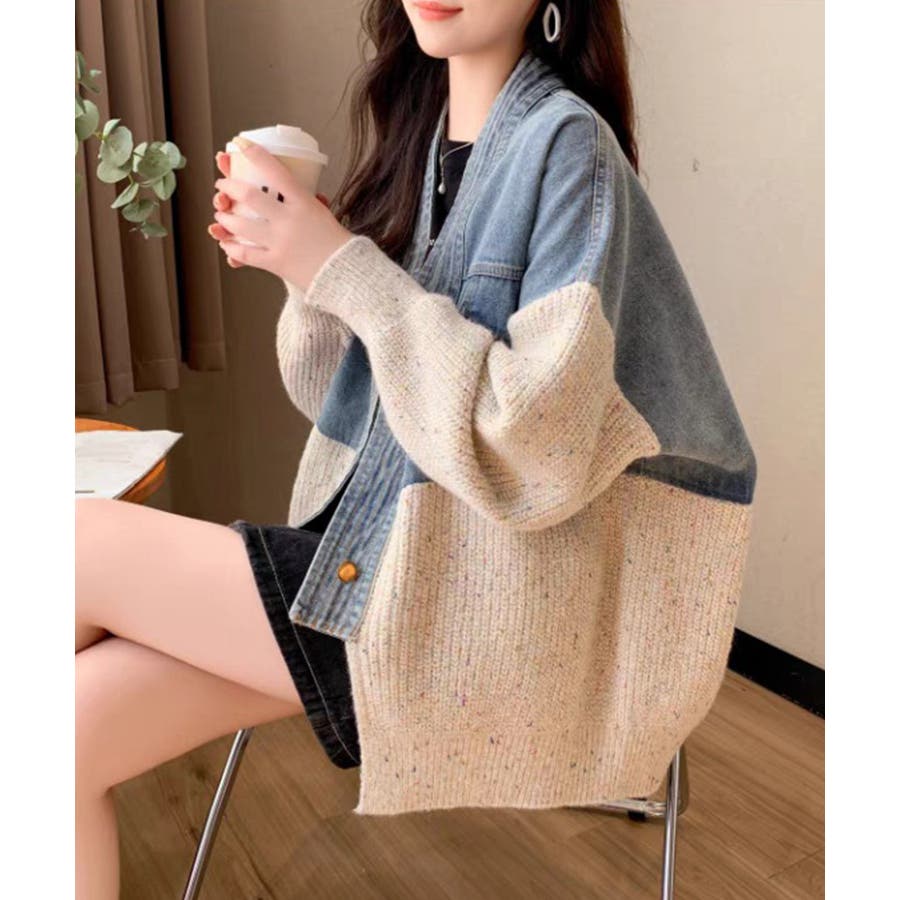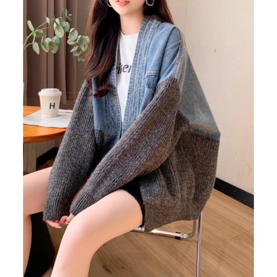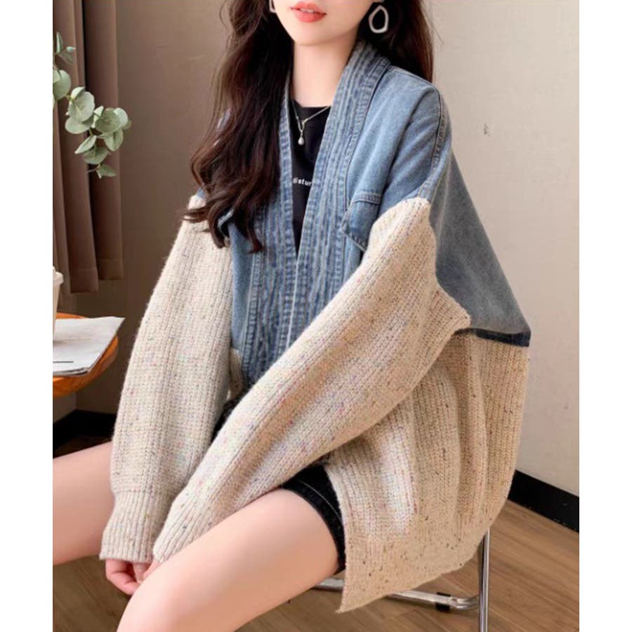 デニム切替ニットカーディガン