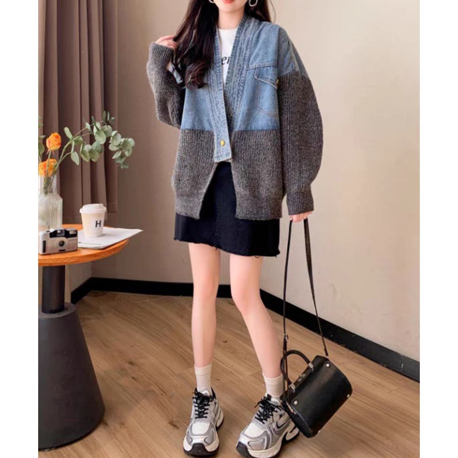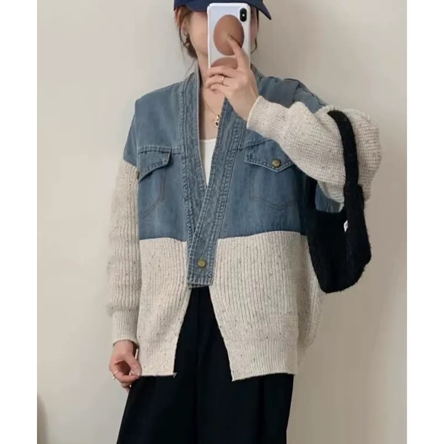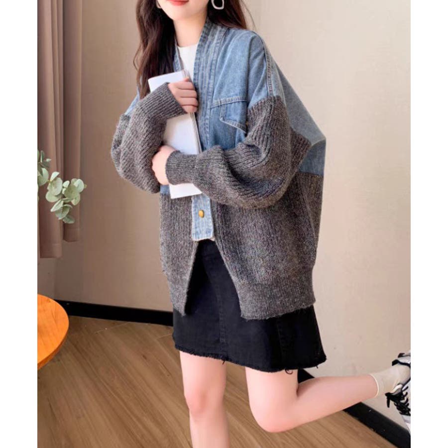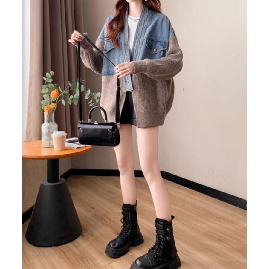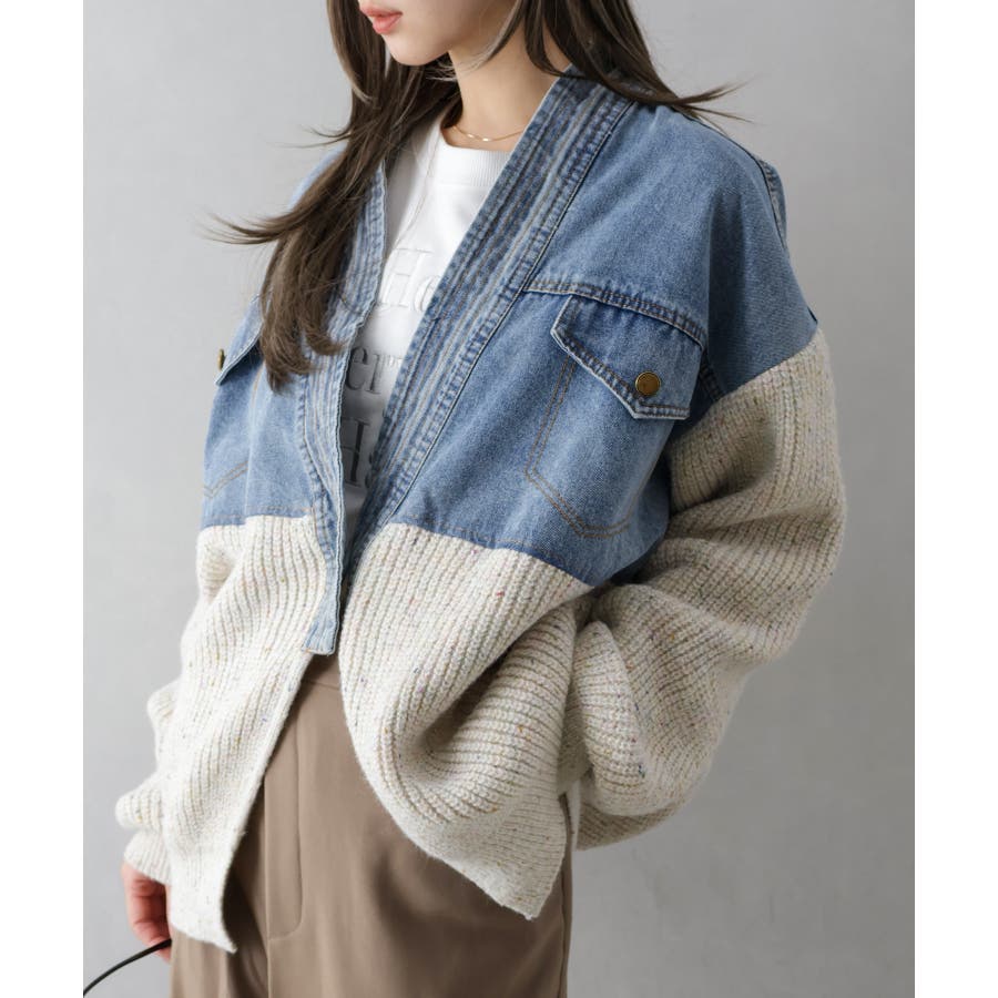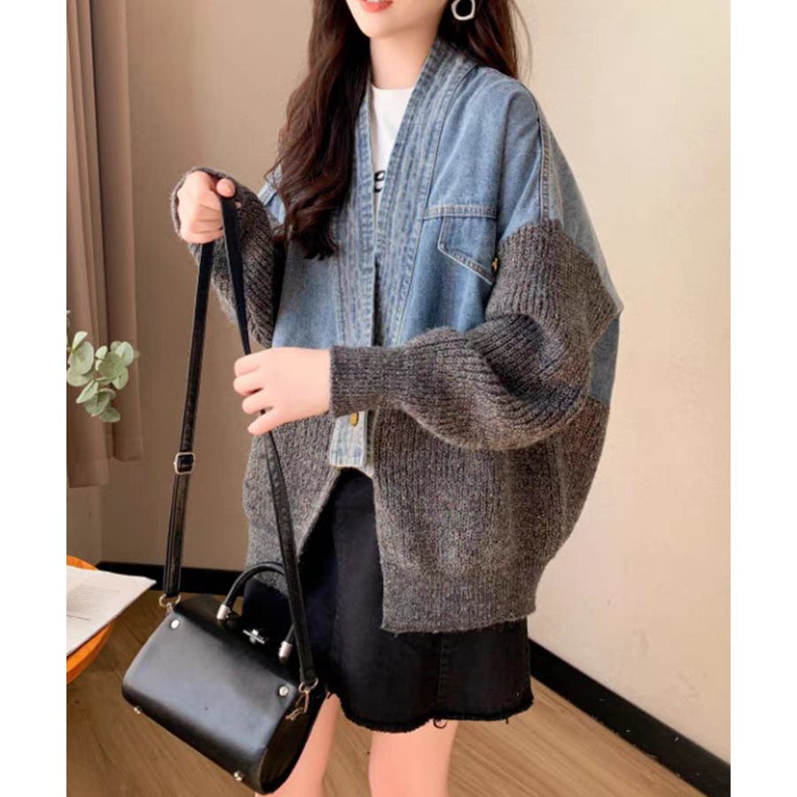 デニム切替ニットカーディガン