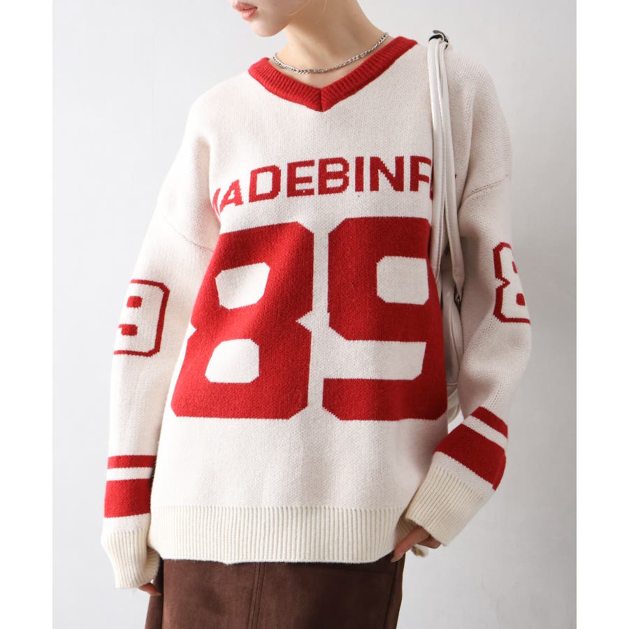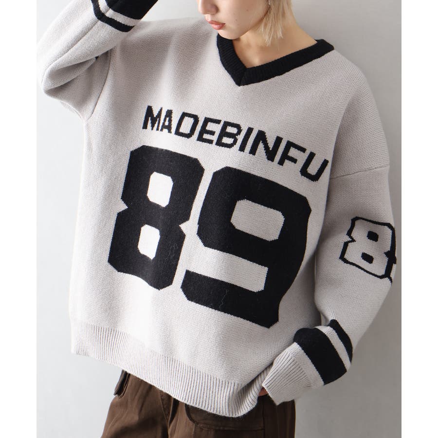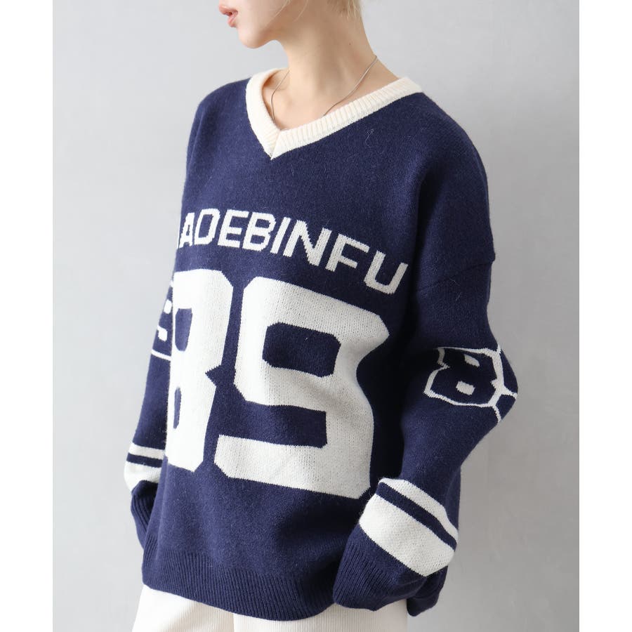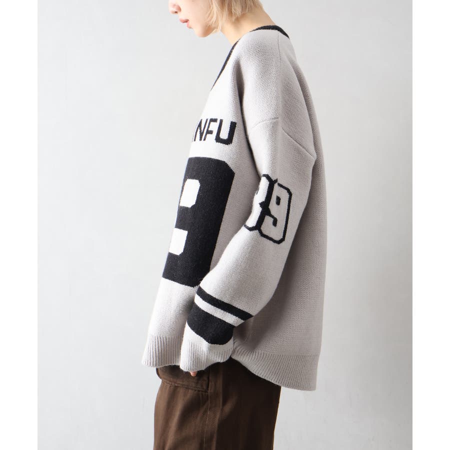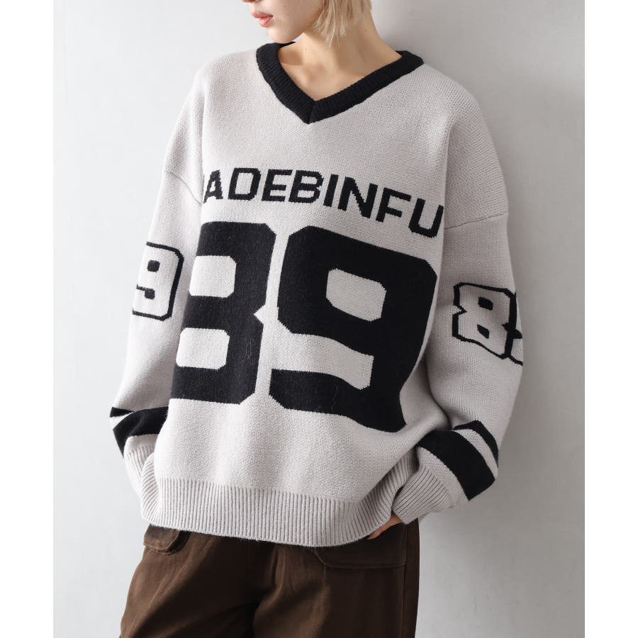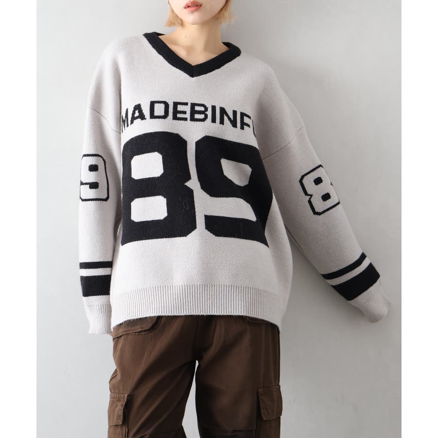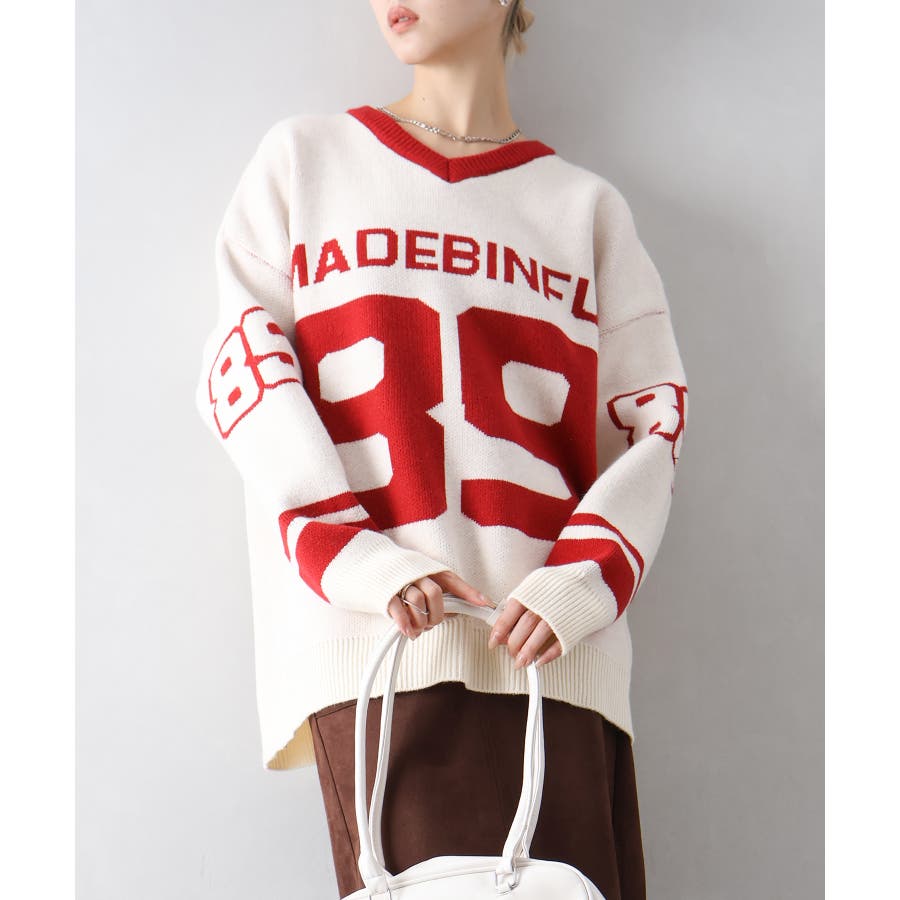 ヴィンテージライクなナンバリングデザインが目を惹く、VネックのBIGニット。
