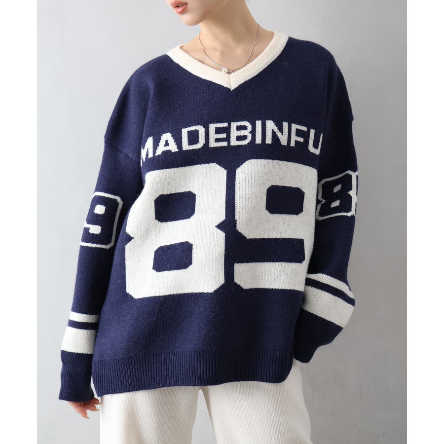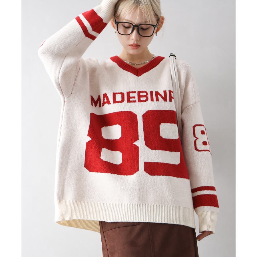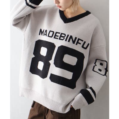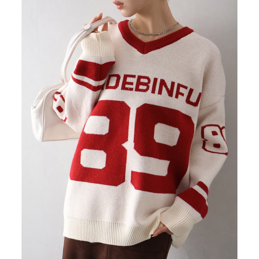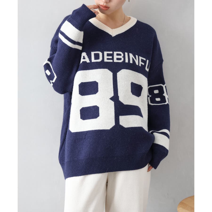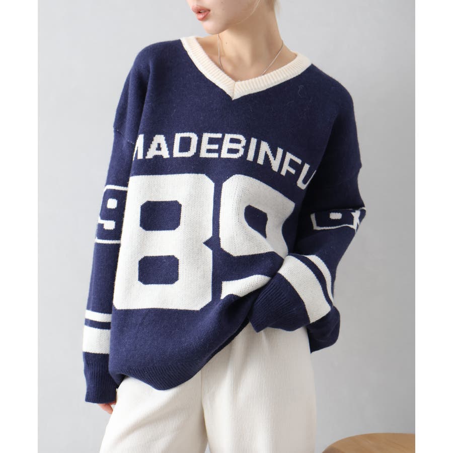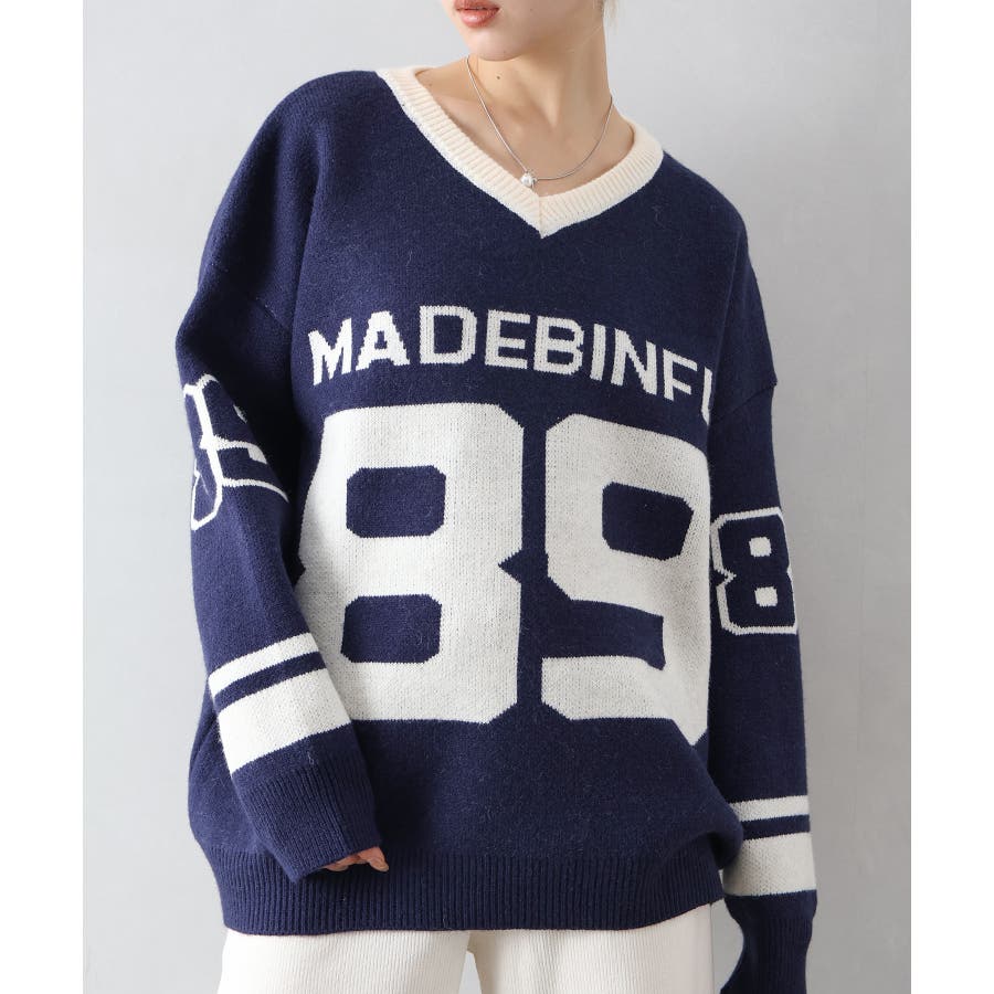 ヴィンテージライクなナンバリングデザインが目を惹く、VネックのBIGニット。