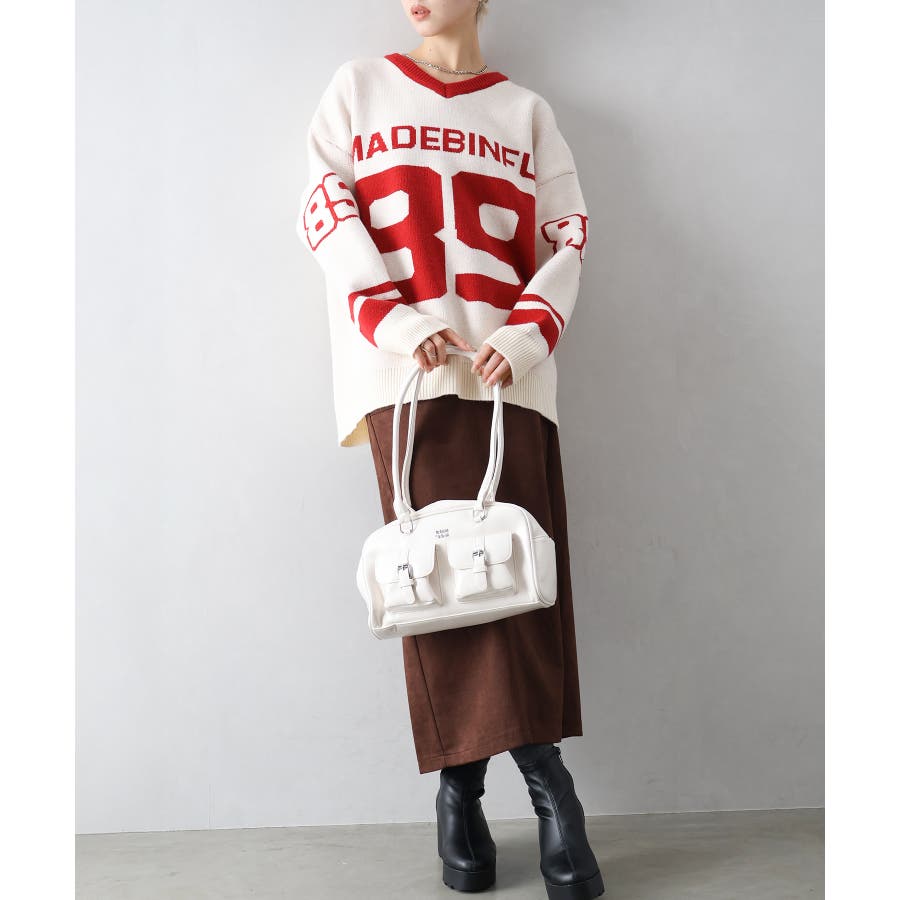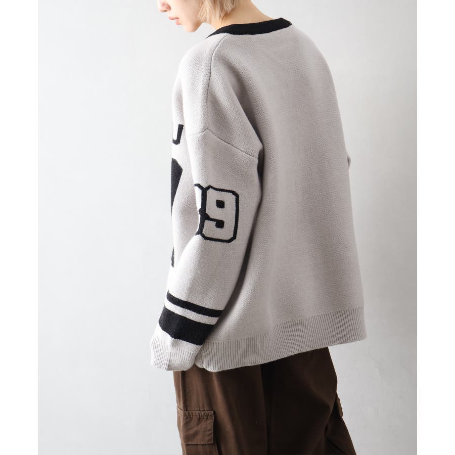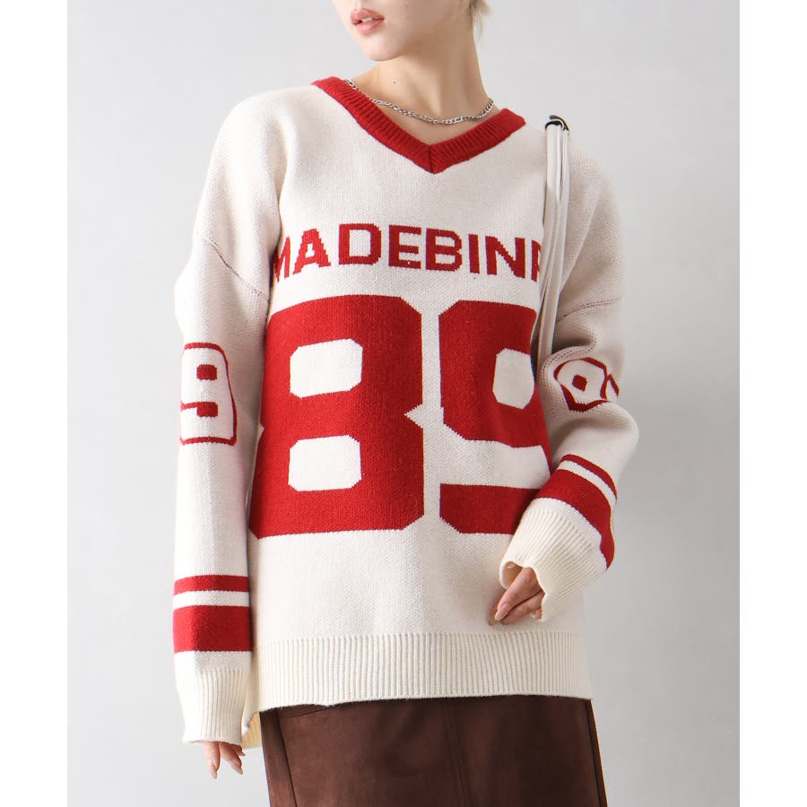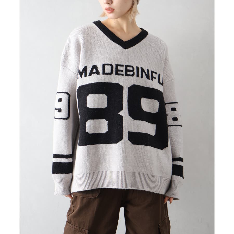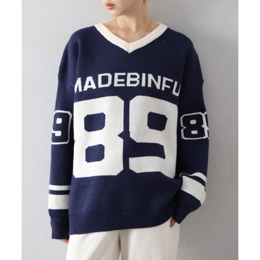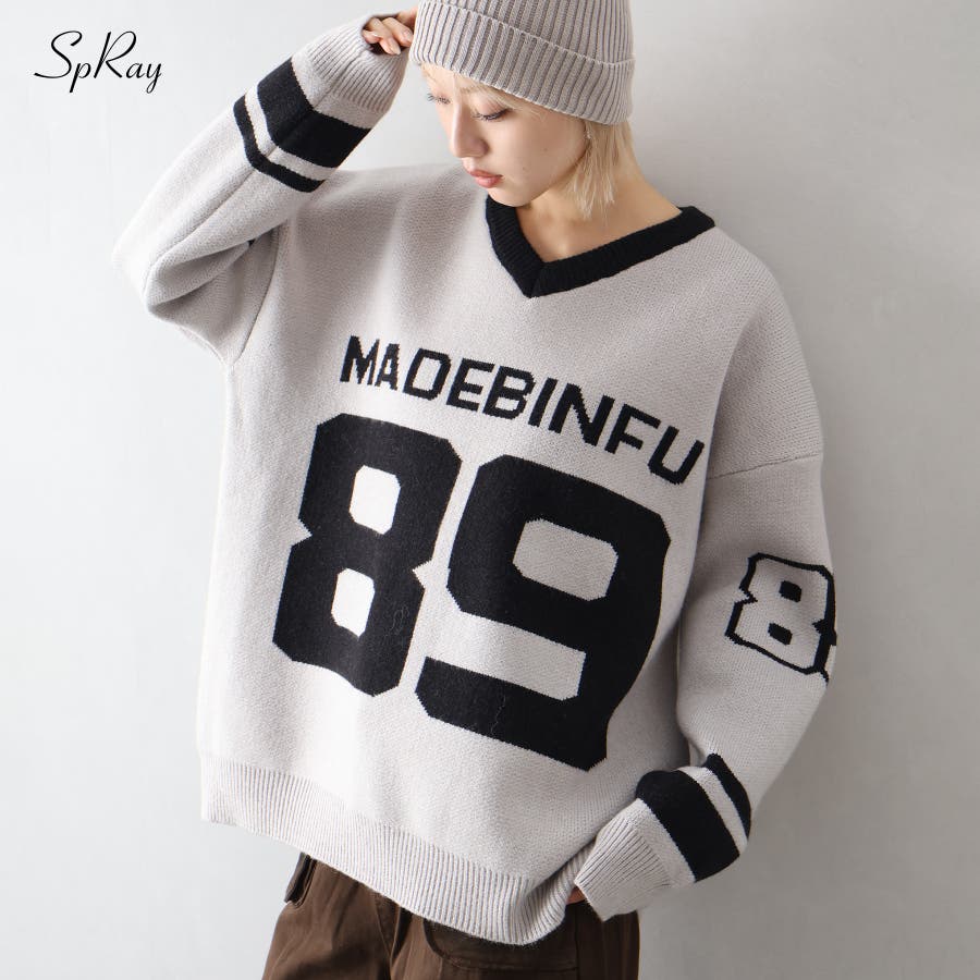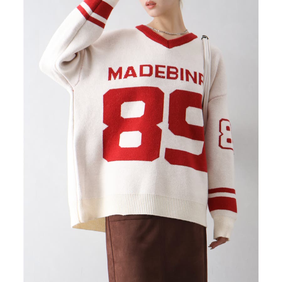 ヴィンテージライクなナンバリングデザインが目を惹く、VネックのBIGニット。