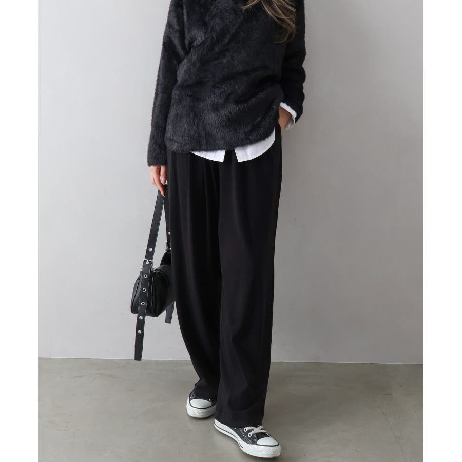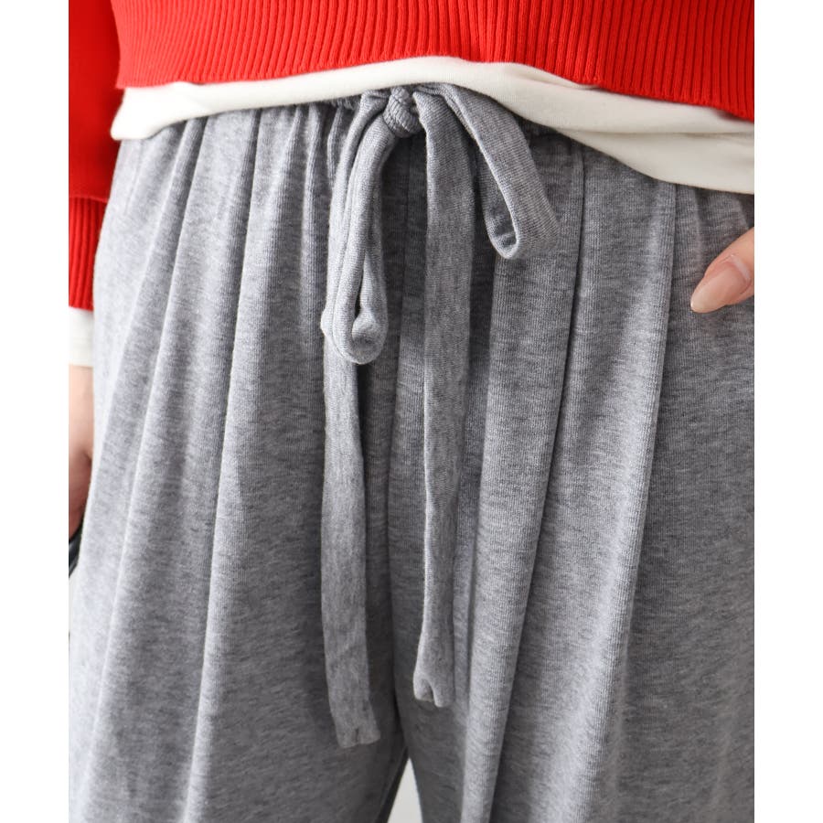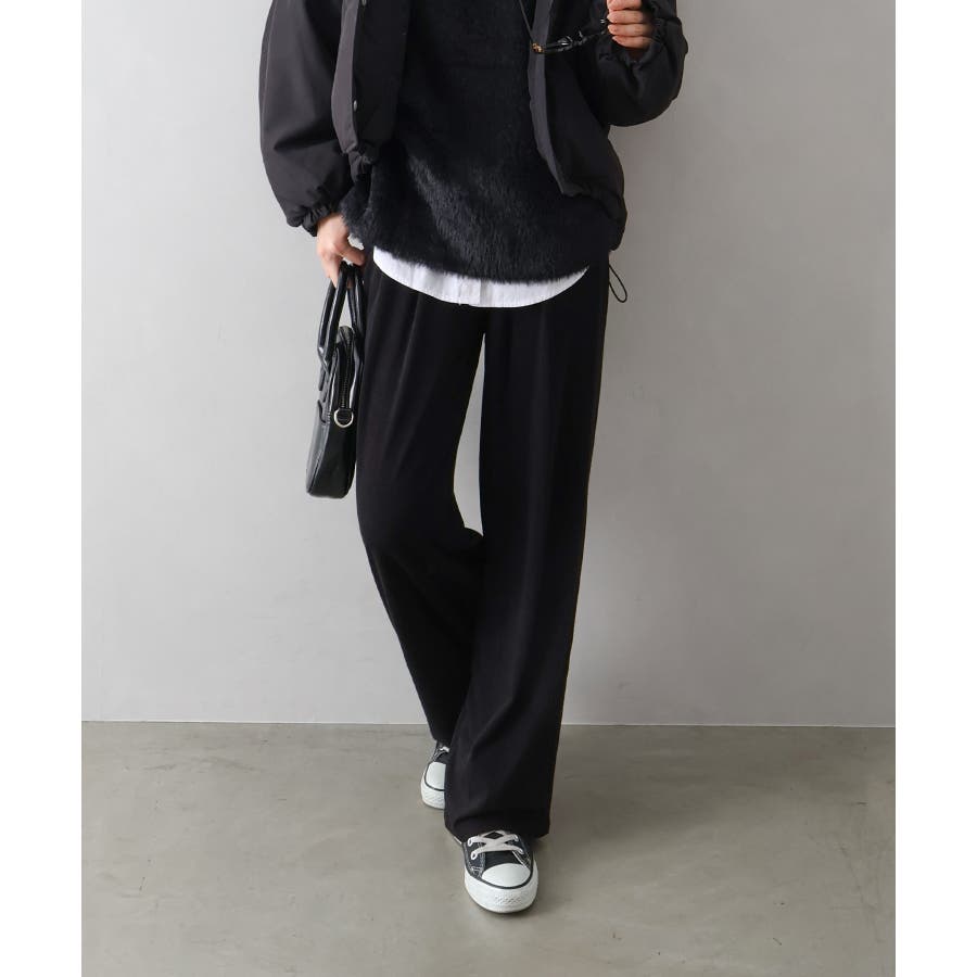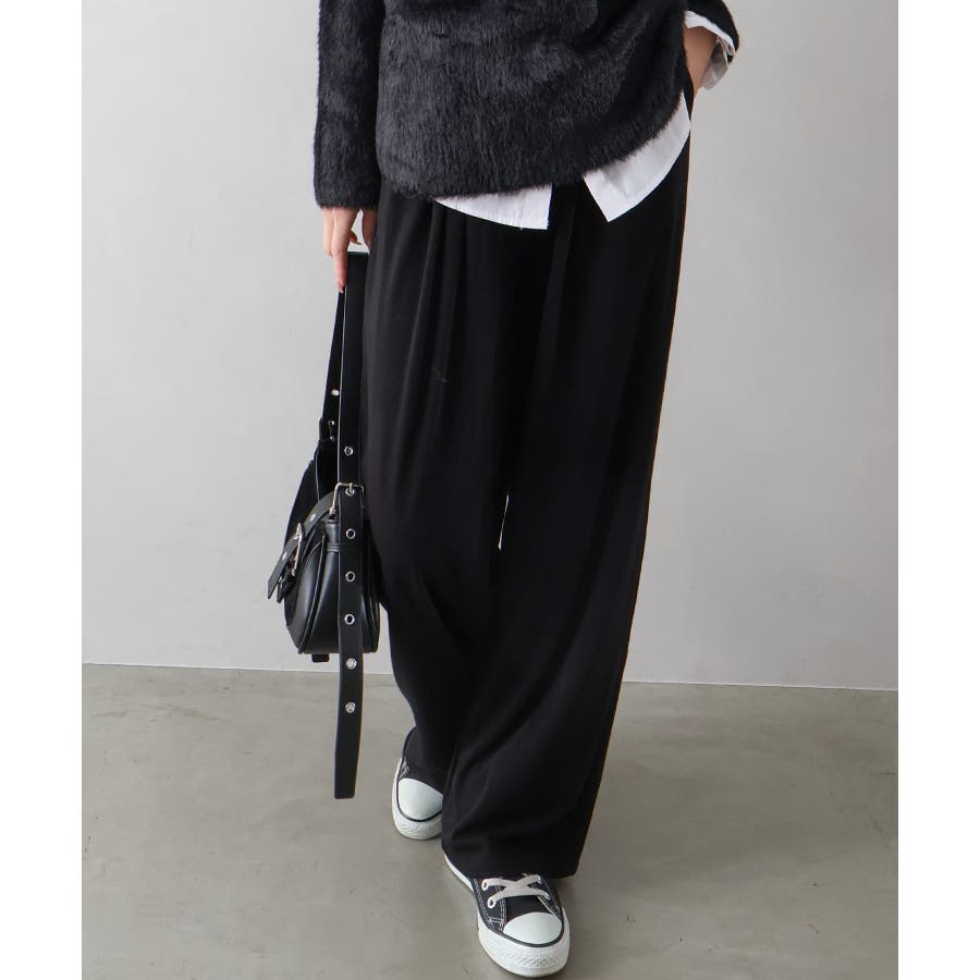 ウエストは総ゴム仕様でラクに履けるのに、落ち感のあるワイドラインが脚をまっすぐキレイに見せてくれるデザイン。