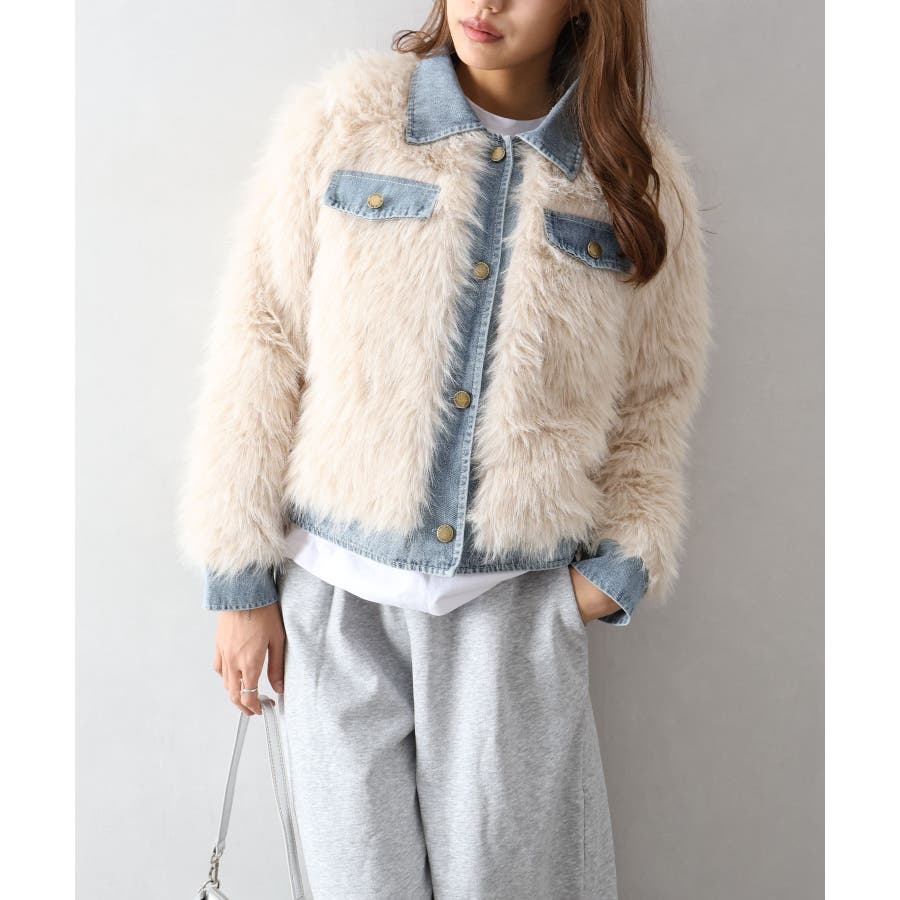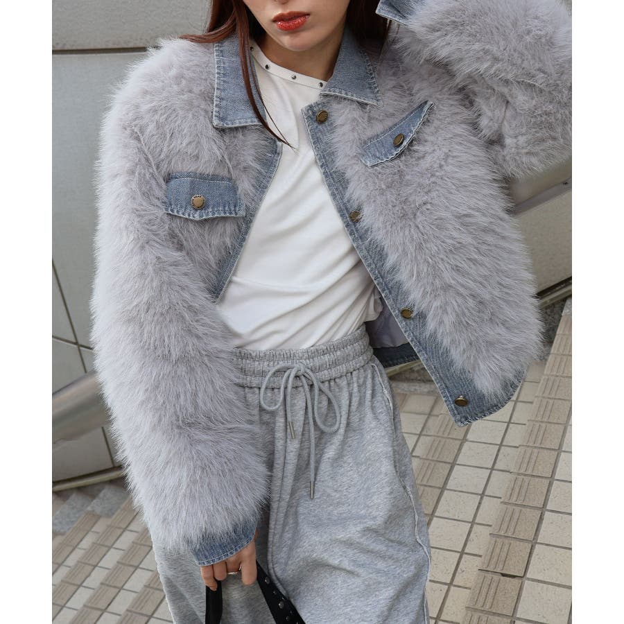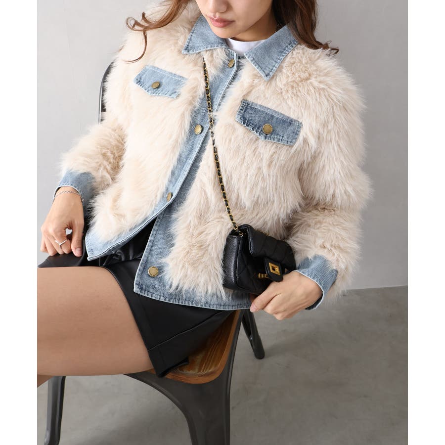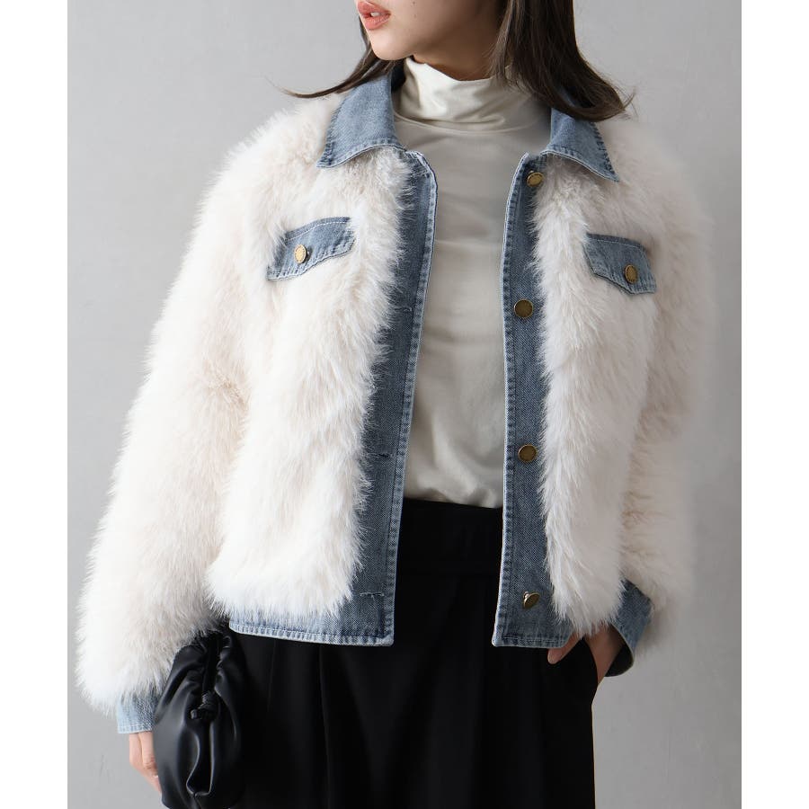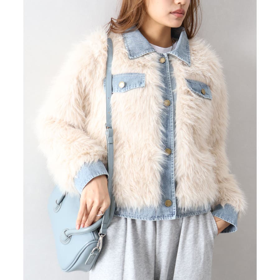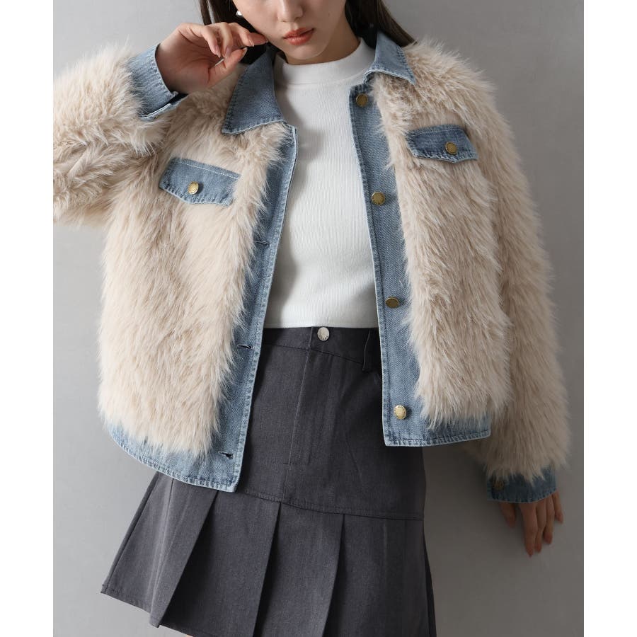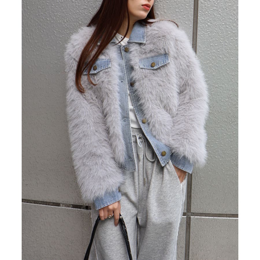 デニムジャケットにふわふわのフェイクファーを大胆にドッキングした、存在感抜群の切替ブルゾン。カジュアルなデニムと上品なファーが絶妙にマッチし、羽織るだけで“着映えコーデ”が完成します。