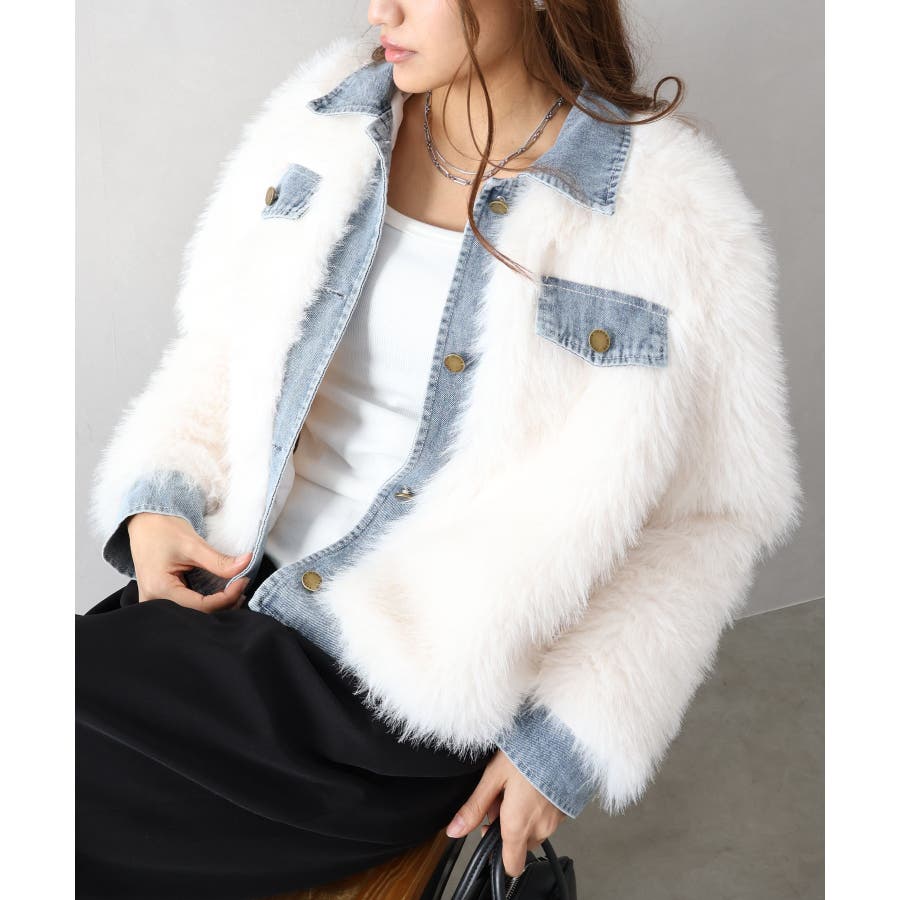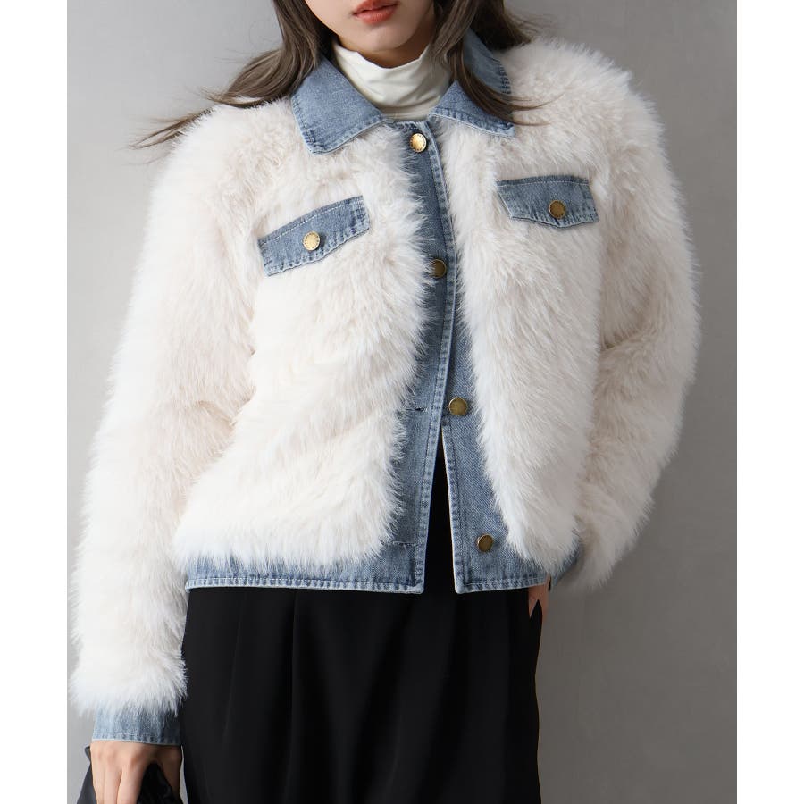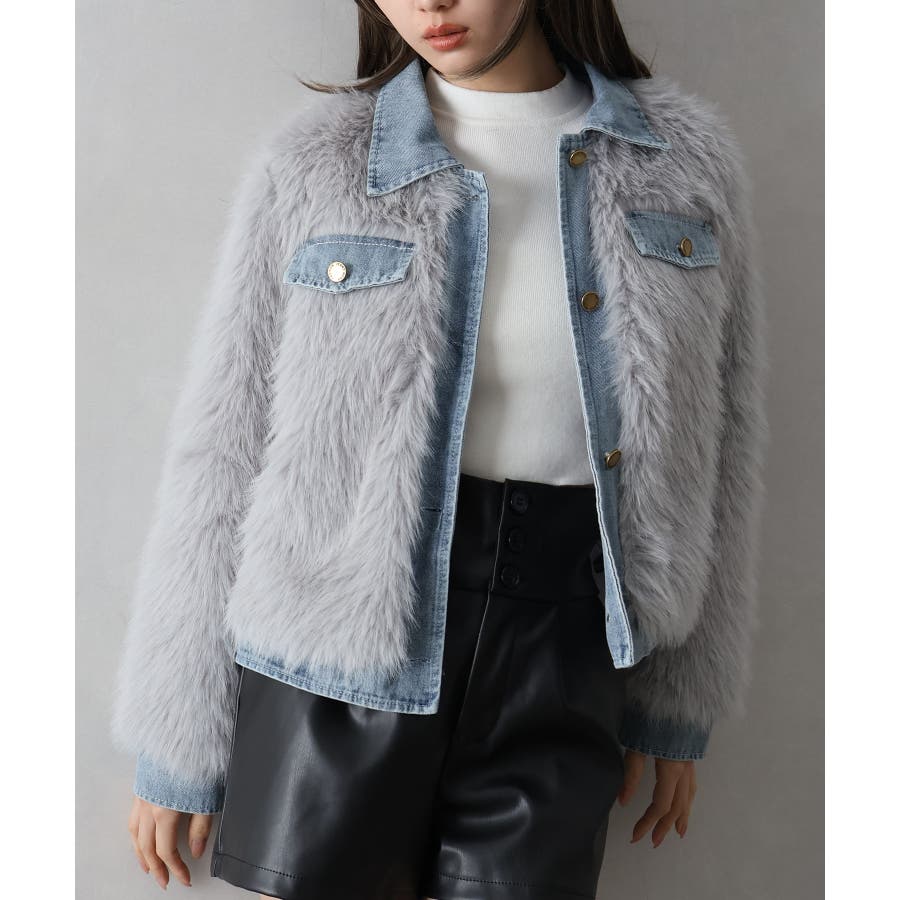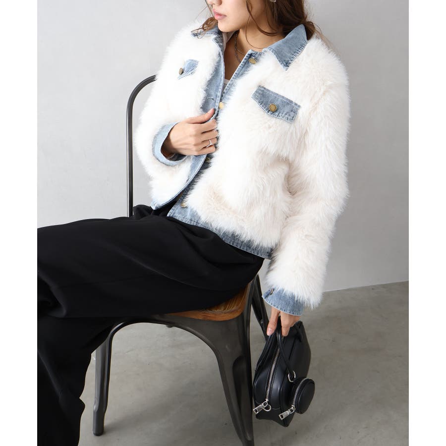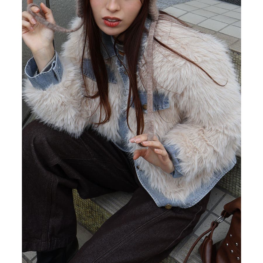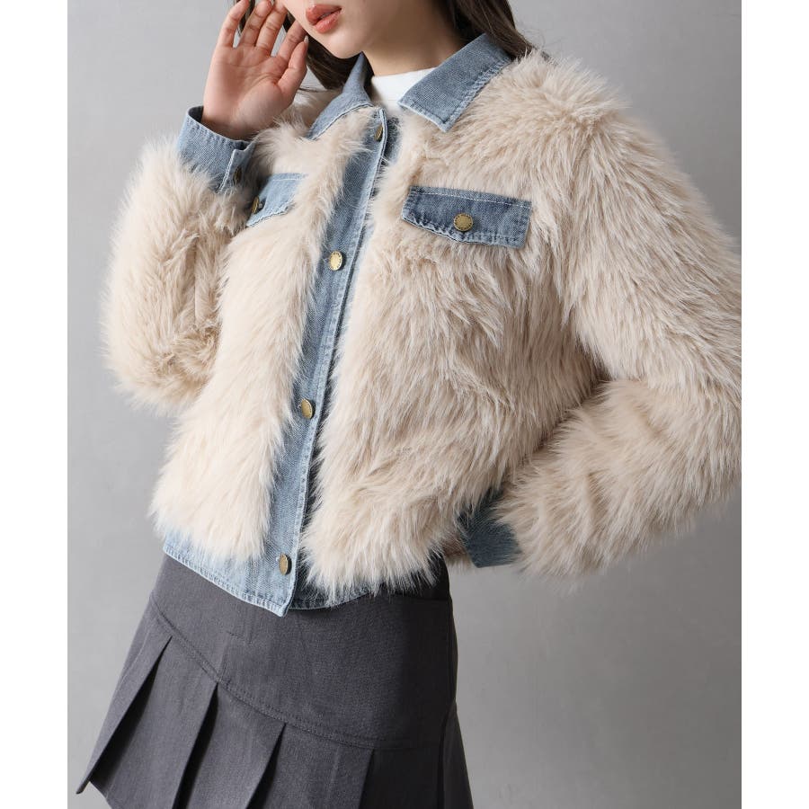 デニムジャケットにふわふわのフェイクファーを大胆にドッキングした、存在感抜群の切替ブルゾン。カジュアルなデニムと上品なファーが絶妙にマッチし、羽織るだけで“着映えコーデ”が完成します。