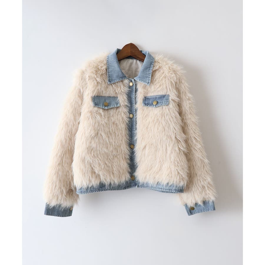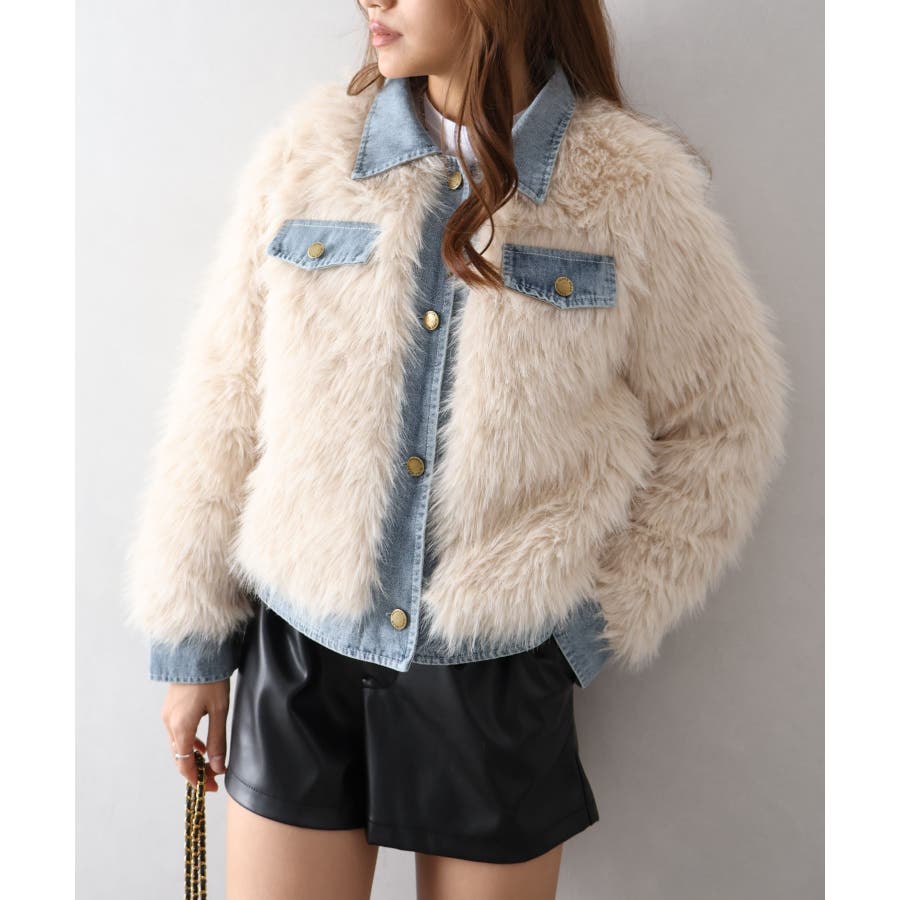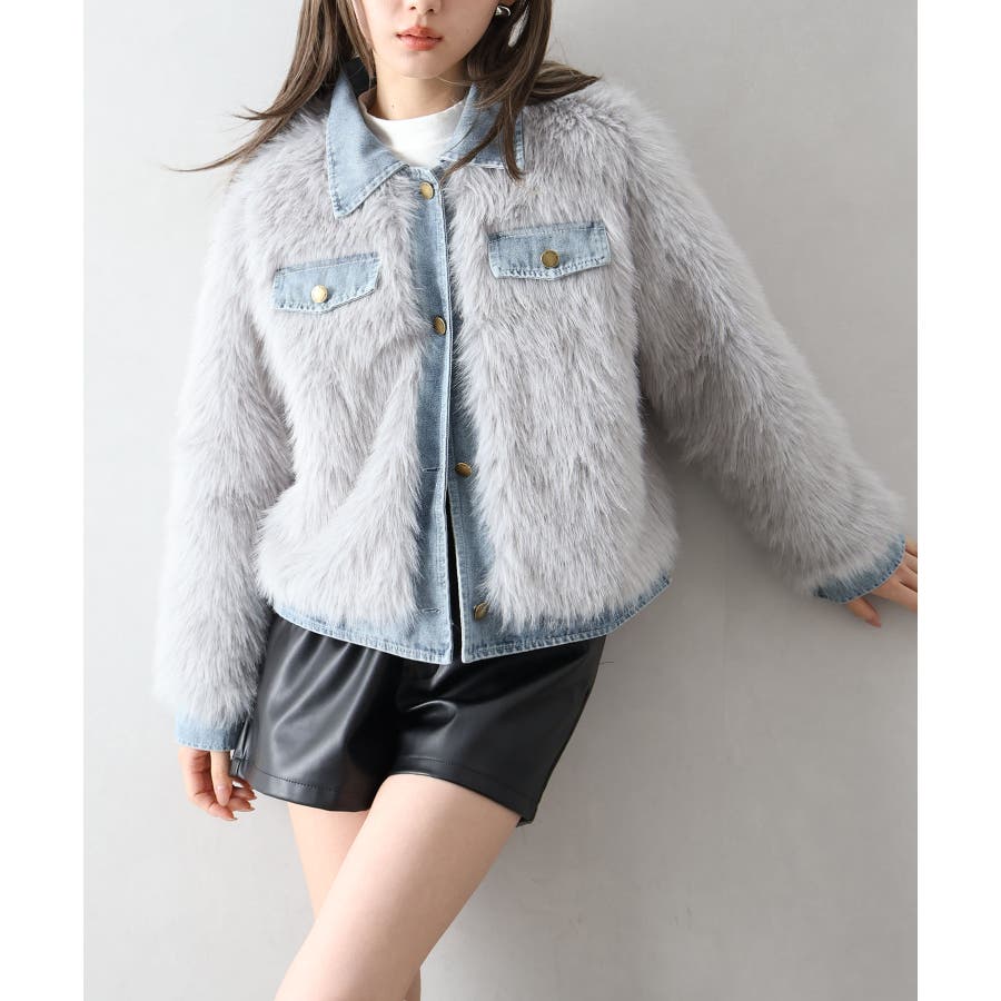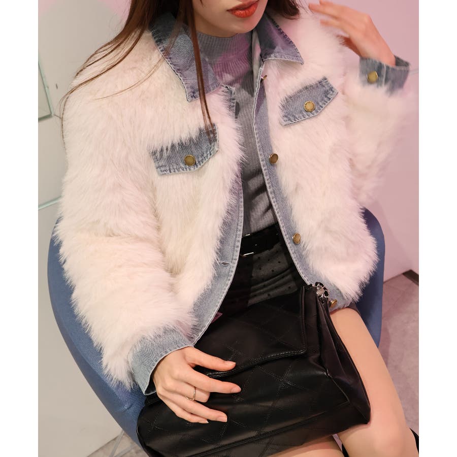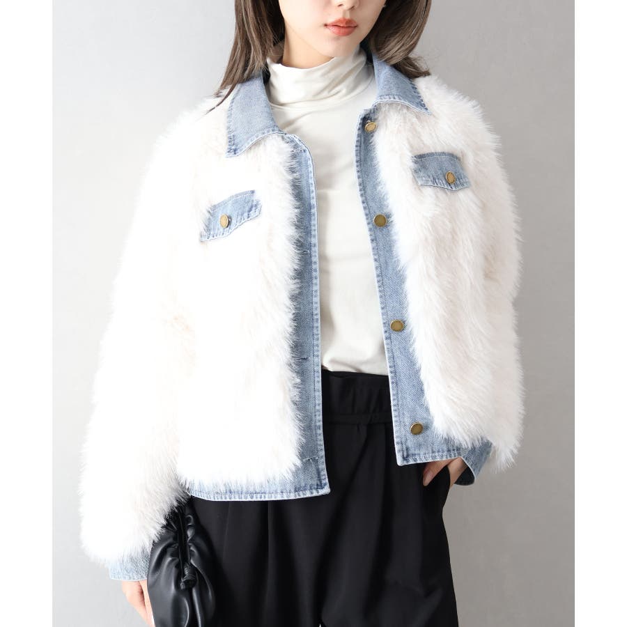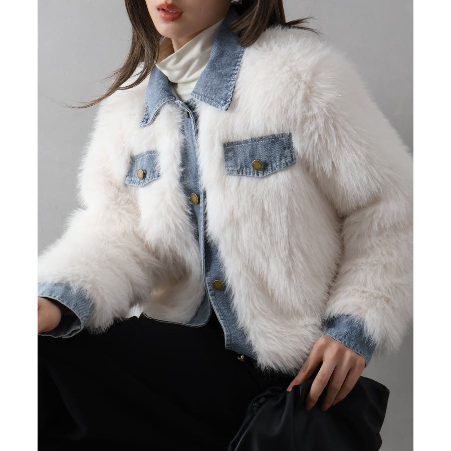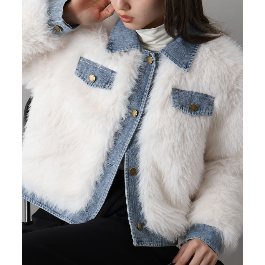 デニムジャケットにふわふわのフェイクファーを大胆にドッキングした、存在感抜群の切替ブルゾン。カジュアルなデニムと上品なファーが絶妙にマッチし、羽織るだけで“着映えコーデ”が完成します。