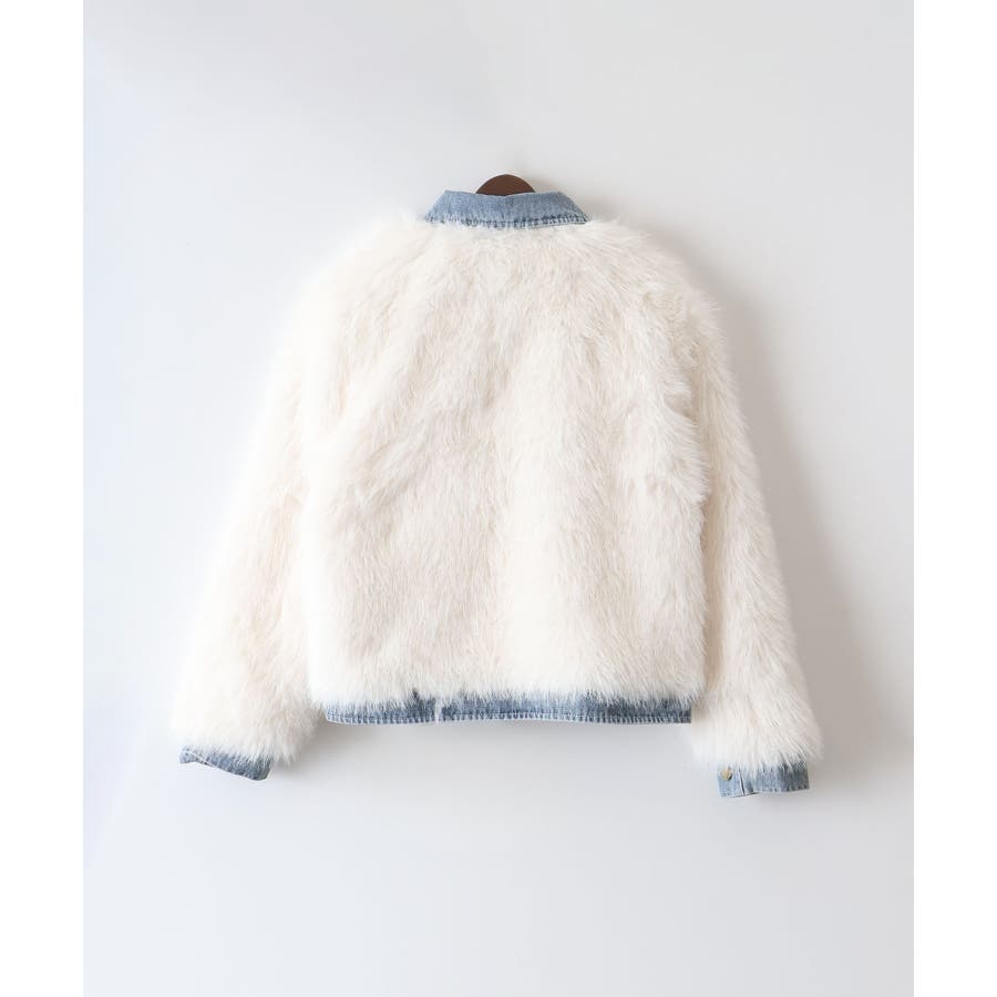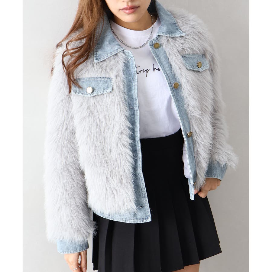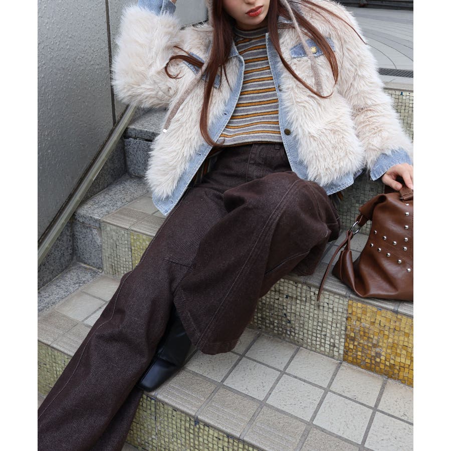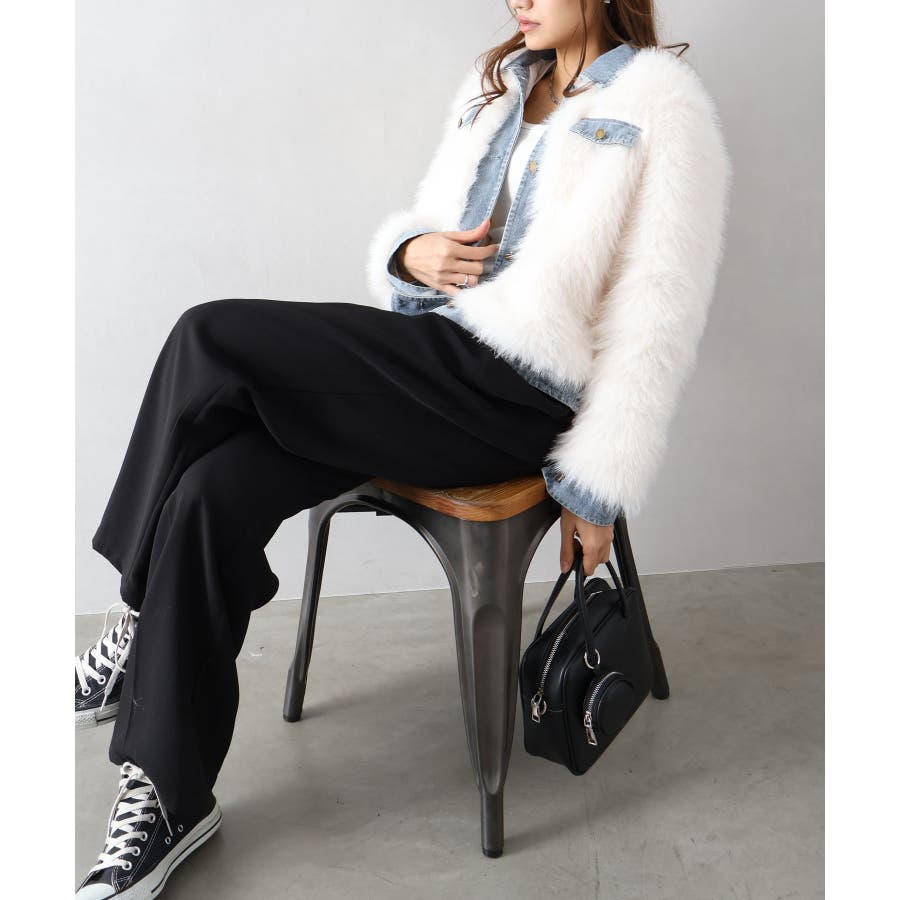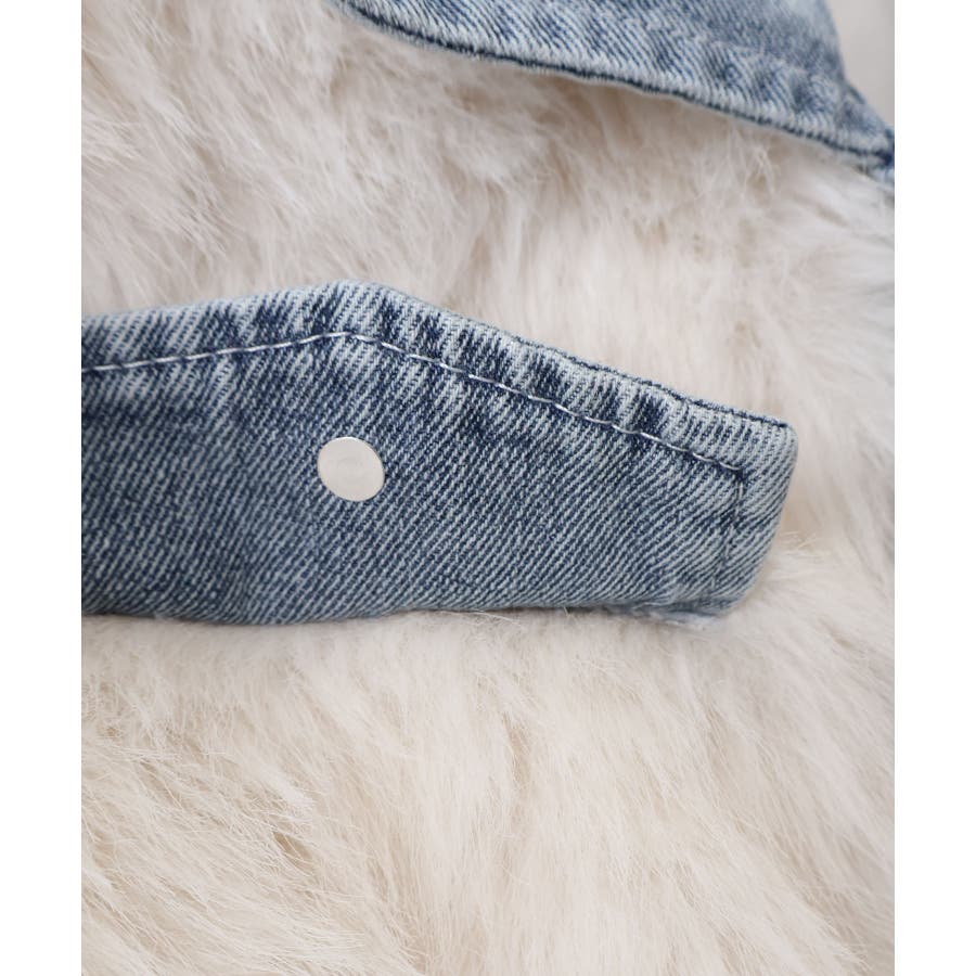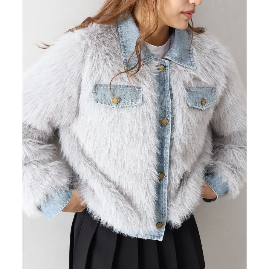 デニムジャケットにふわふわのフェイクファーを大胆にドッキングした、存在感抜群の切替ブルゾン。カジュアルなデニムと上品なファーが絶妙にマッチし、羽織るだけで“着映えコーデ”が完成します。