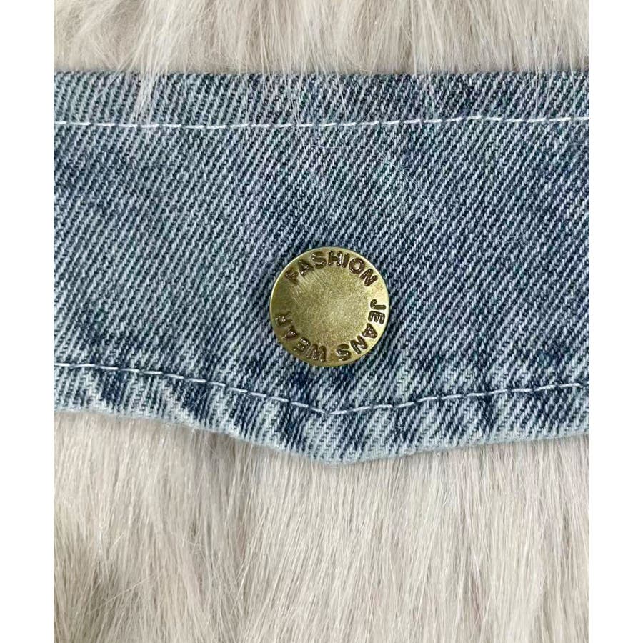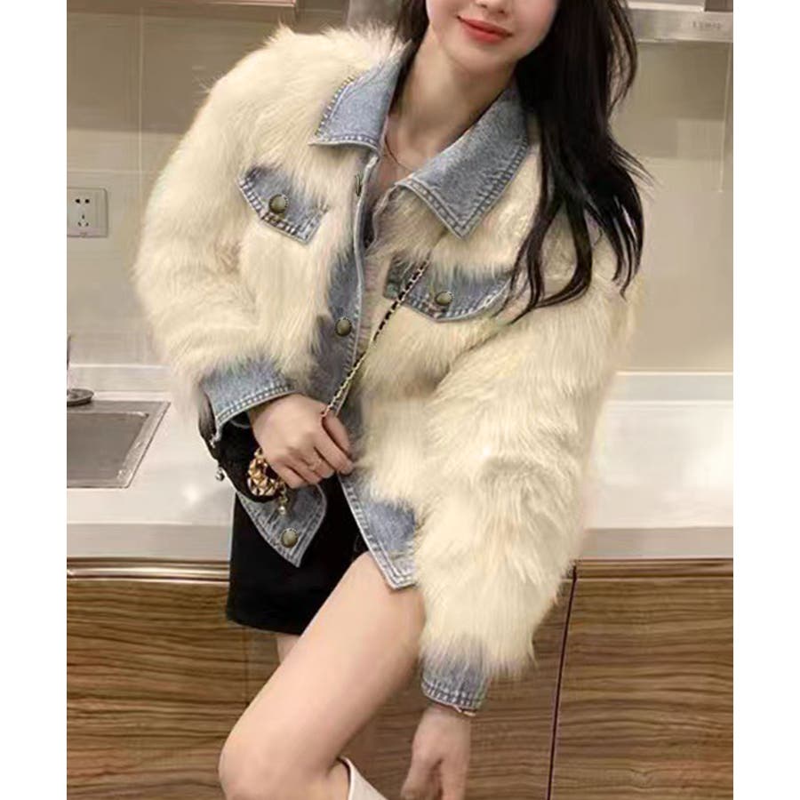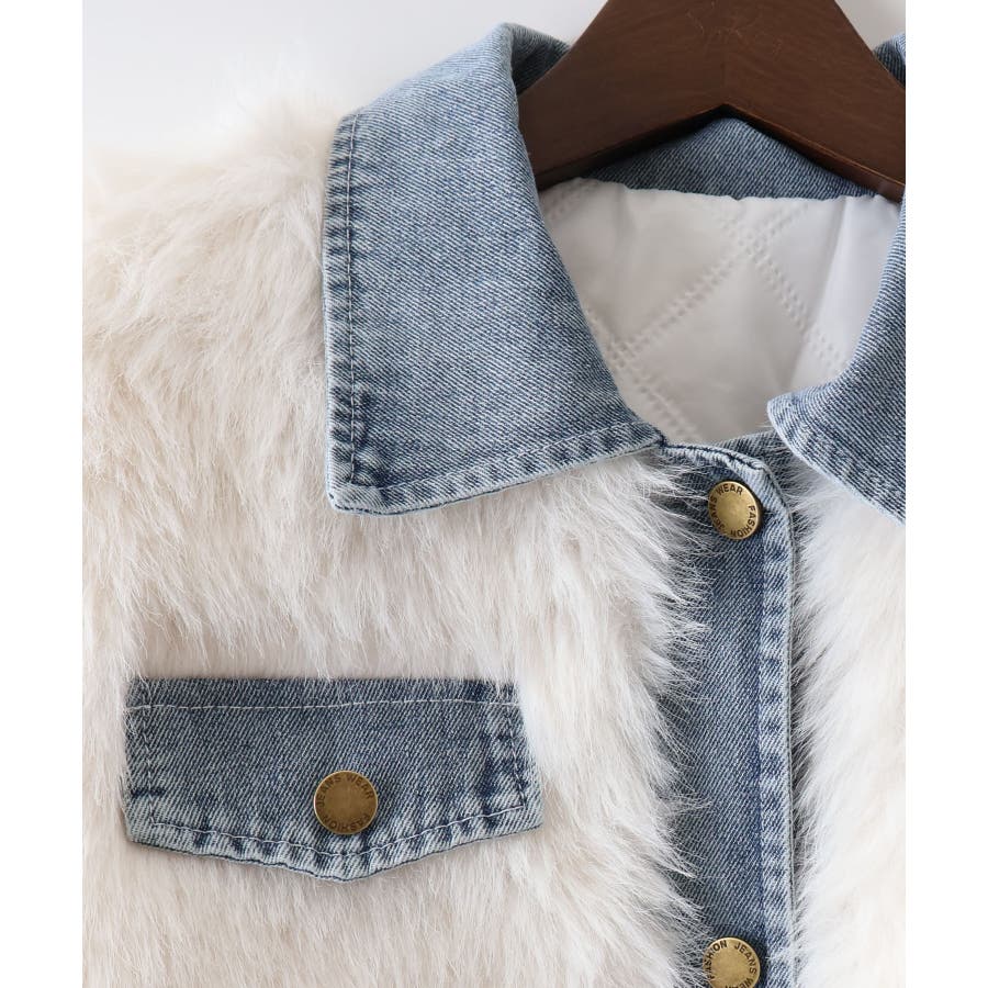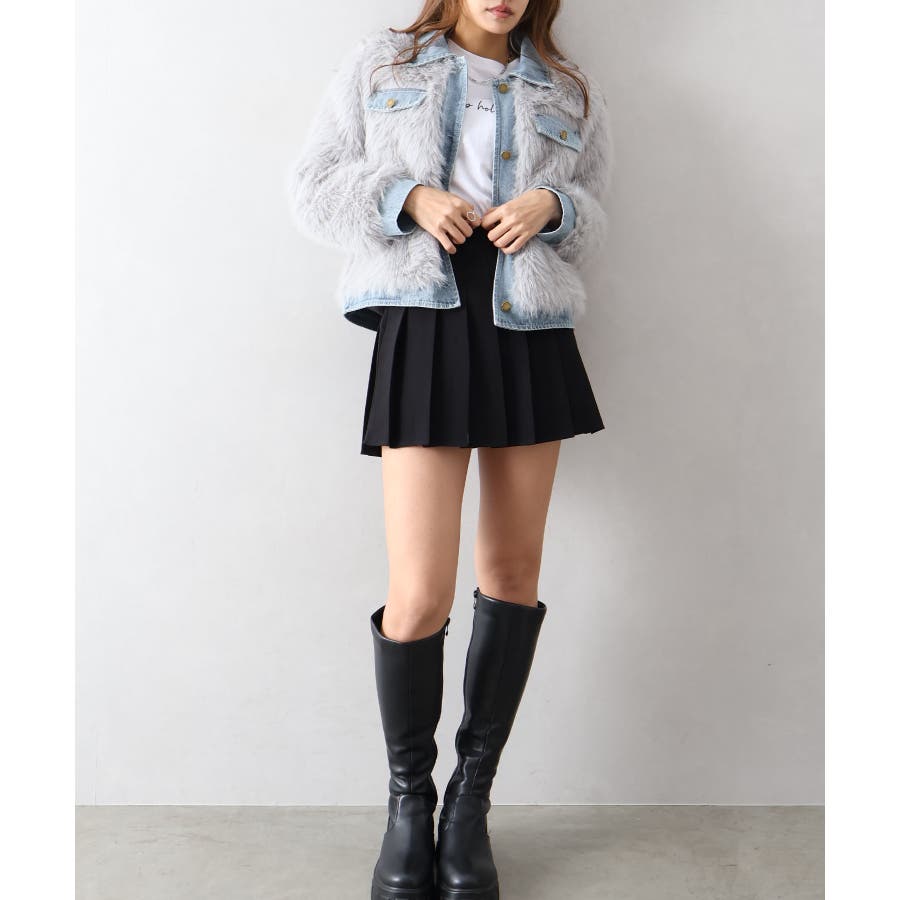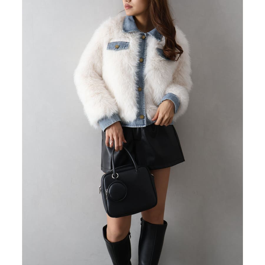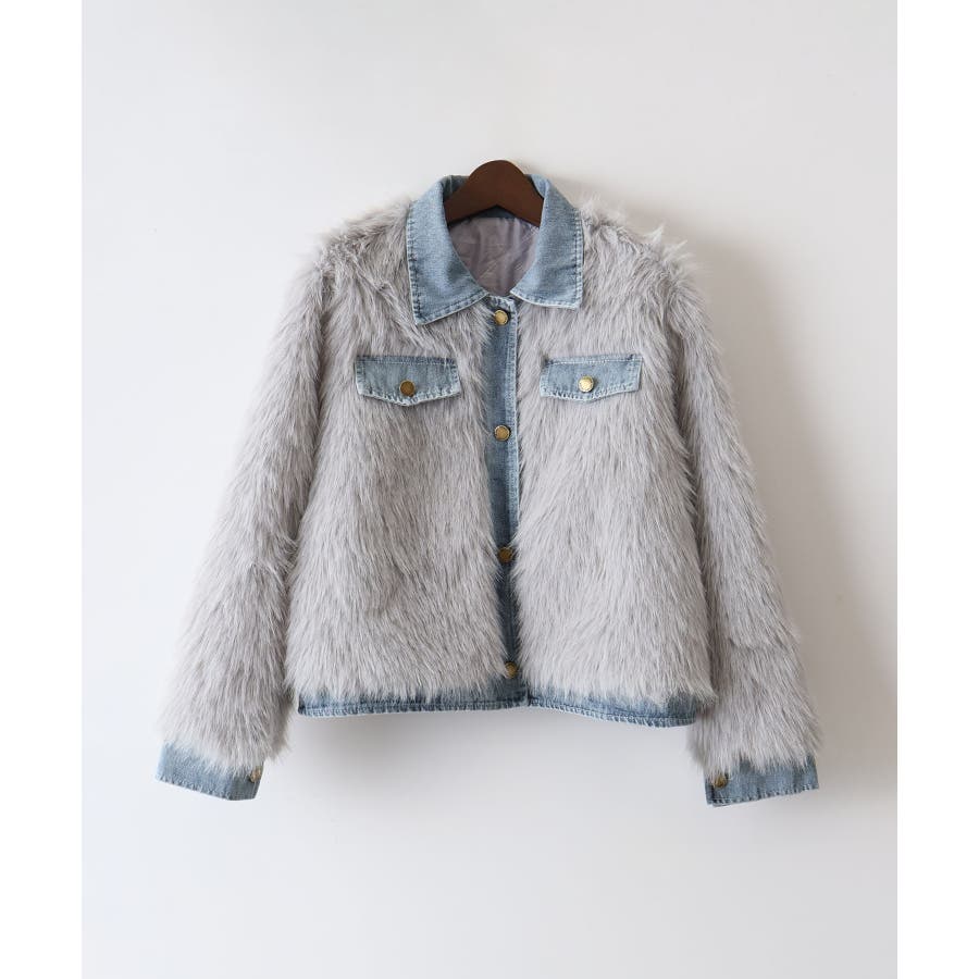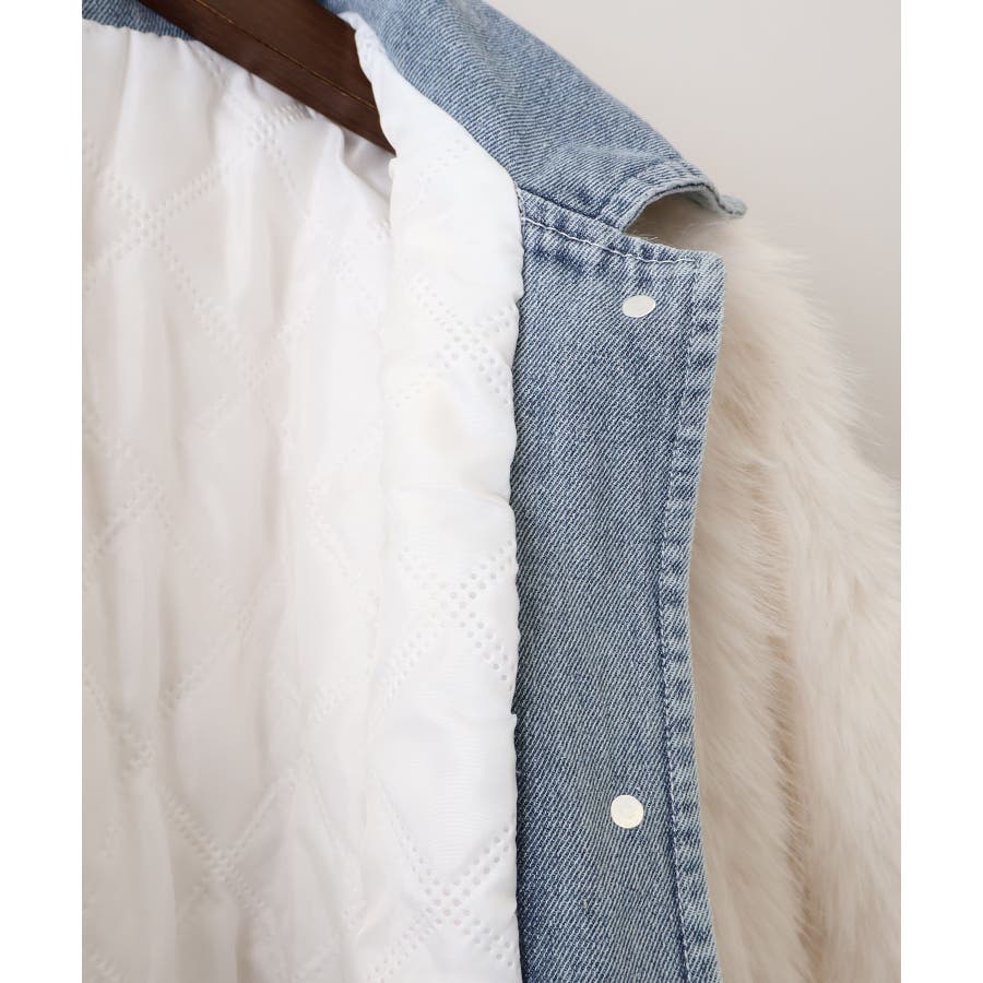 デニムジャケットにふわふわのフェイクファーを大胆にドッキングした、存在感抜群の切替ブルゾン。カジュアルなデニムと上品なファーが絶妙にマッチし、羽織るだけで“着映えコーデ”が完成します。