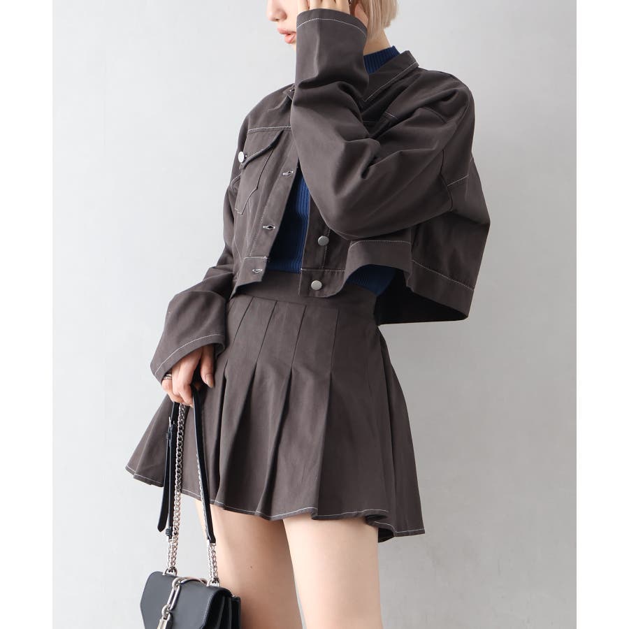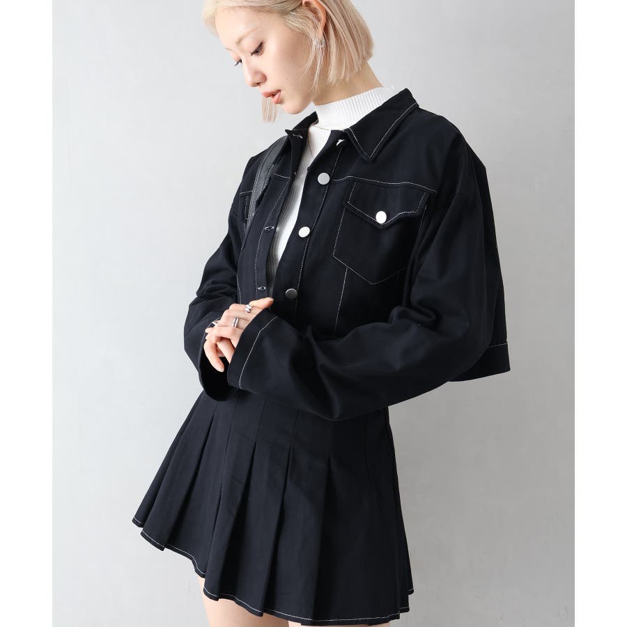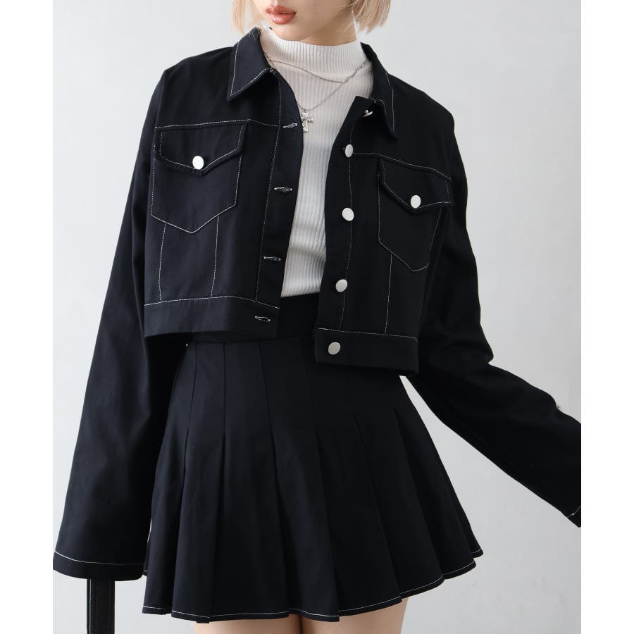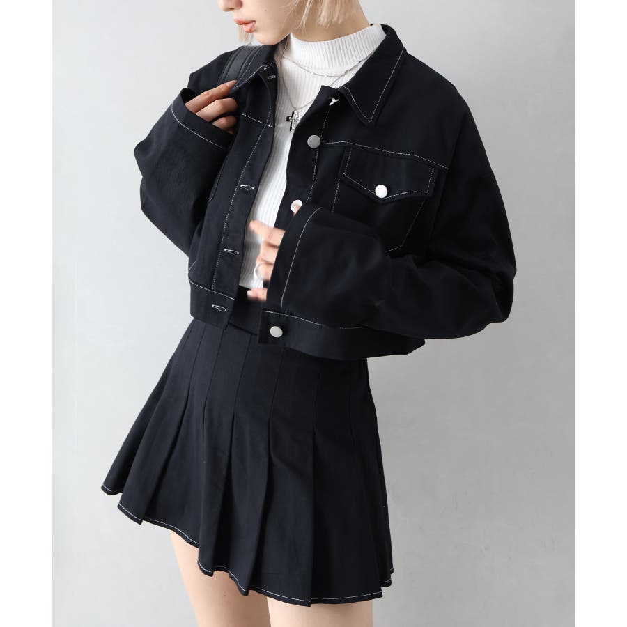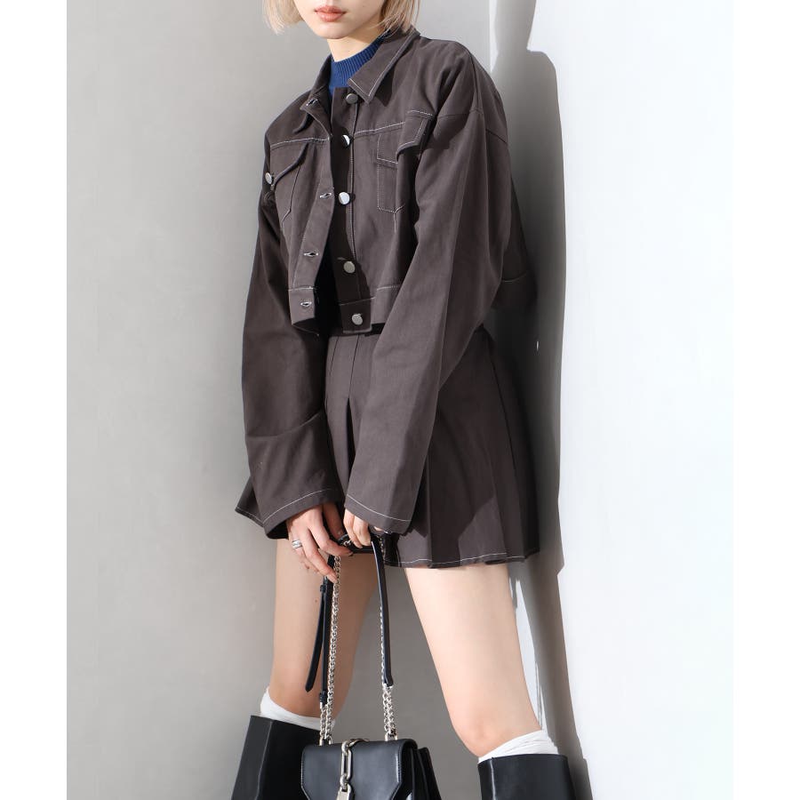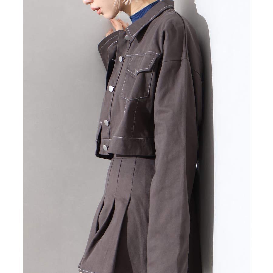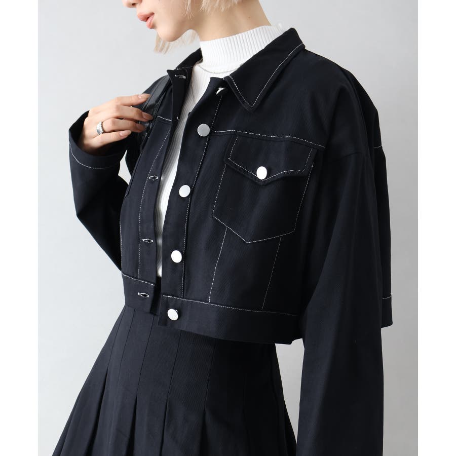 ショート丈ジャケットはツイル素材にステッチを効かせ、