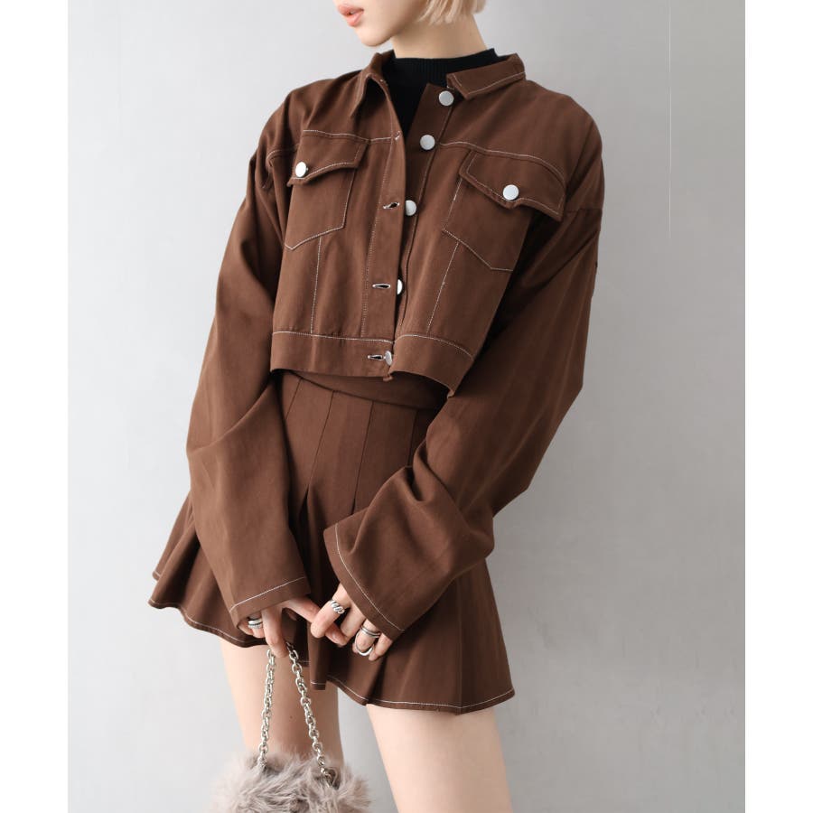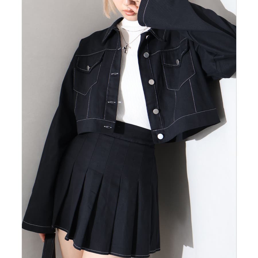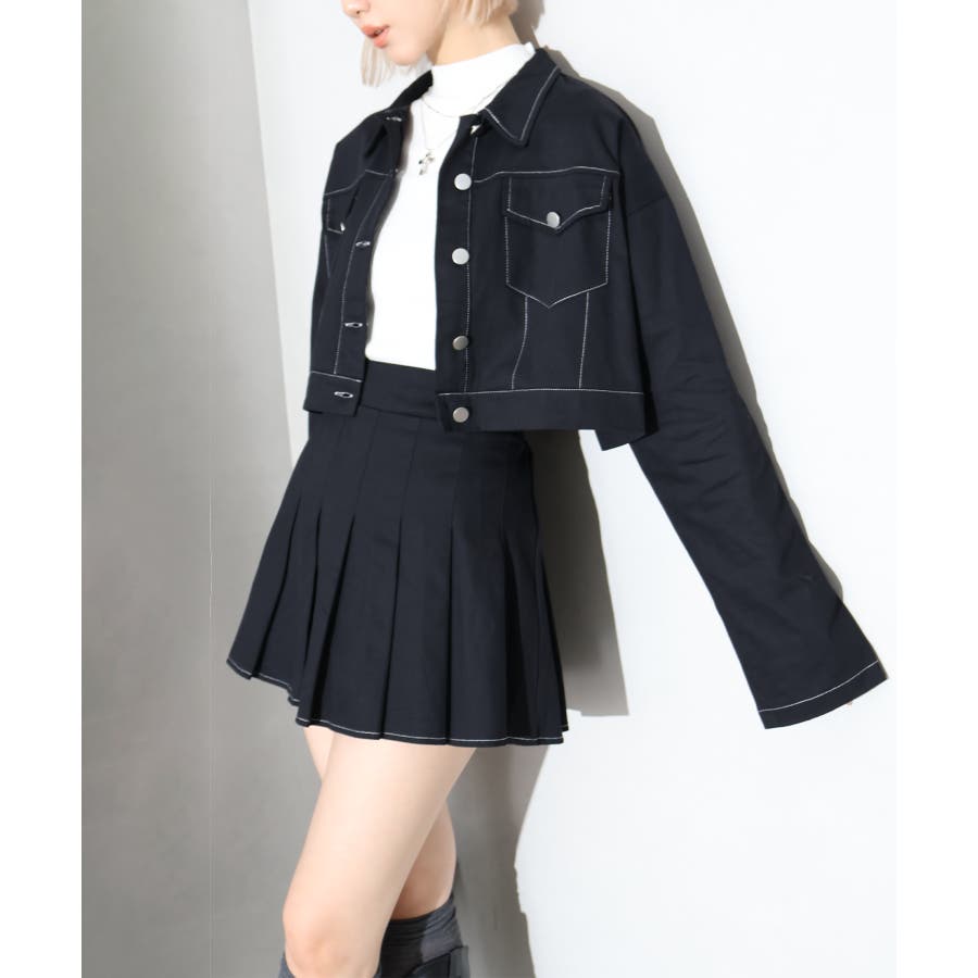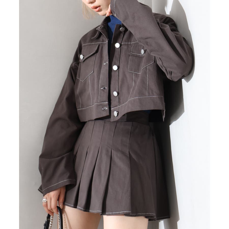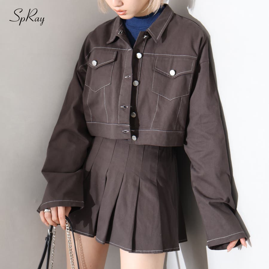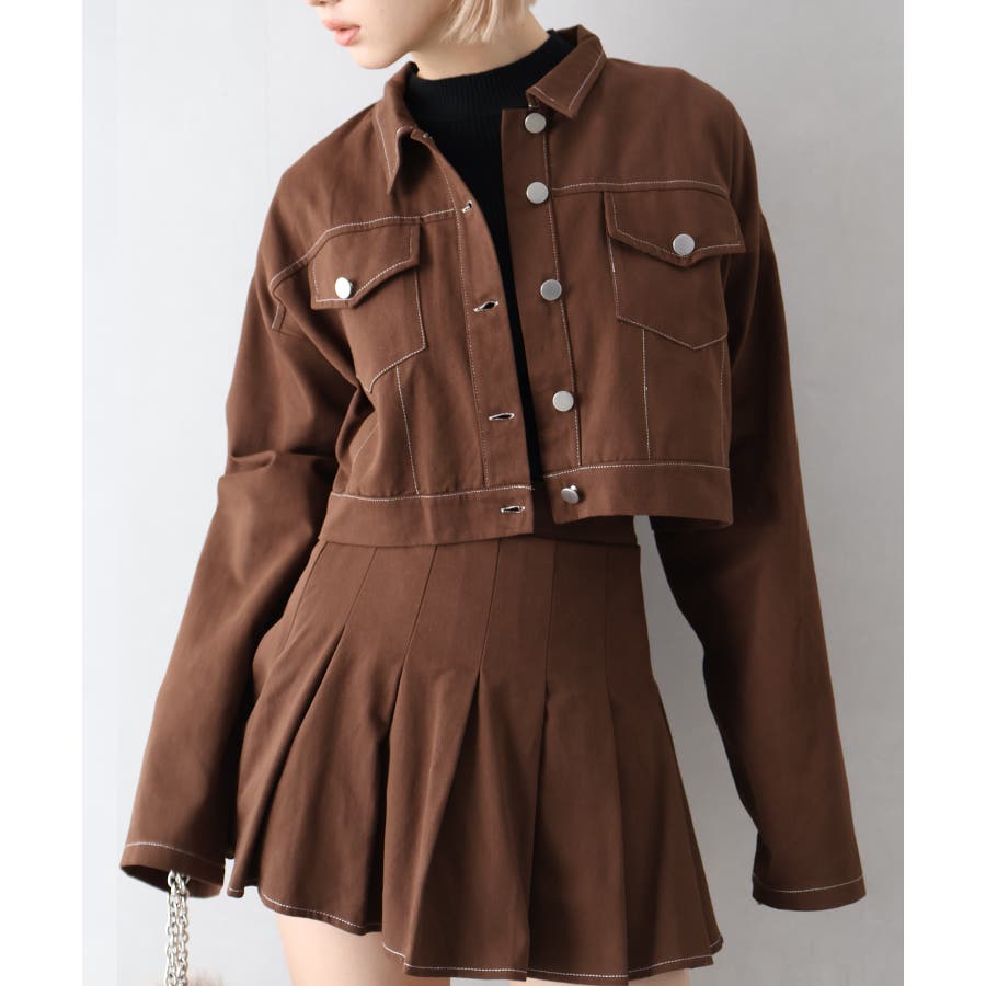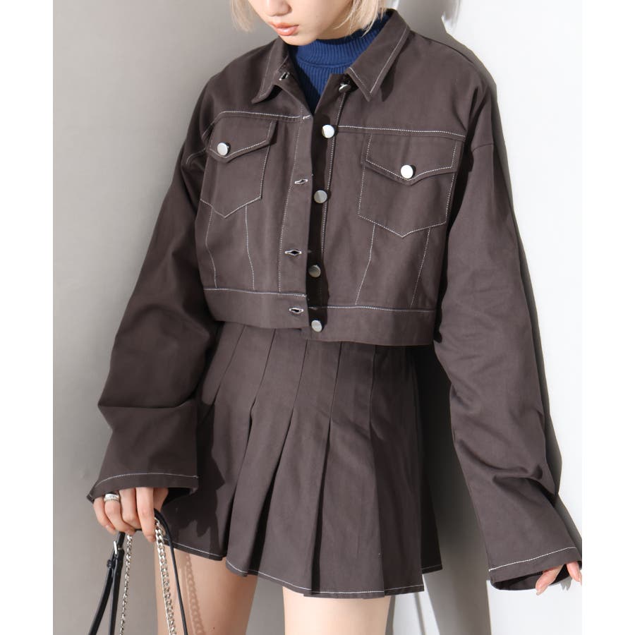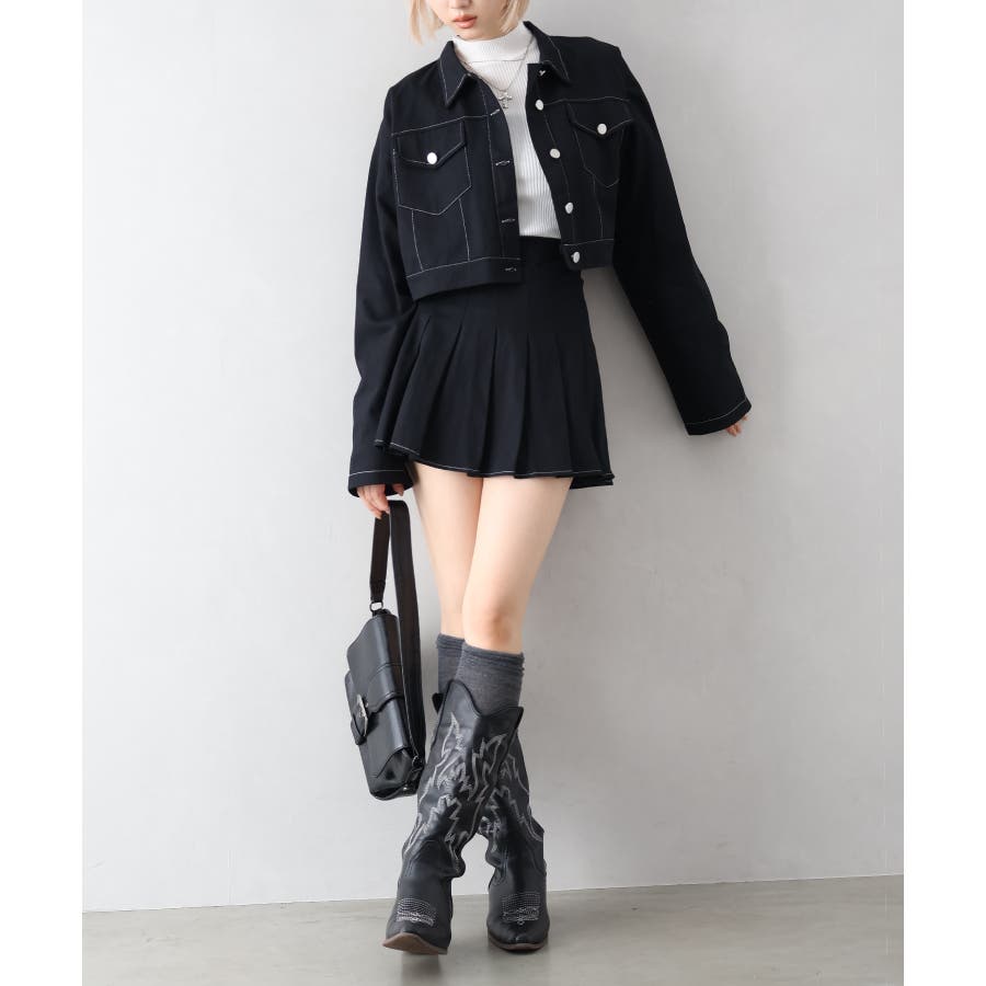 ショート丈ジャケットはツイル素材にステッチを効かせ、