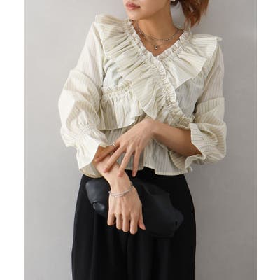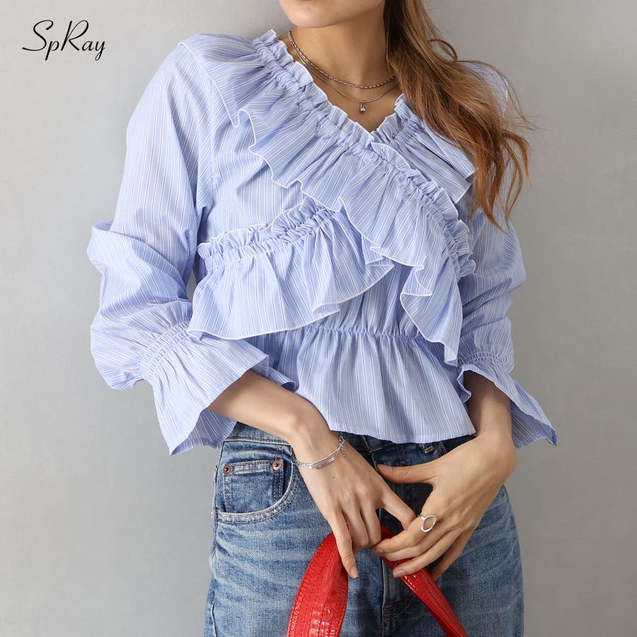 【SpRay ストライプクロスフリルブラウス】