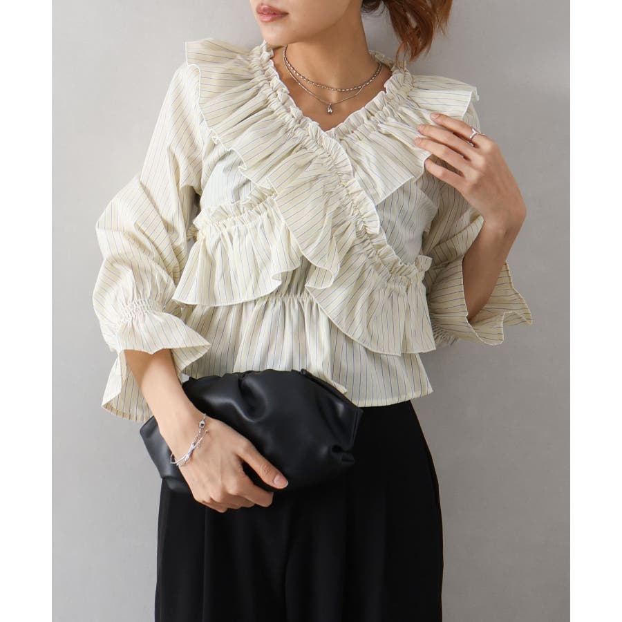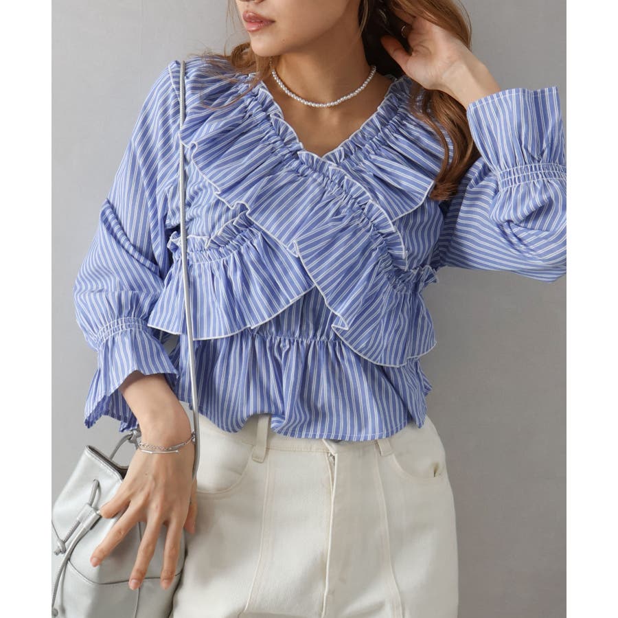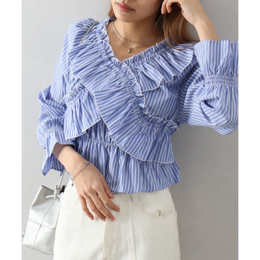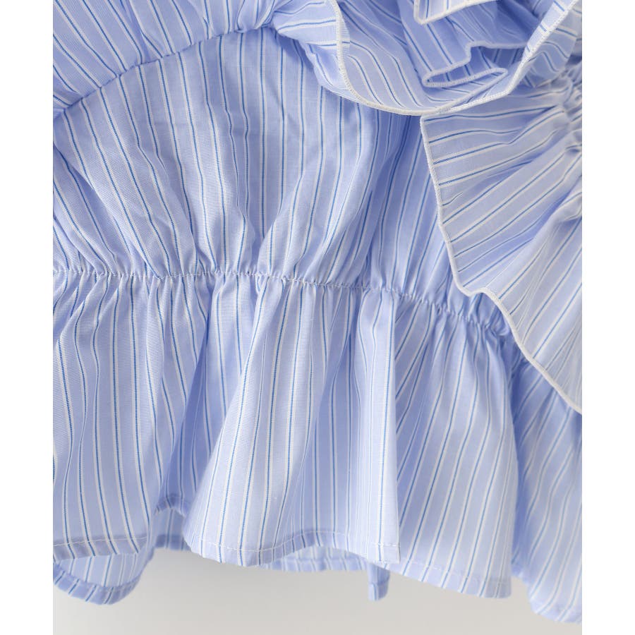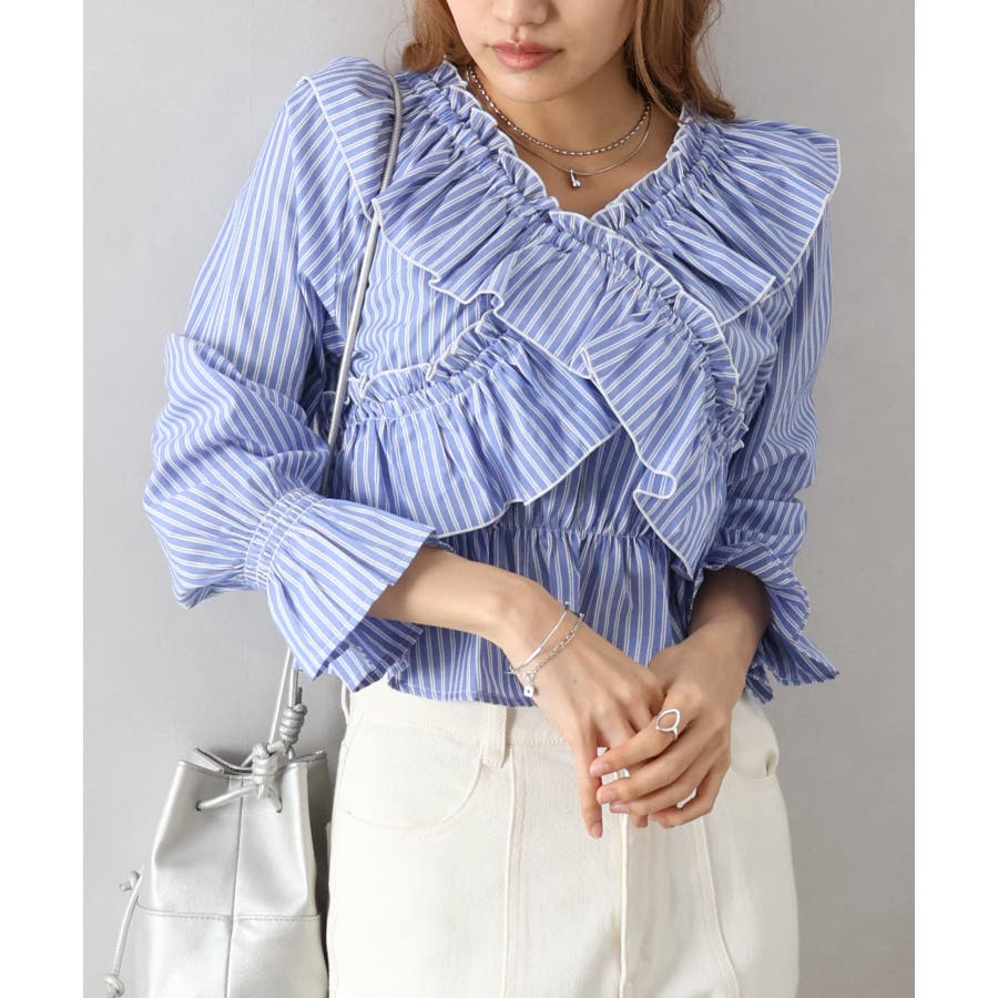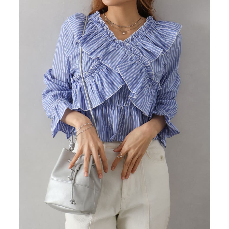 斜めにクロスするフリルデザインが印象的な、ストライプ柄ブラウス。