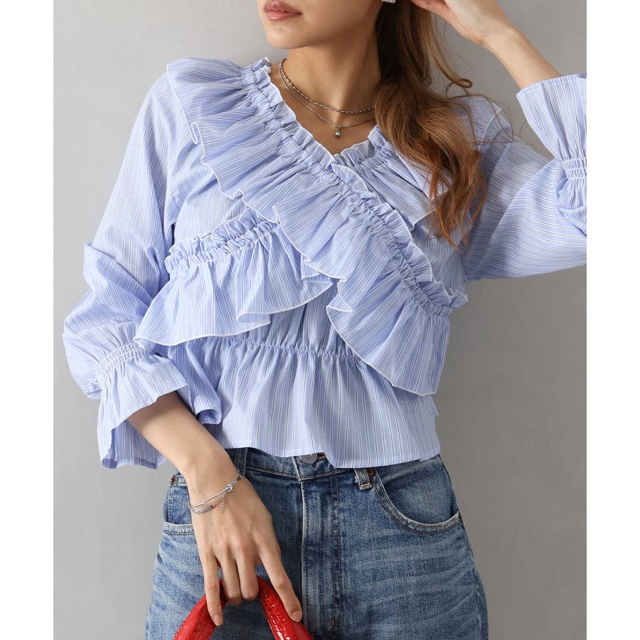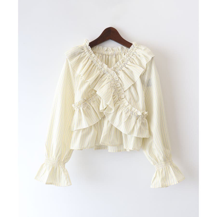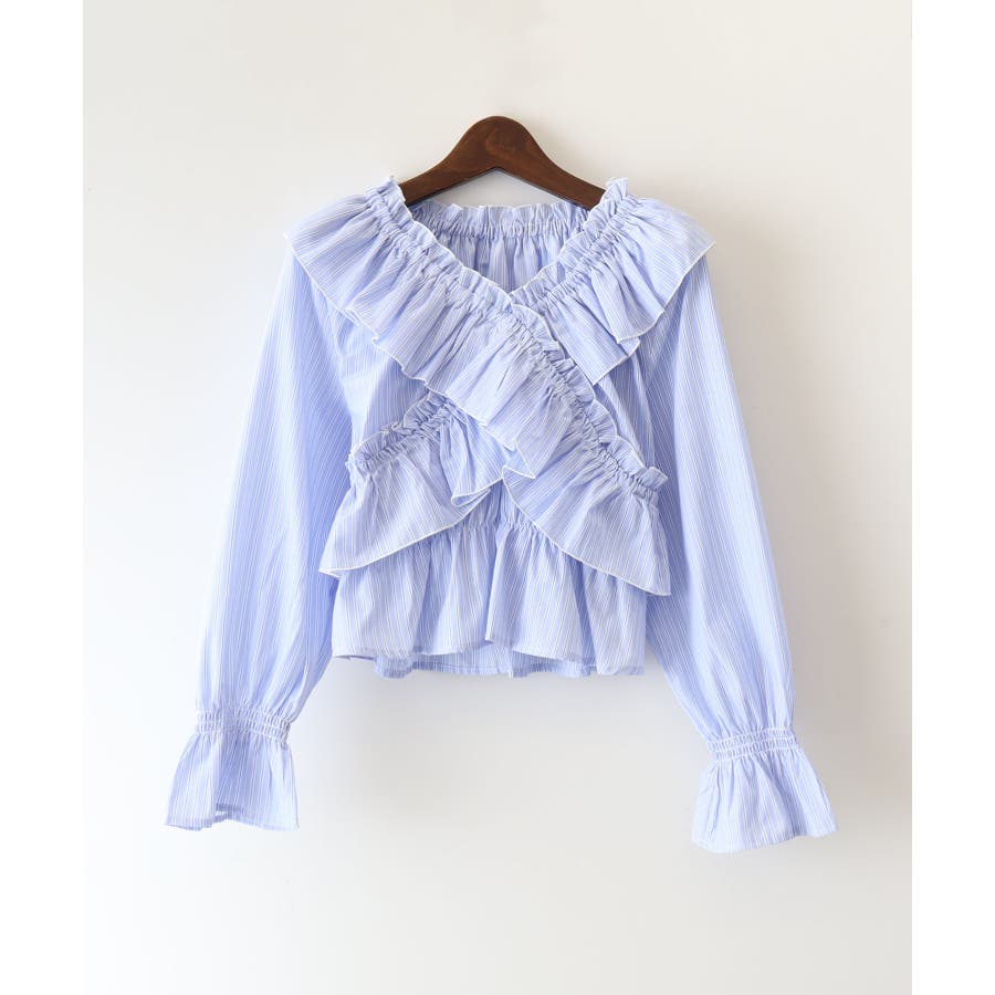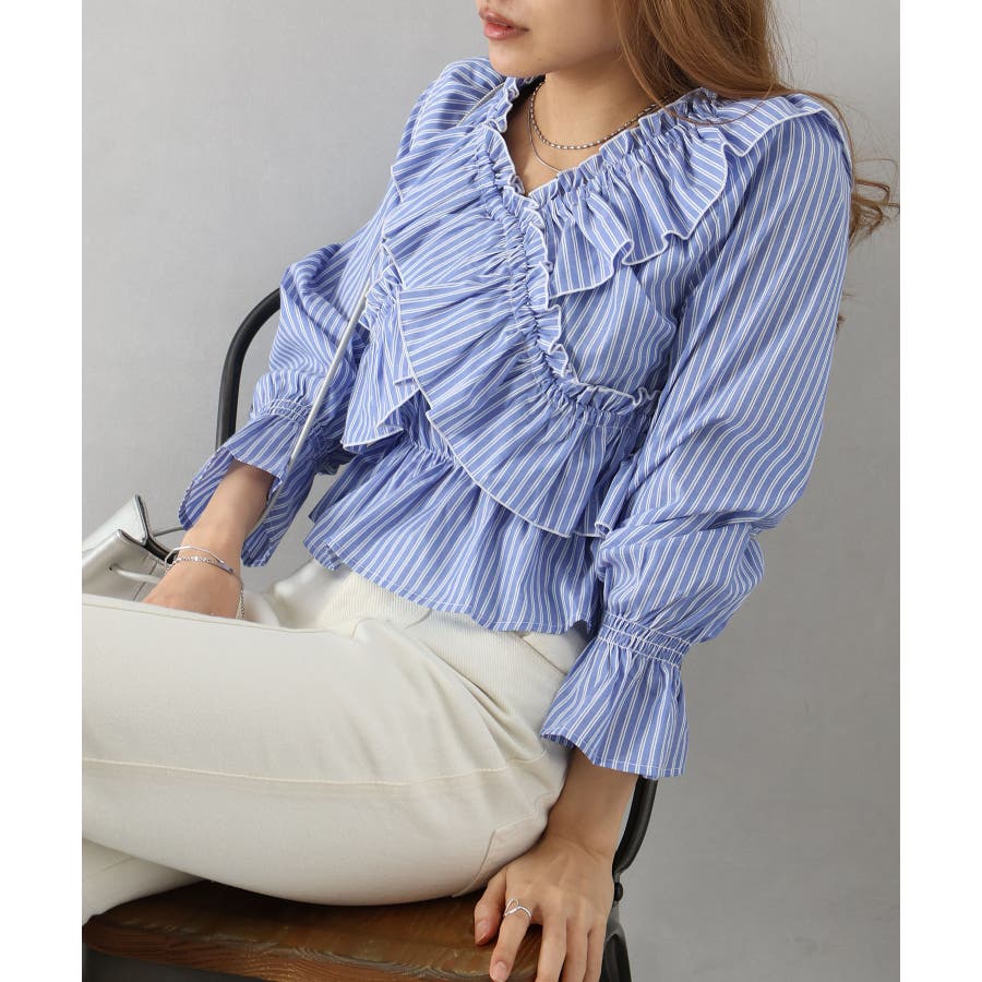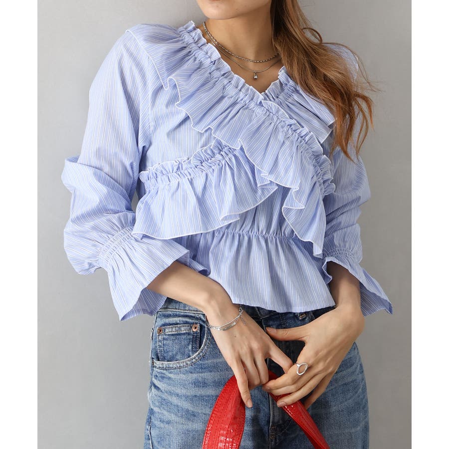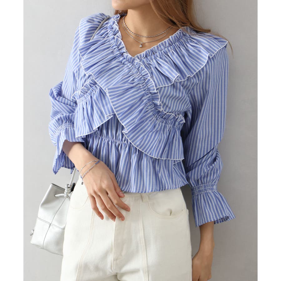 斜めにクロスするフリルデザインが印象的な、ストライプ柄ブラウス。