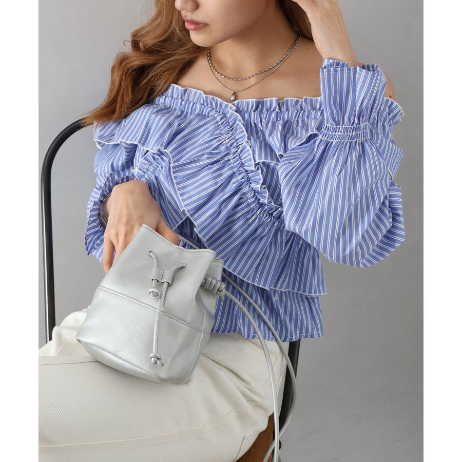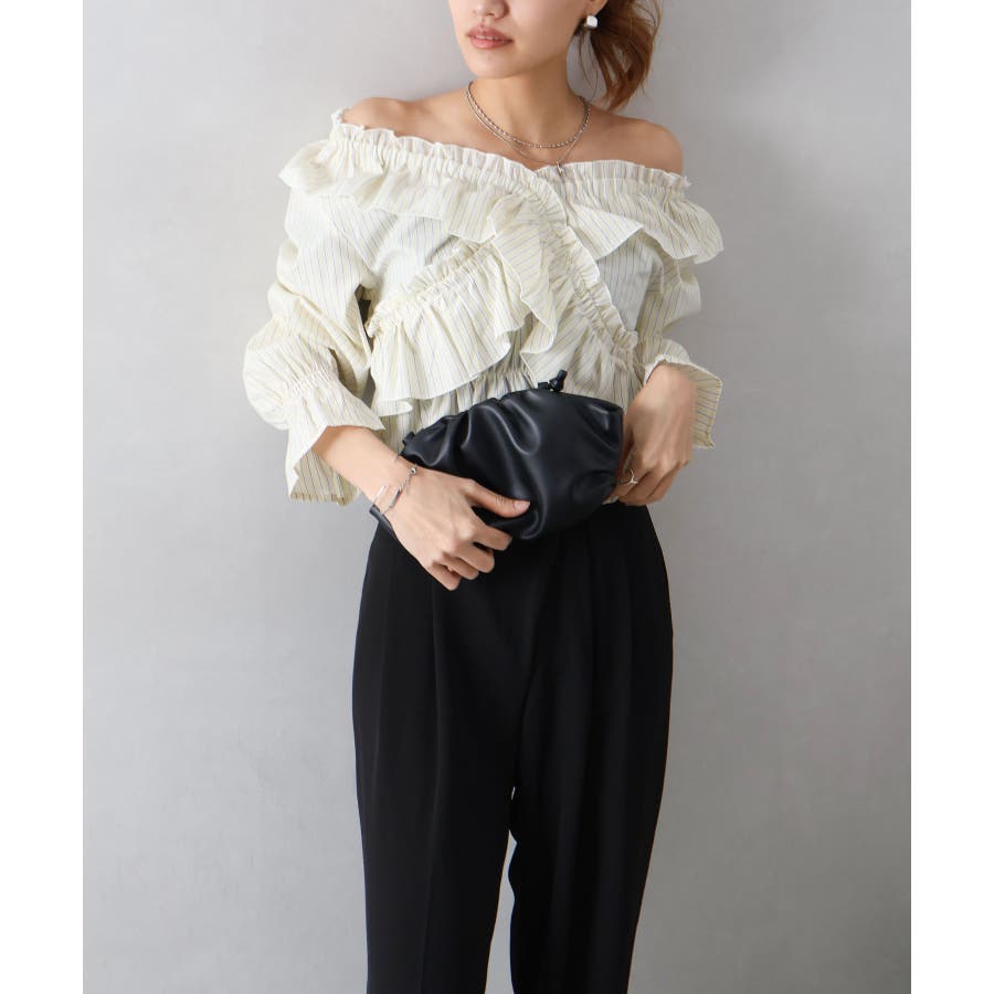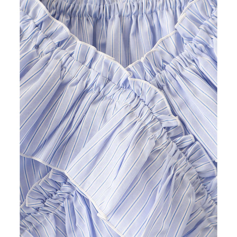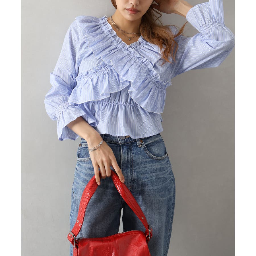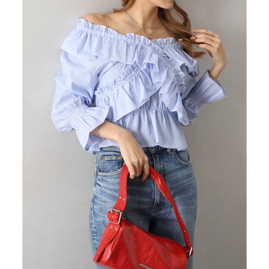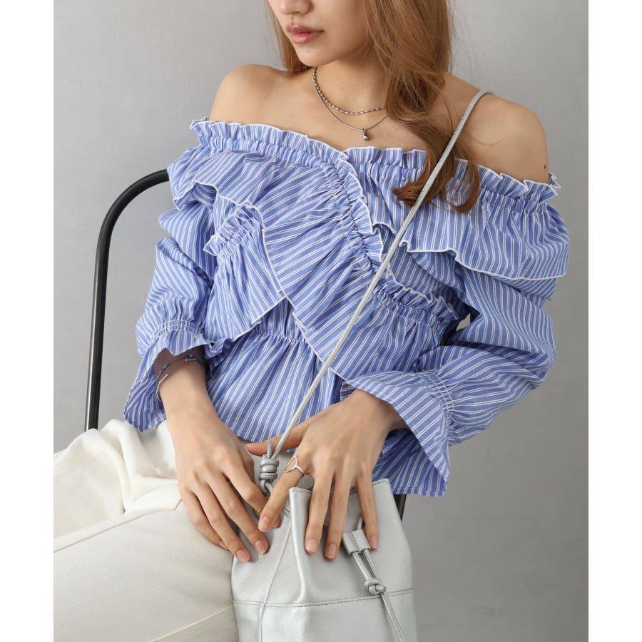 斜めにクロスするフリルデザインが印象的な、ストライプ柄ブラウス。