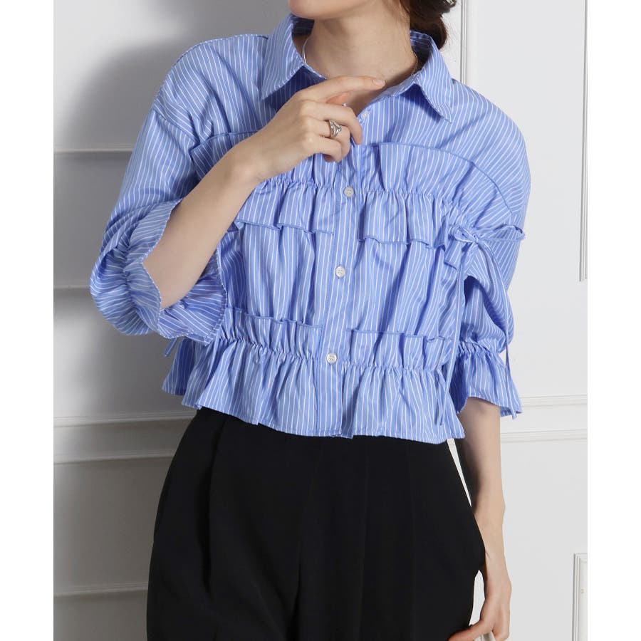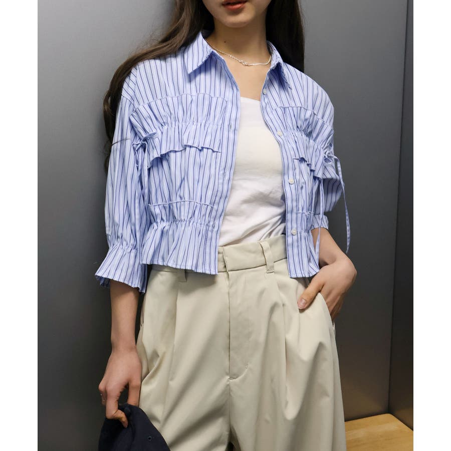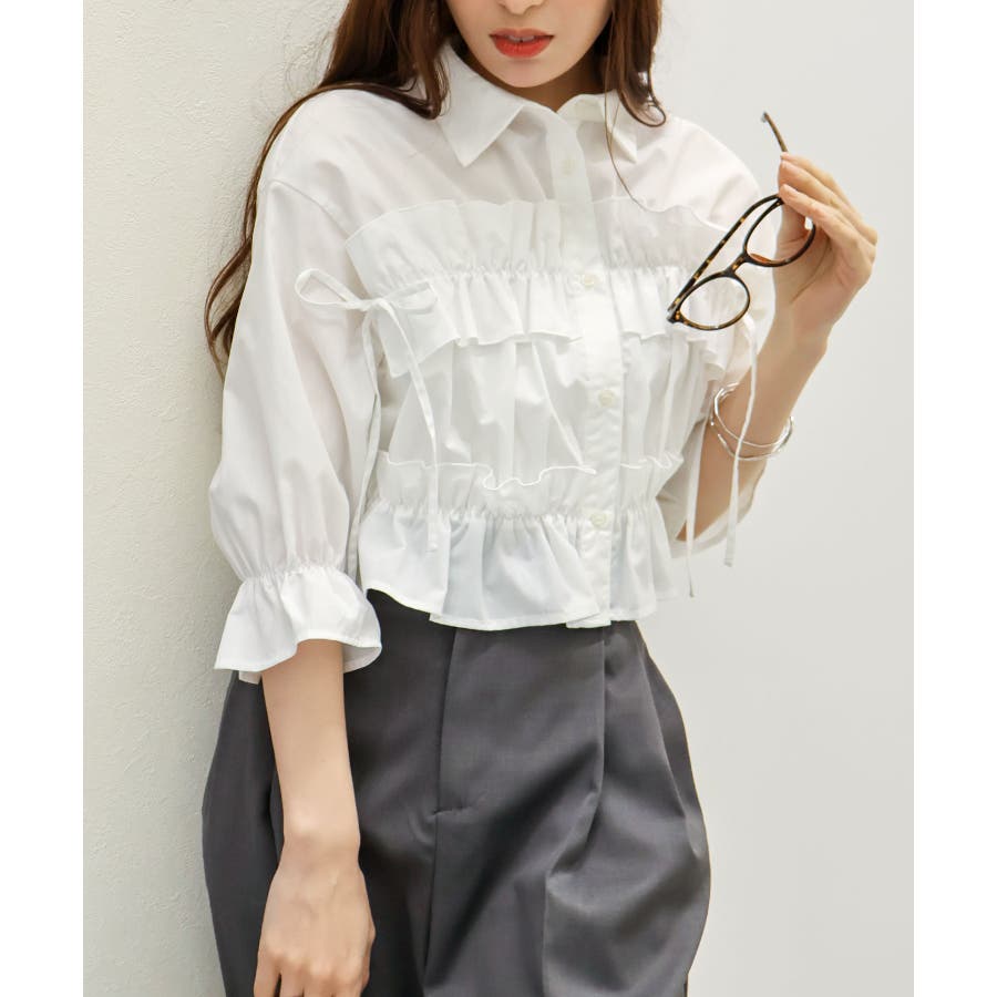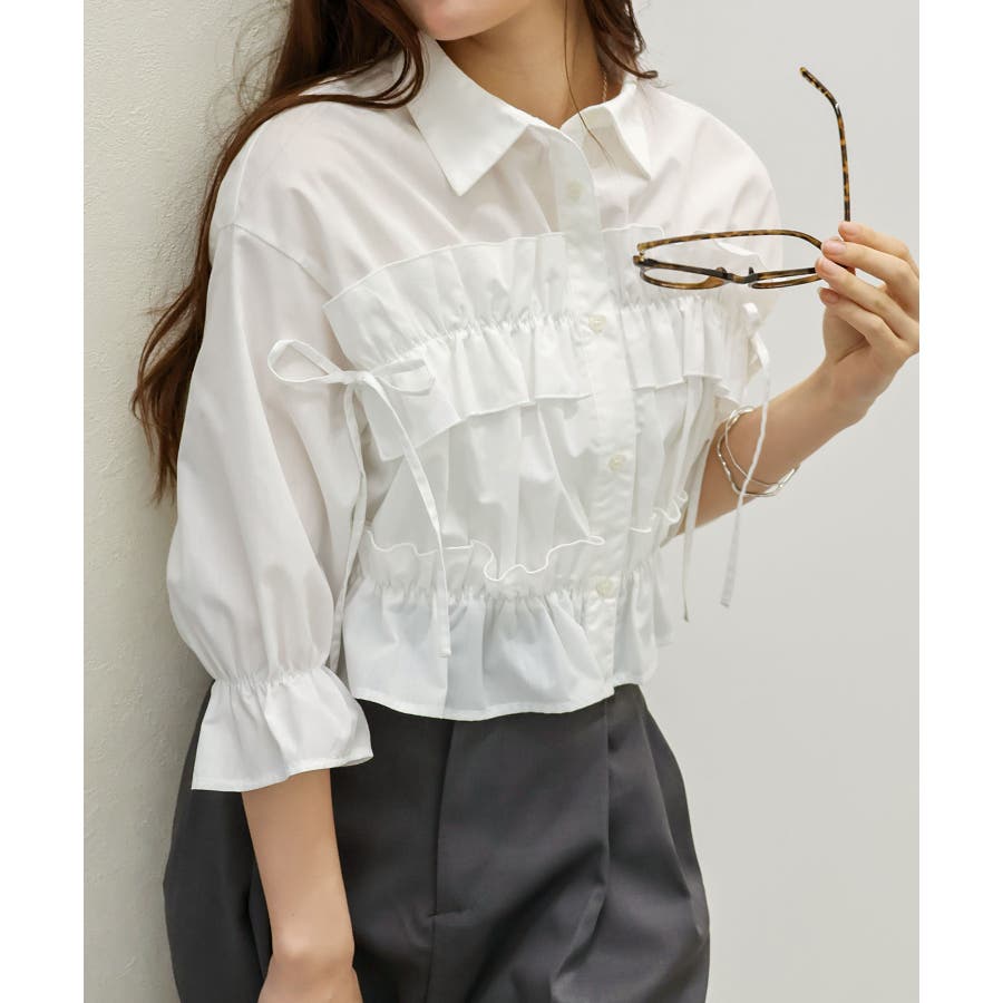 立体感のあるフリルデザインが目を惹く、五分袖のクロップドシャツ。