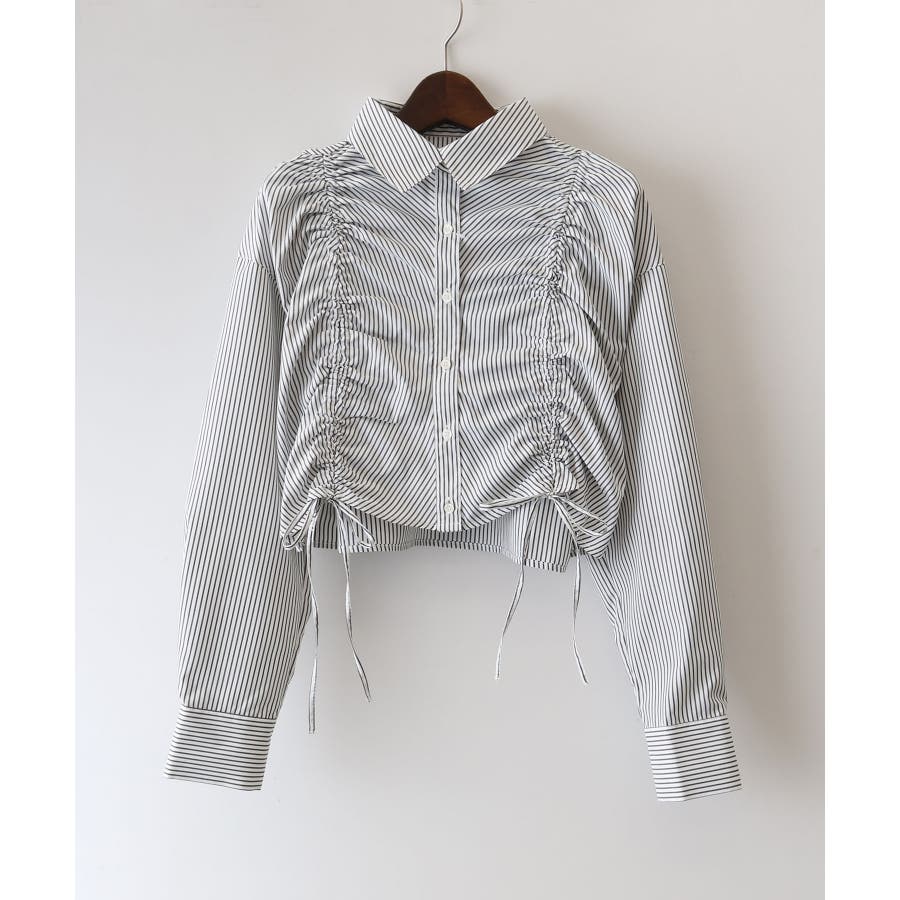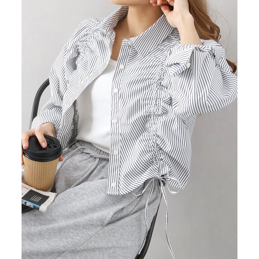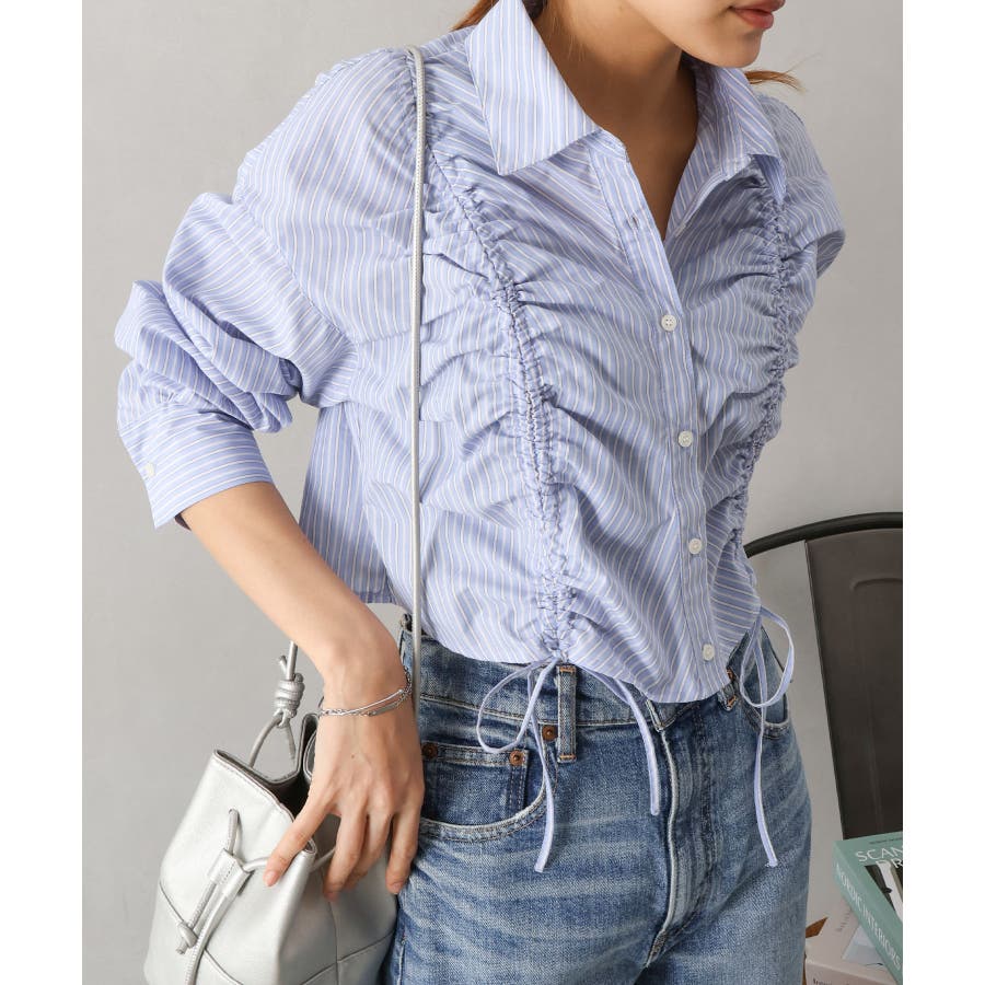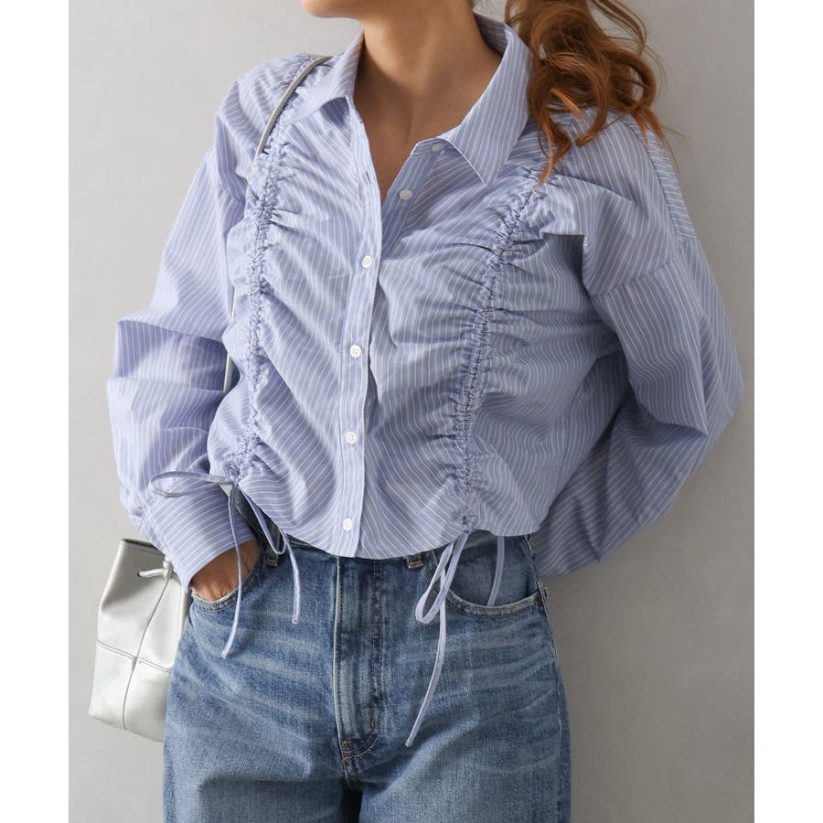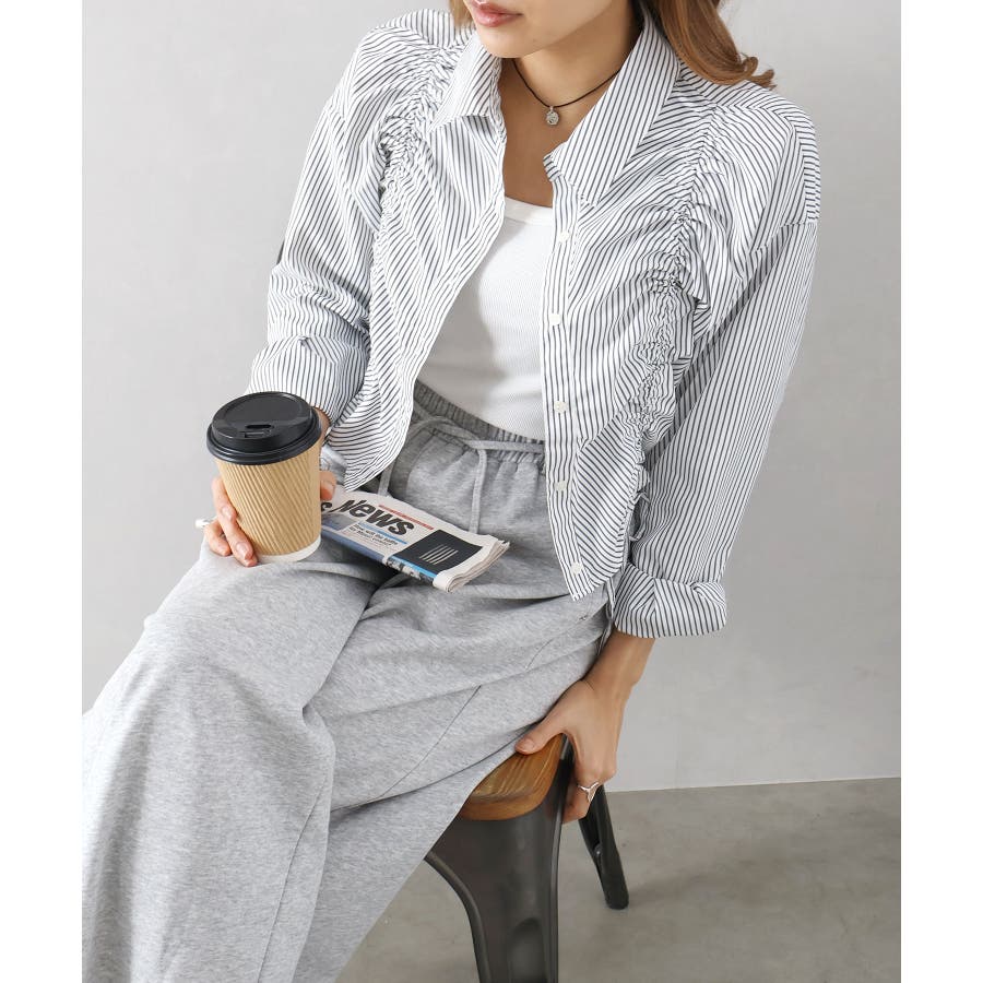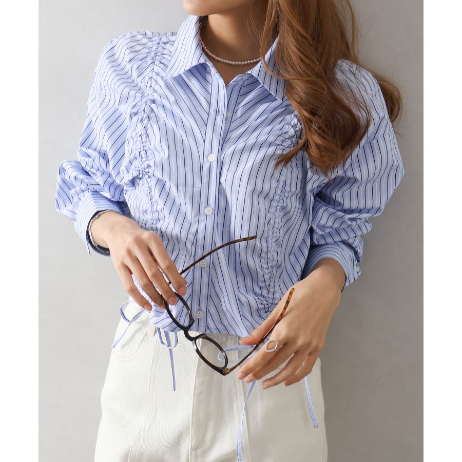 フロントに施したシャーリングデザインが目を惹く、トレンド感たっぷりのストライプシャツ。