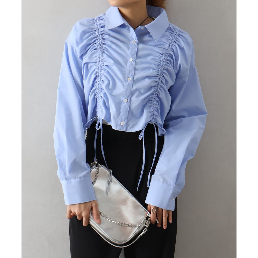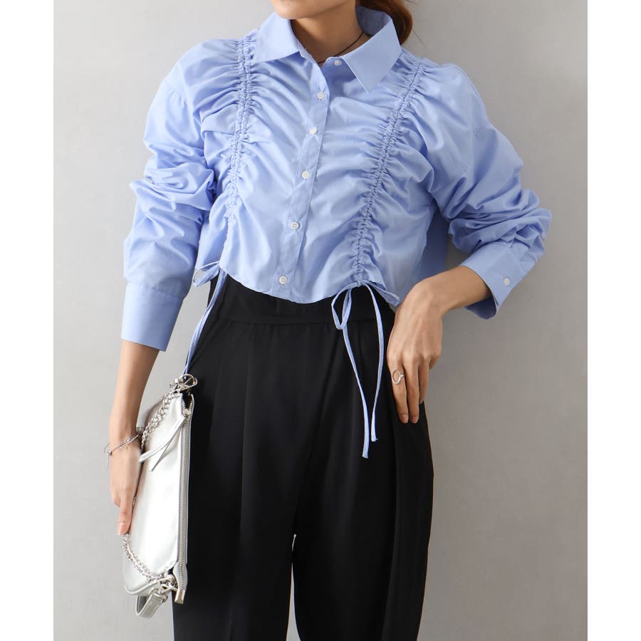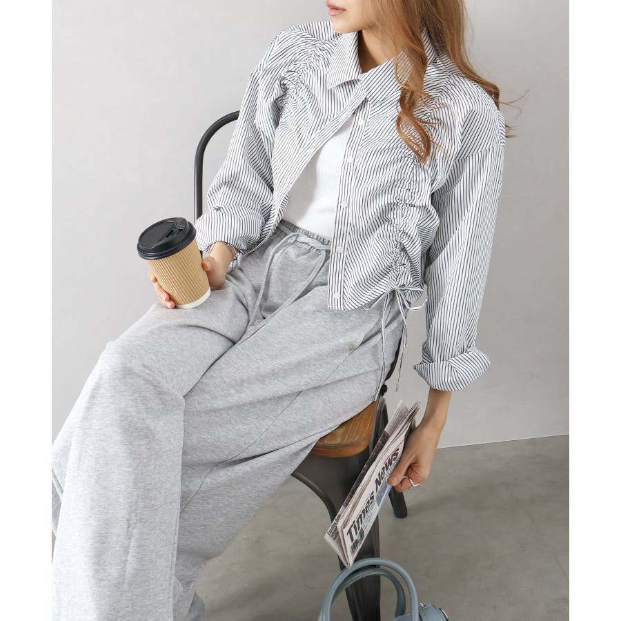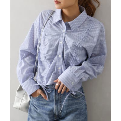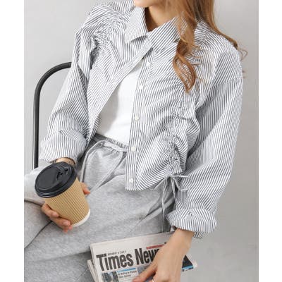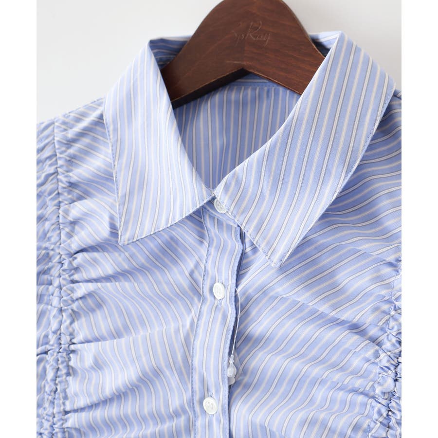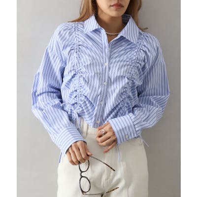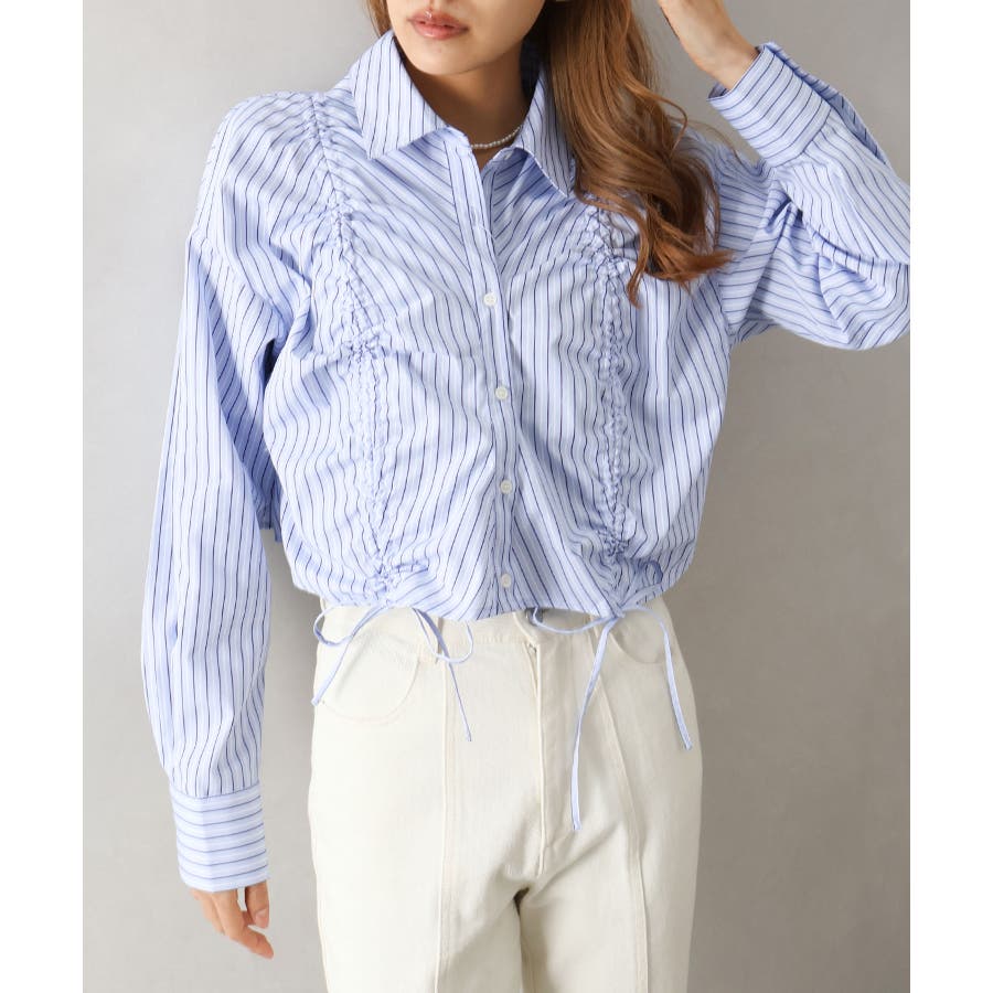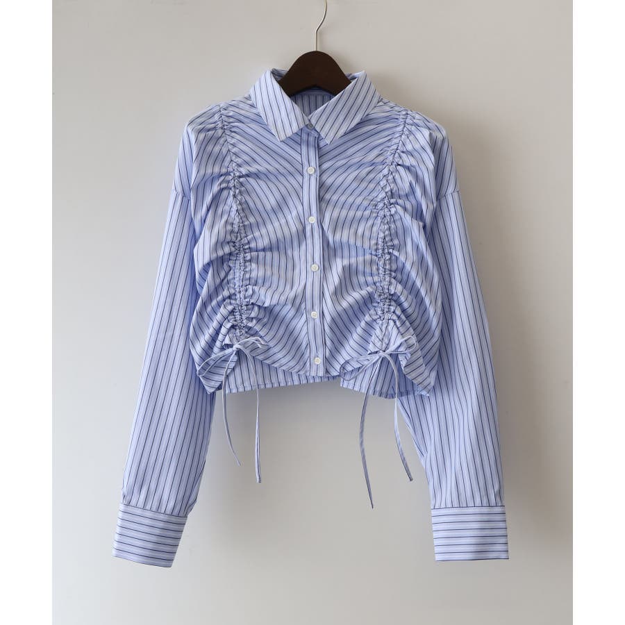 フロントに施したシャーリングデザインが目を惹く、トレンド感たっぷりのストライプシャツ。