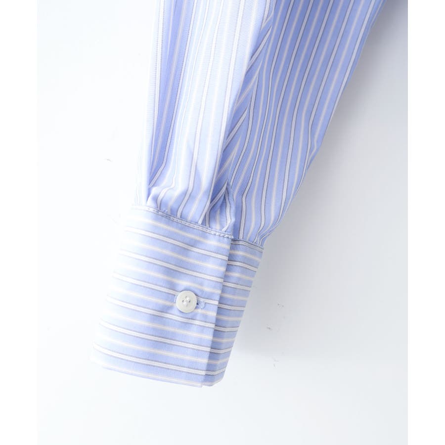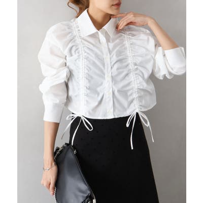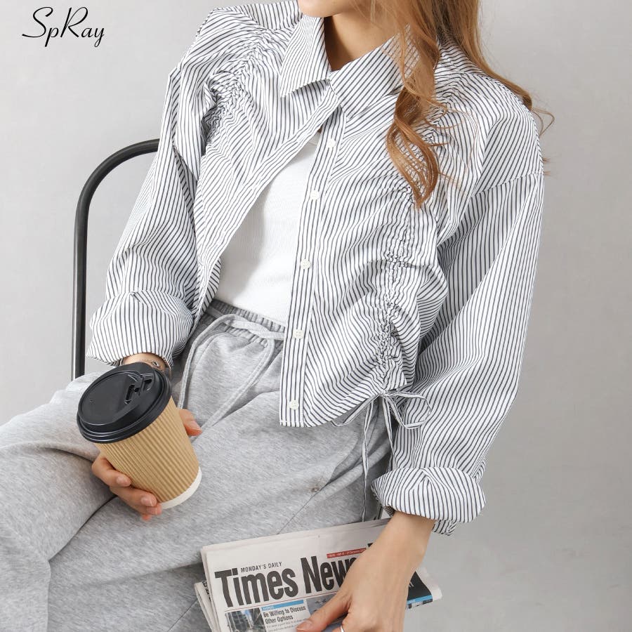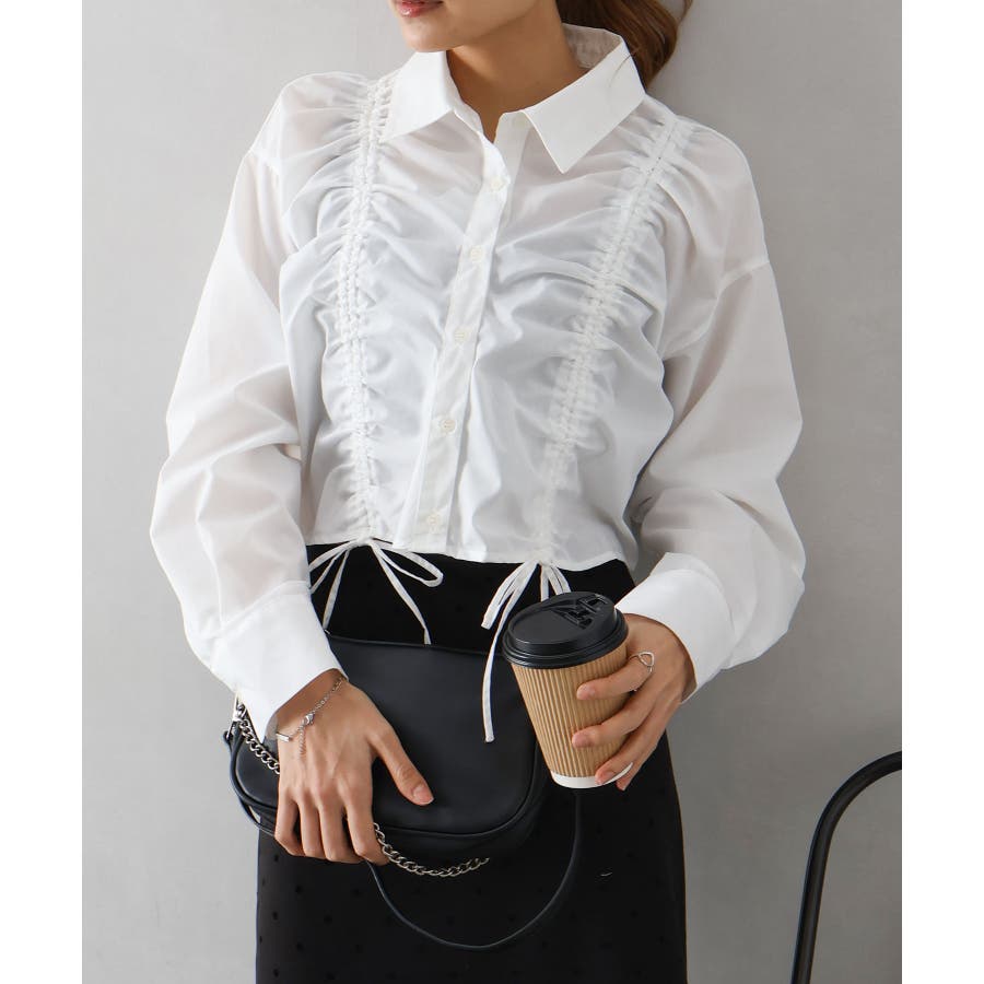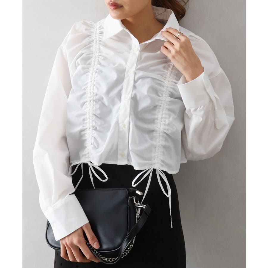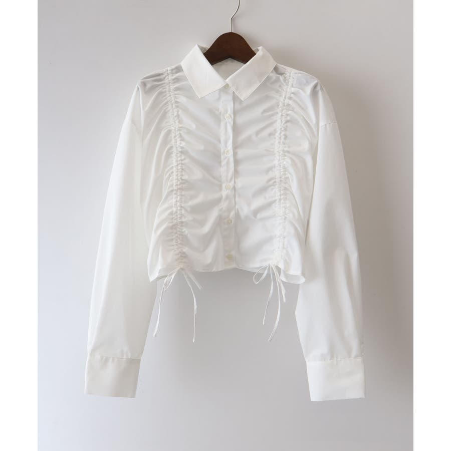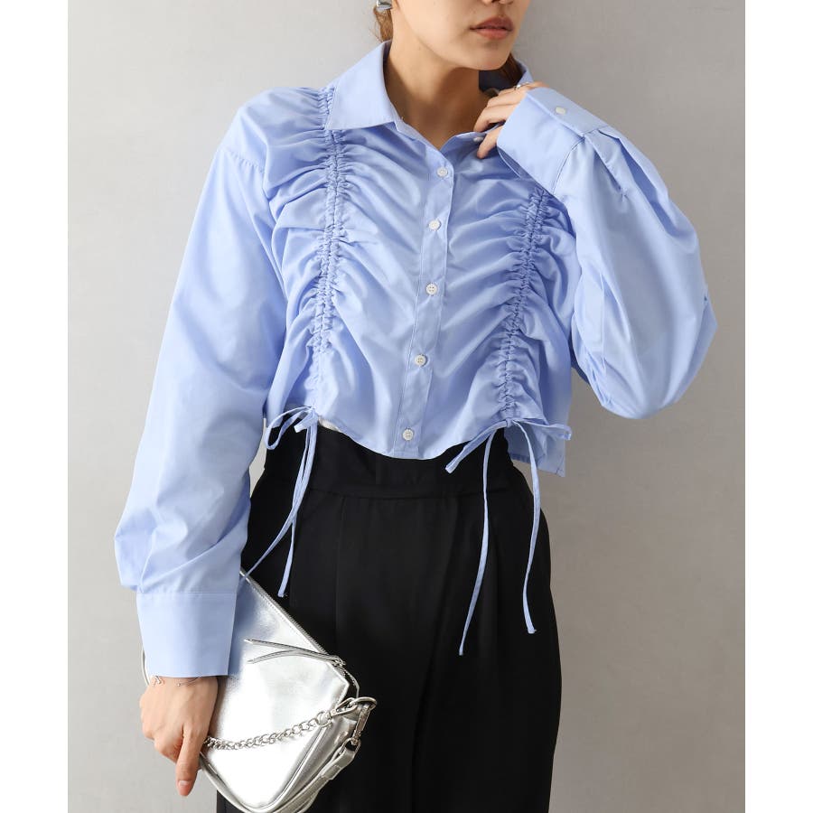 フロントに施したシャーリングデザインが目を惹く、トレンド感たっぷりのストライプシャツ。