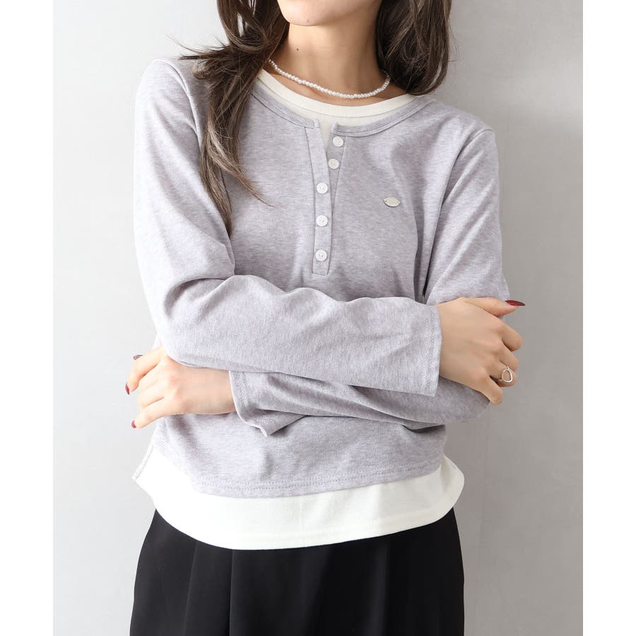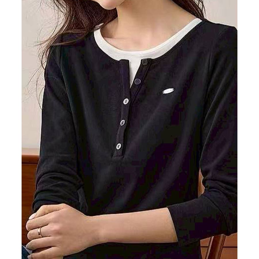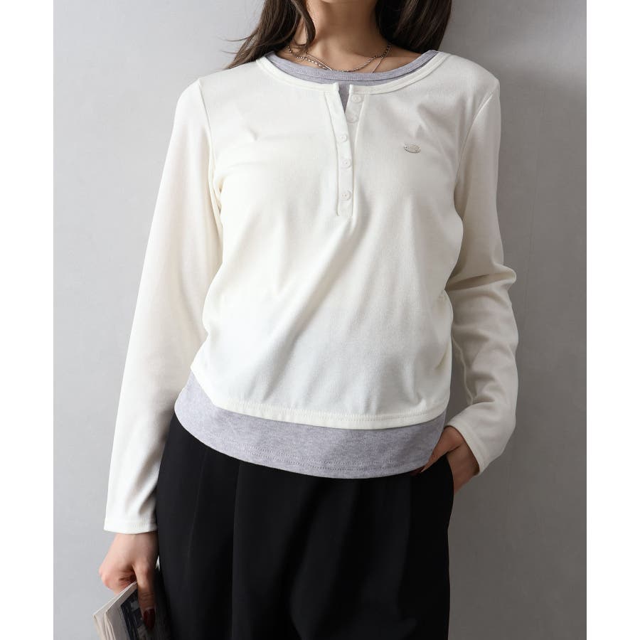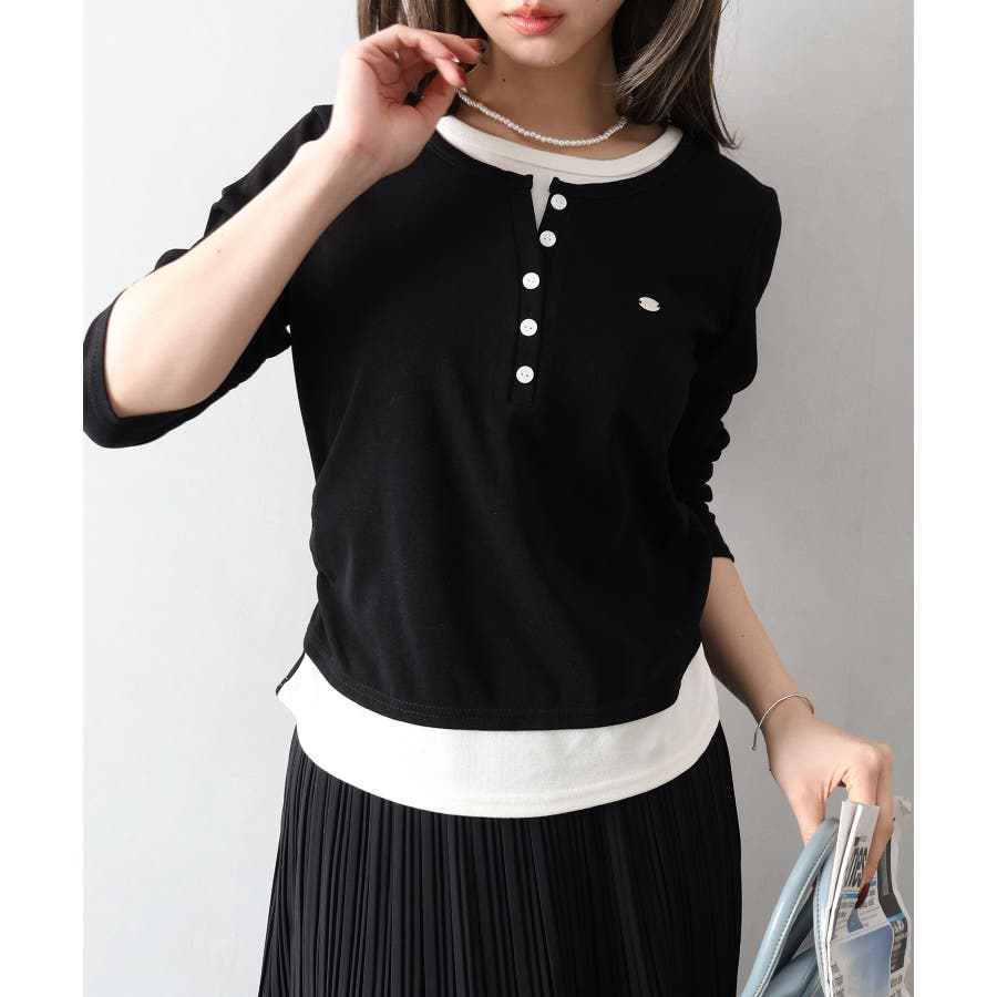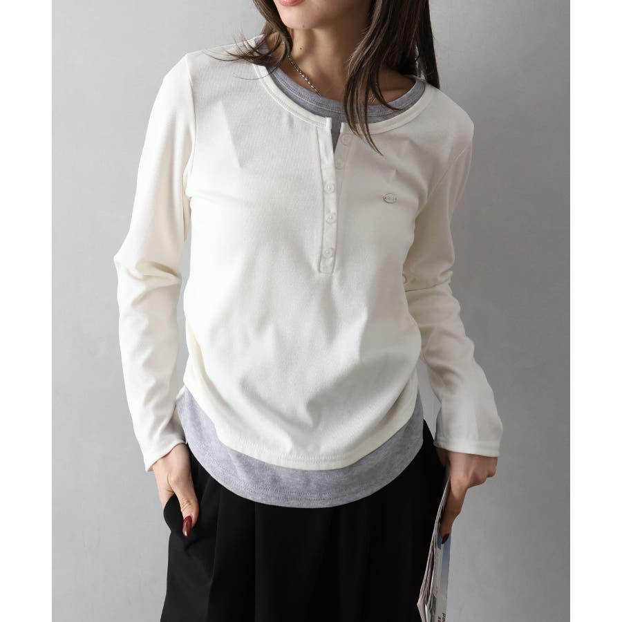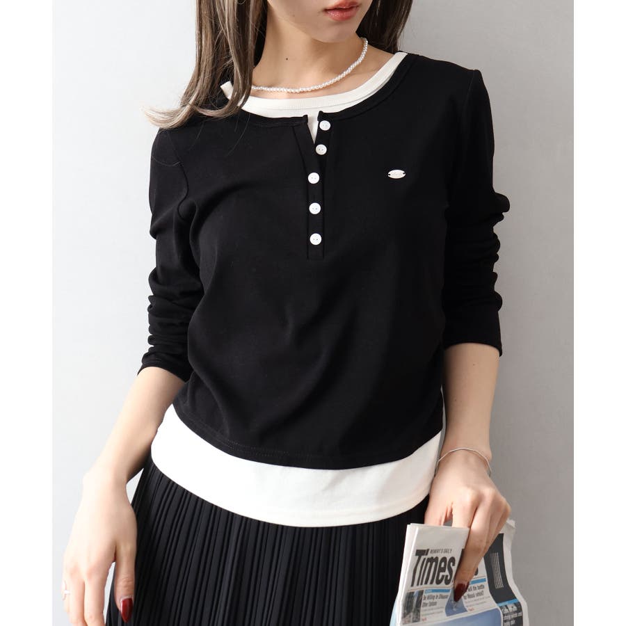 配色デザインが目を惹く、ヘンリーネックのフェイクレイヤードトップス。