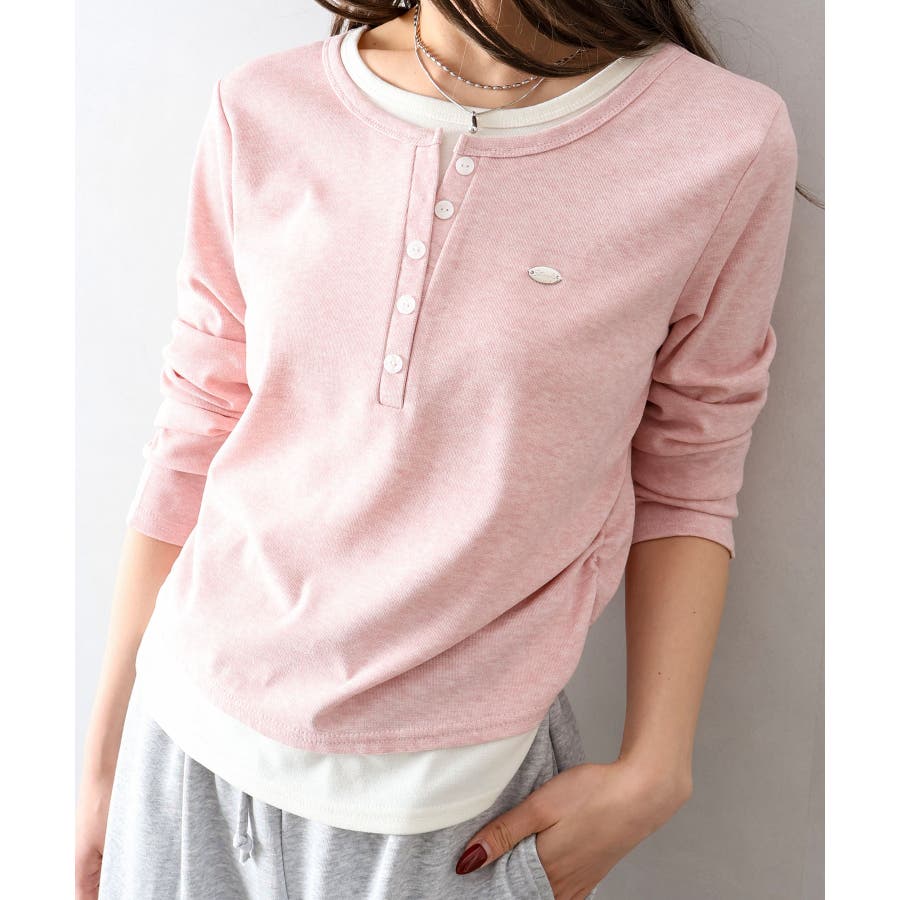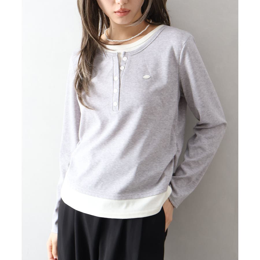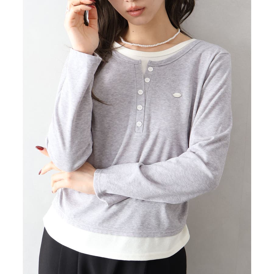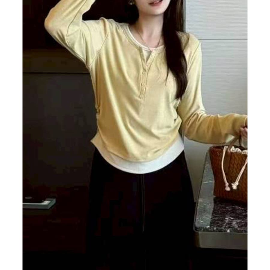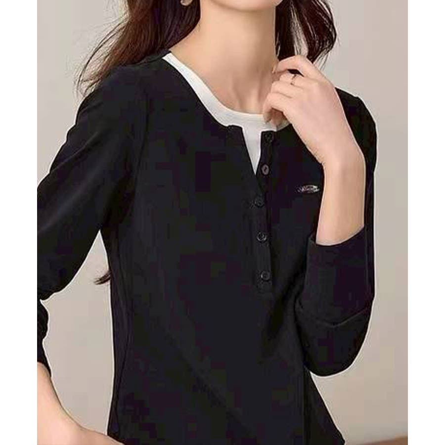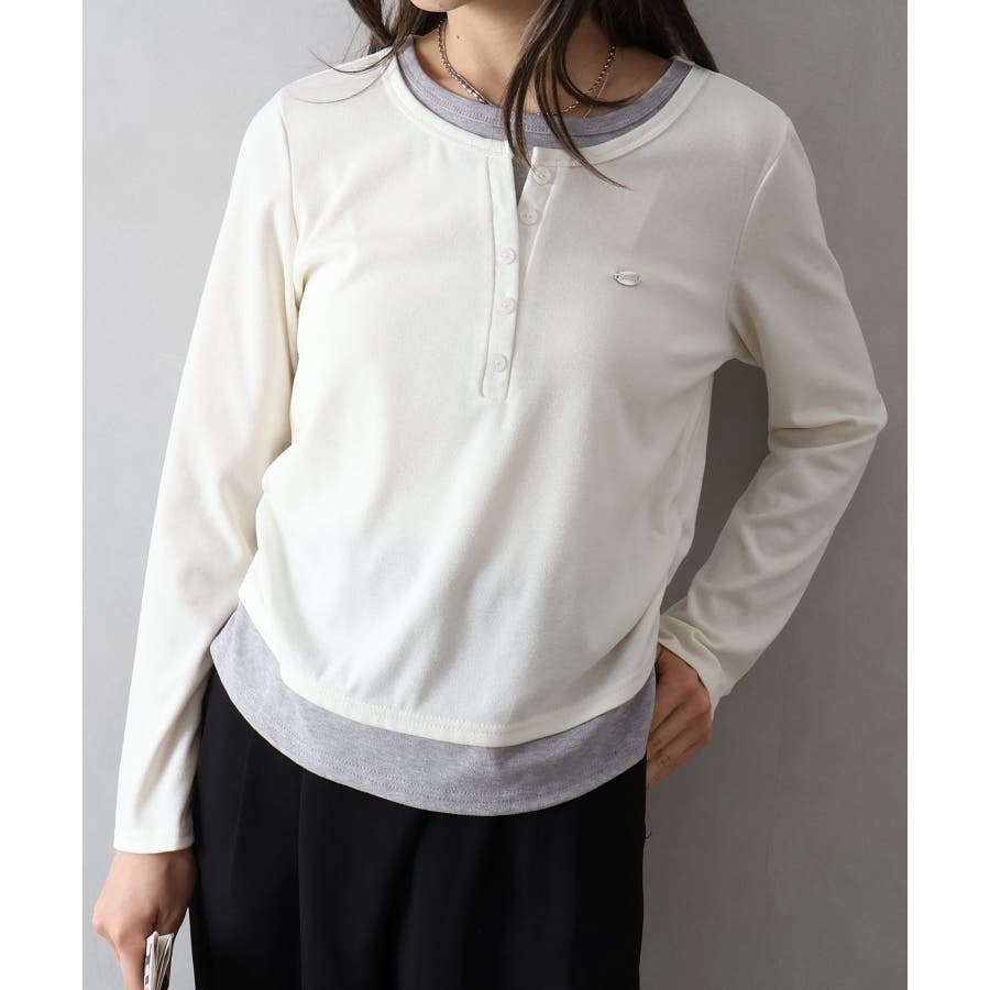 配色デザインが目を惹く、ヘンリーネックのフェイクレイヤードトップス。